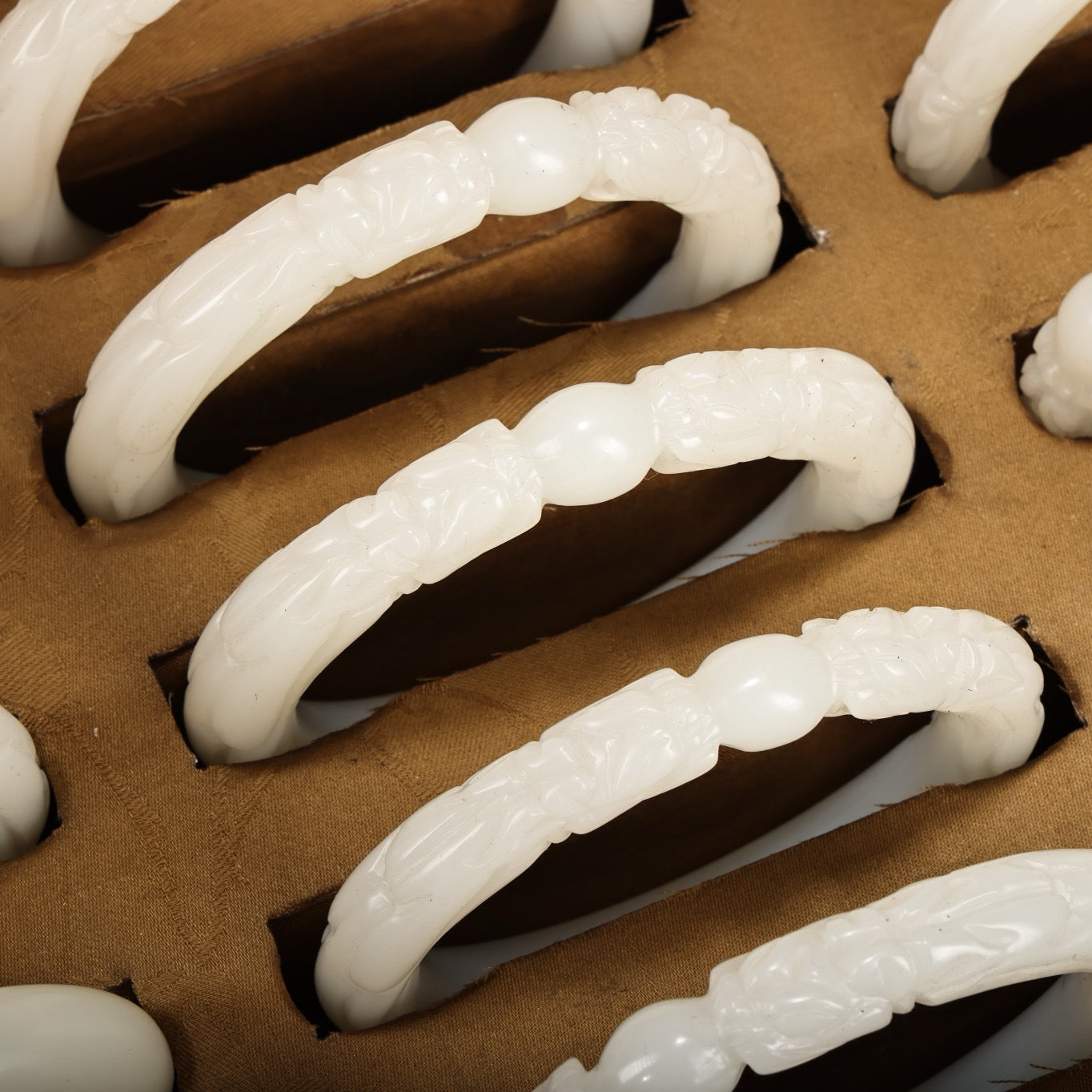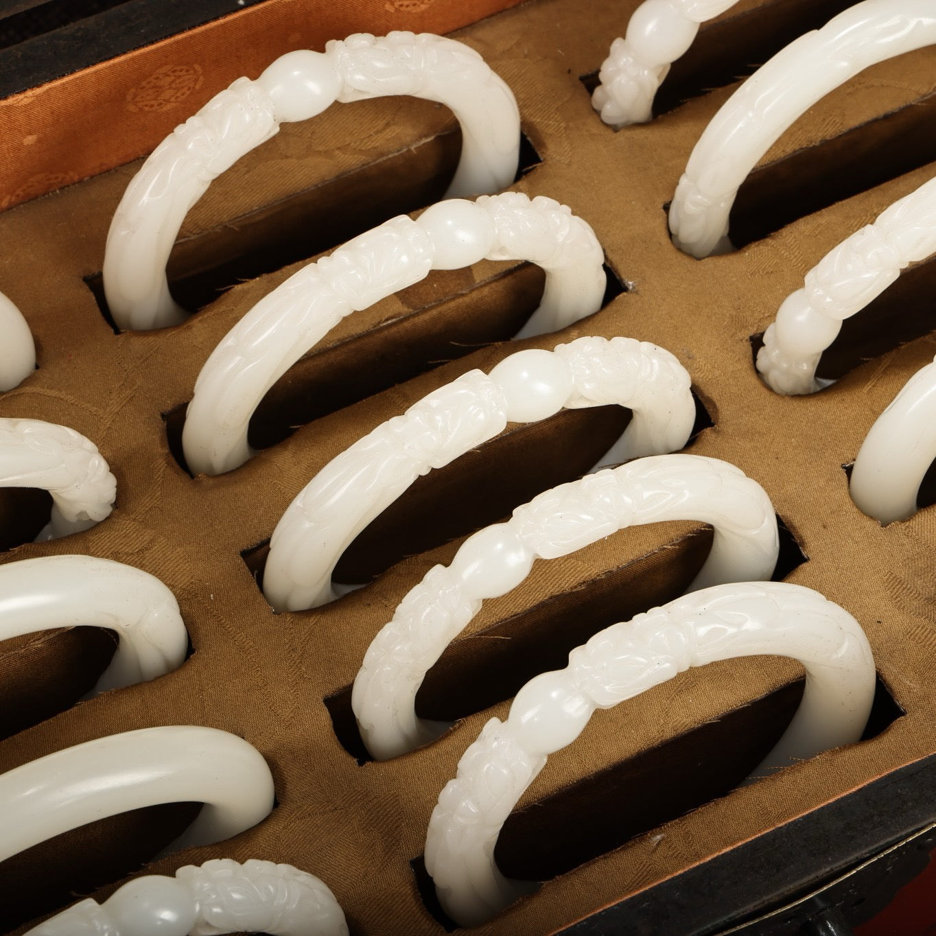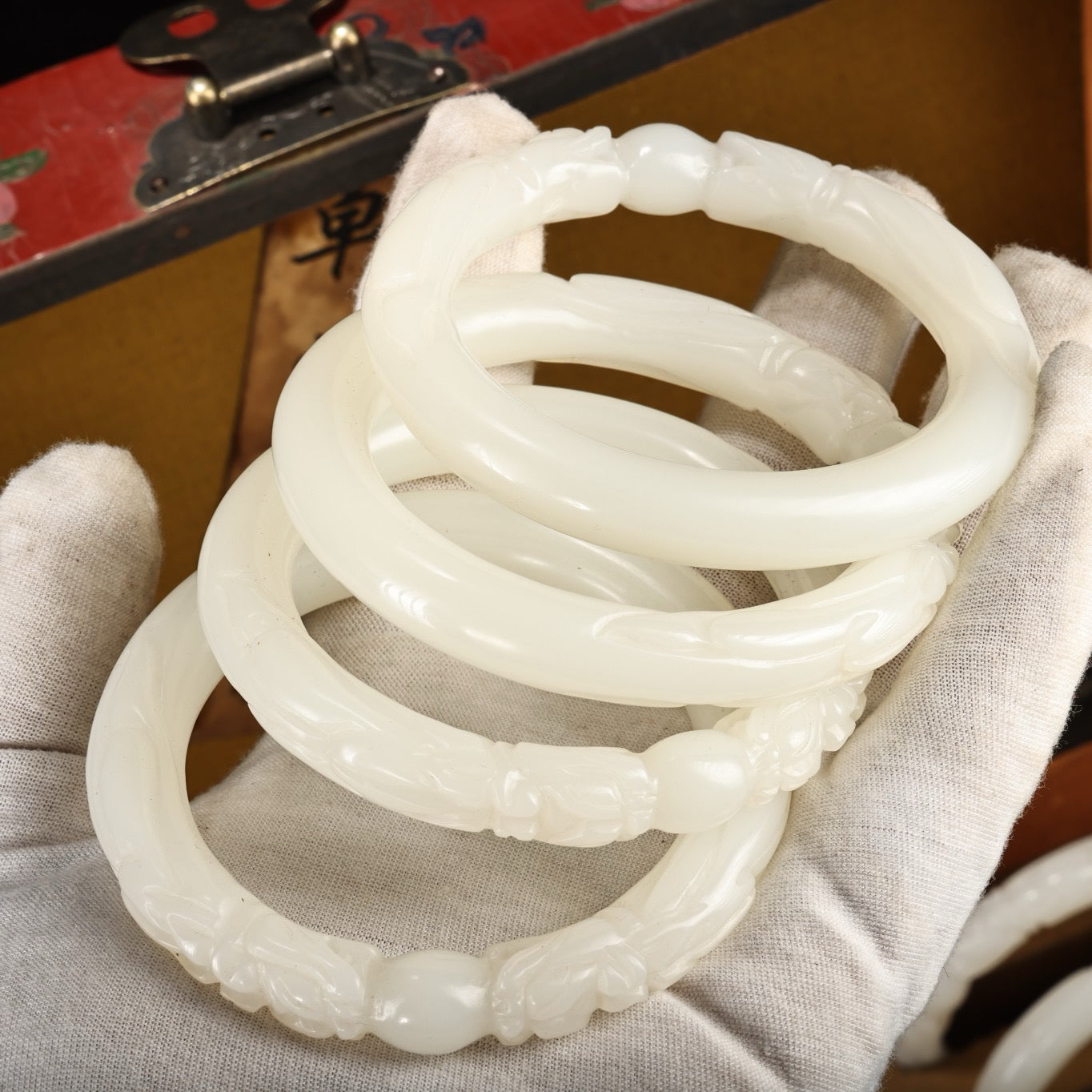 A box of Chinese antique dragon head white jade bracelets