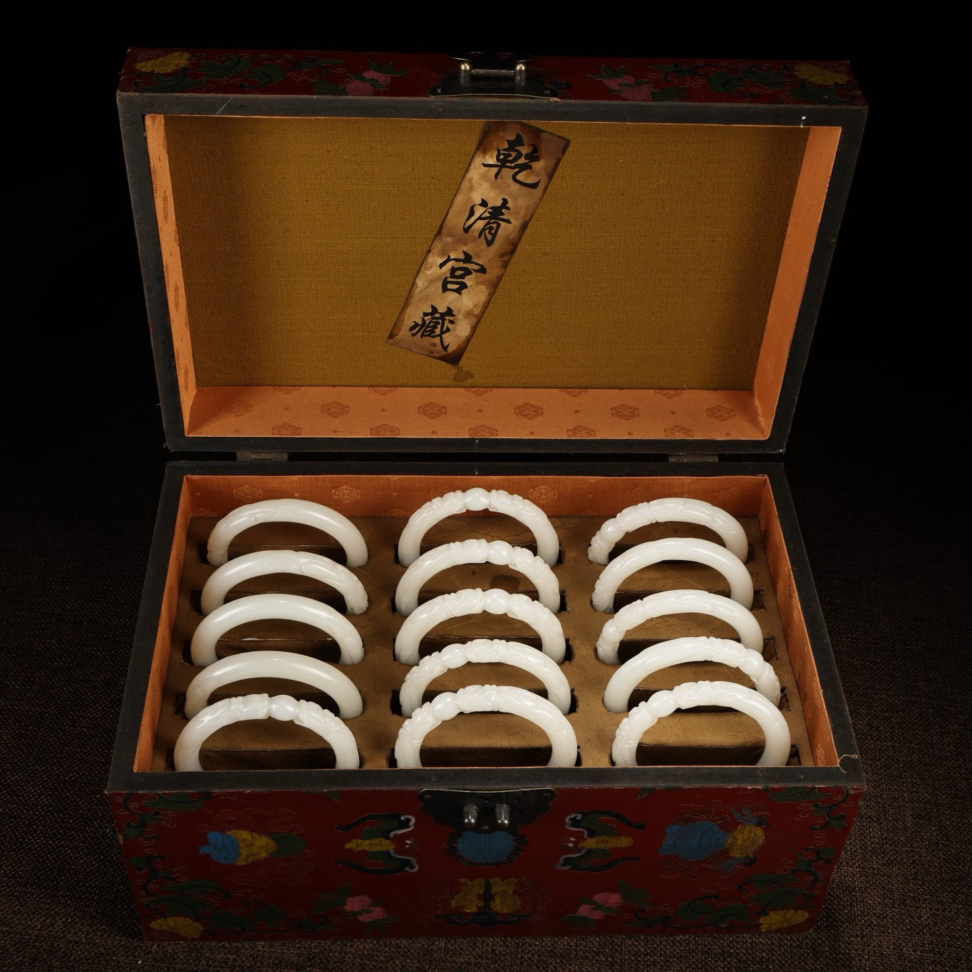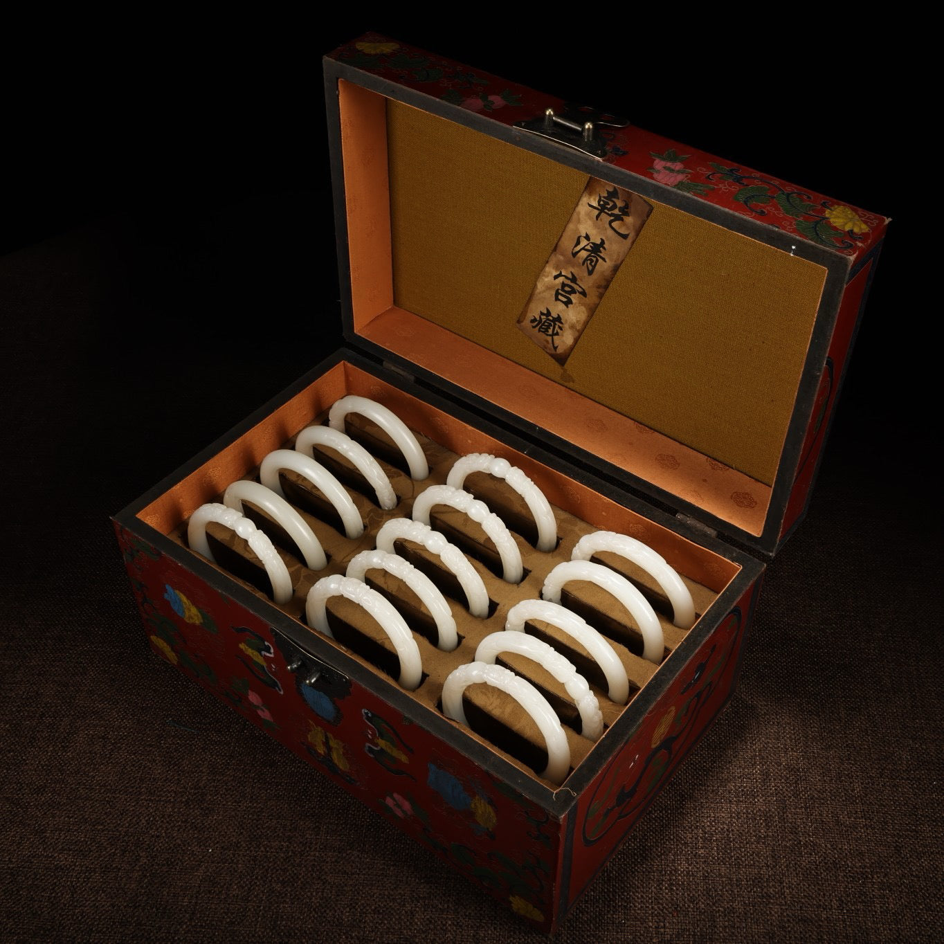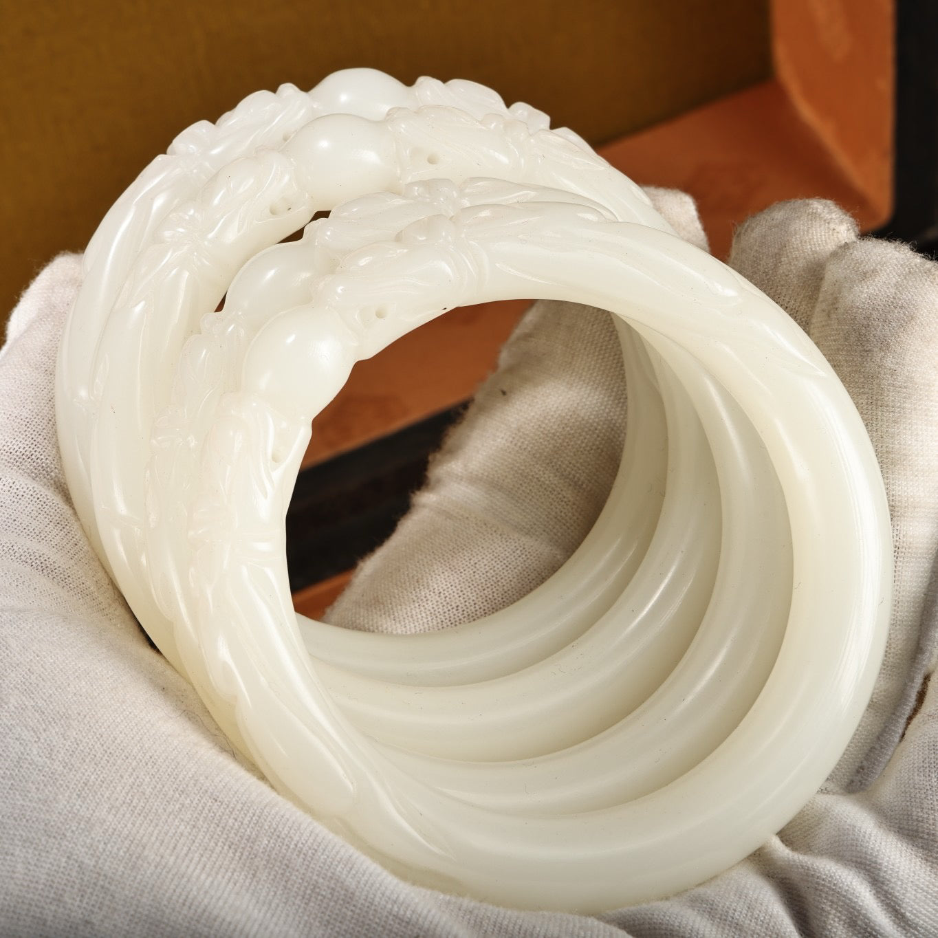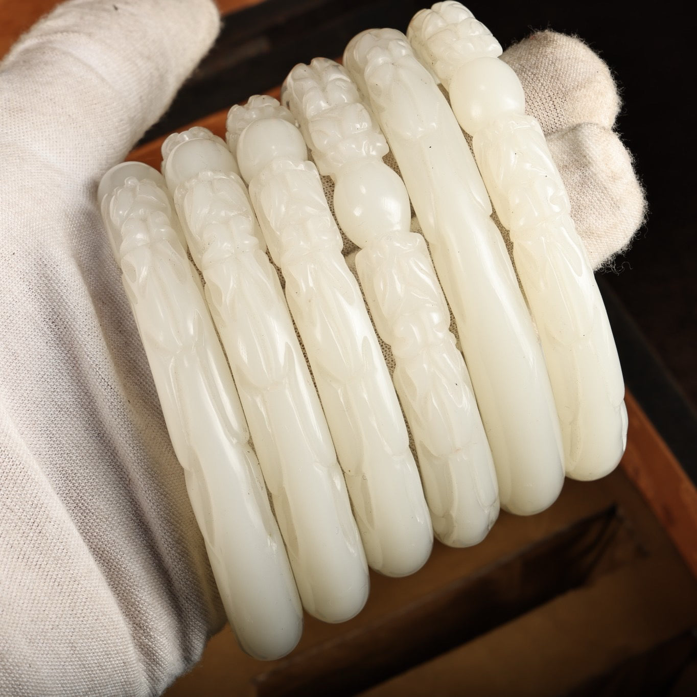 A box of Chinese antique dragon head white jade bracelets