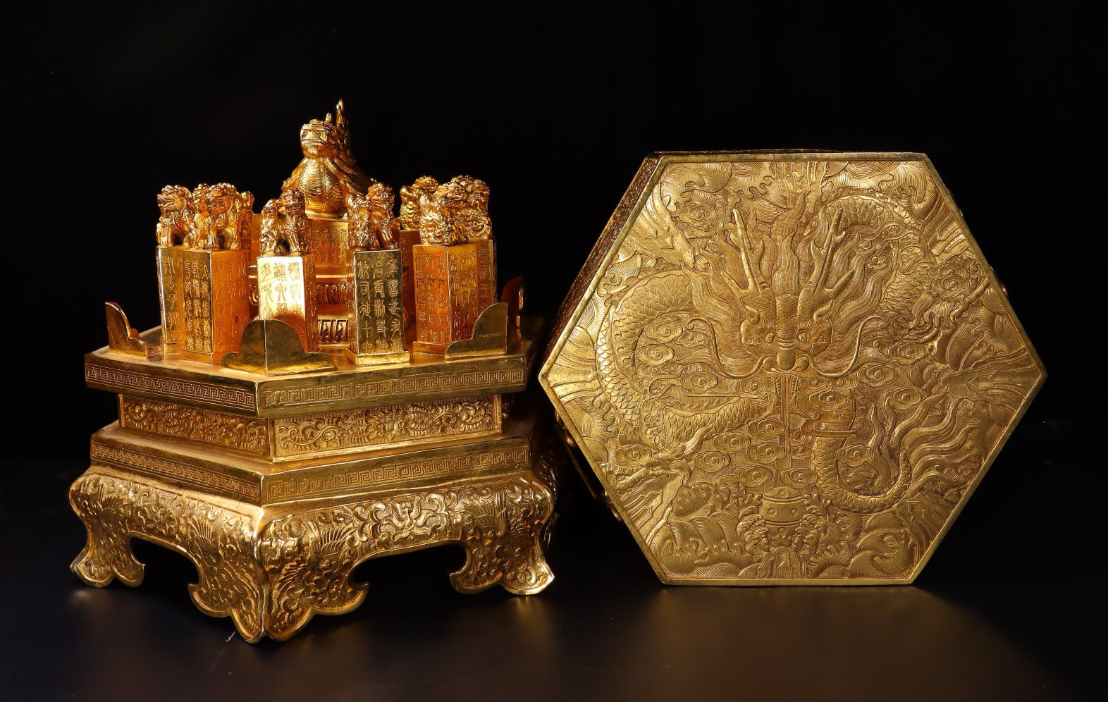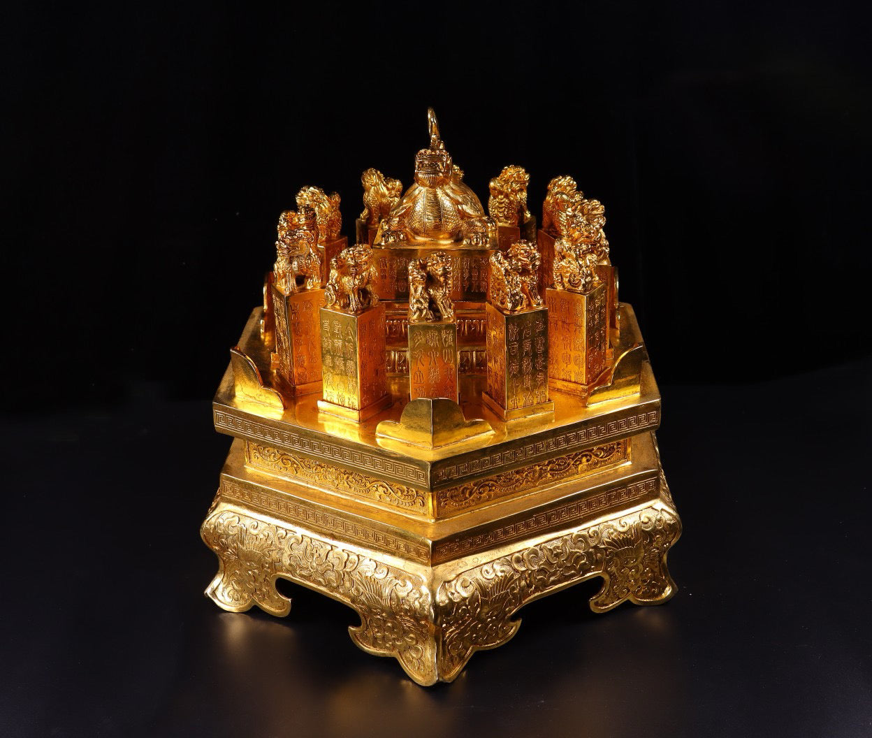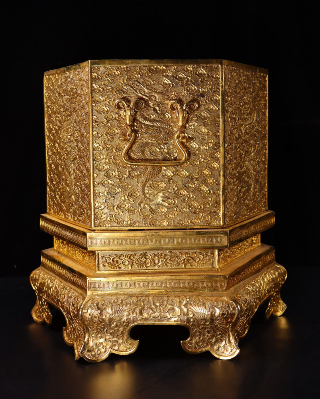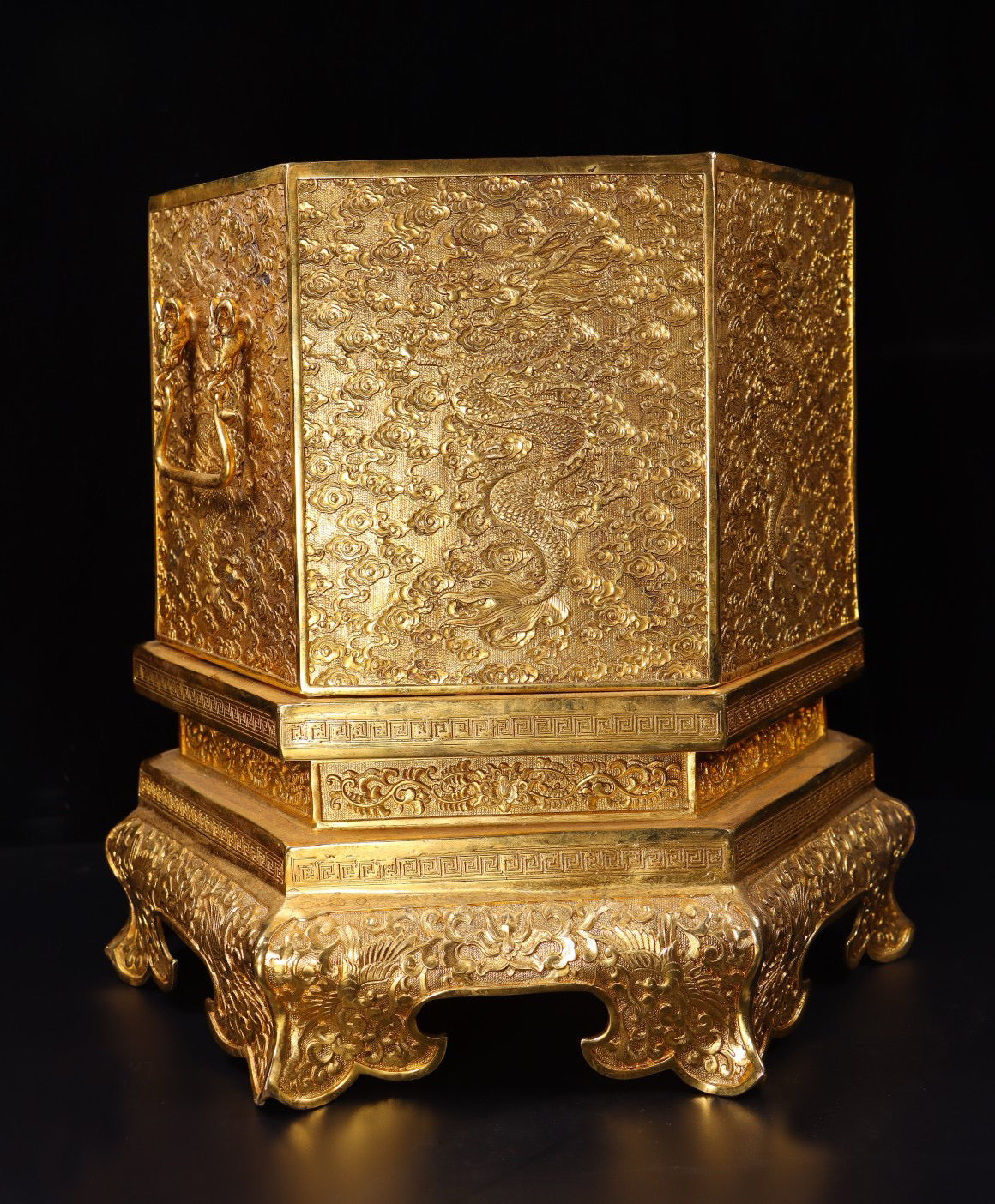 A box of Chinese antiques handcrafted with copper gilded high relief carving and carving of the "Thirteen Taibao" seal