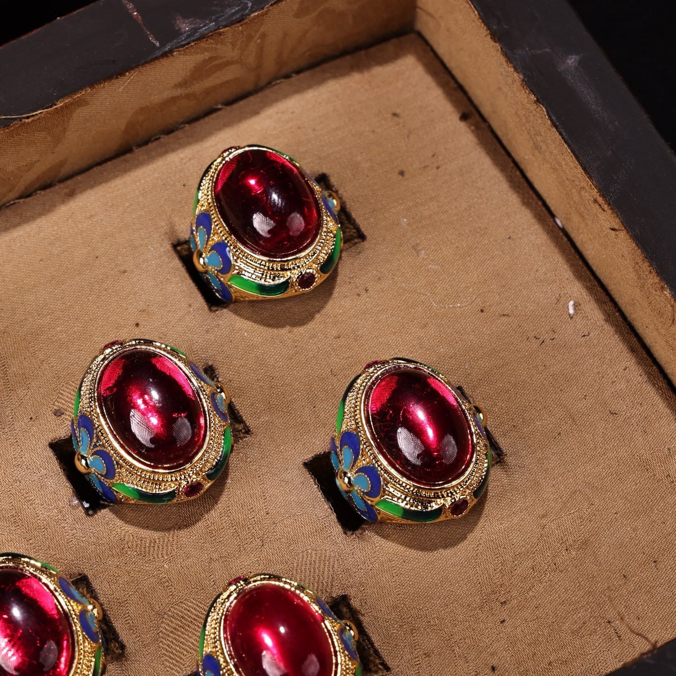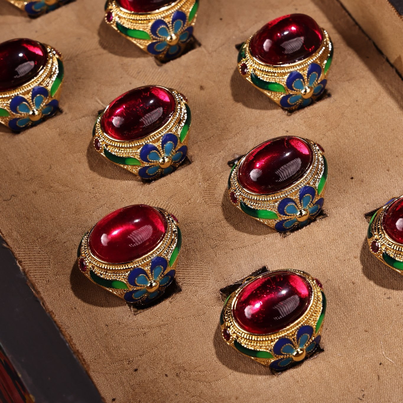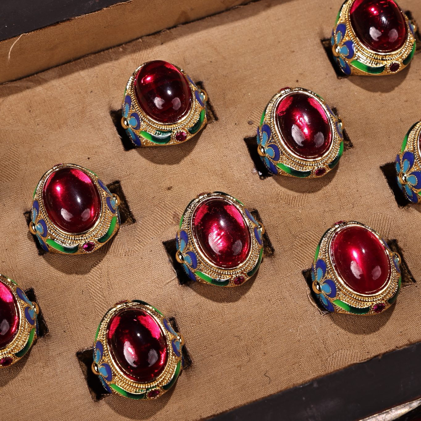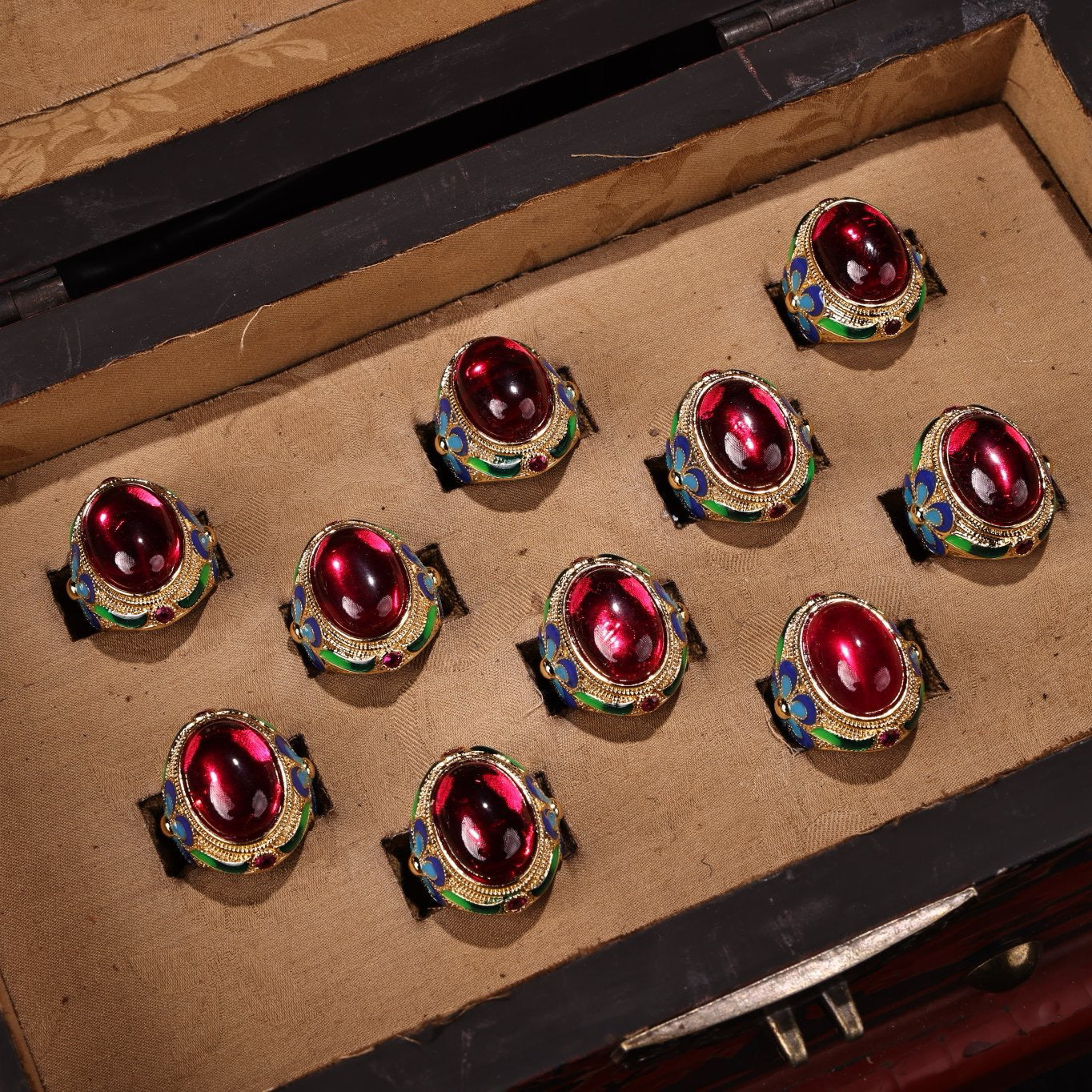 A box of rare and exquisite red gemstone and diamond rings set with Chinese antique gilded gold inlay