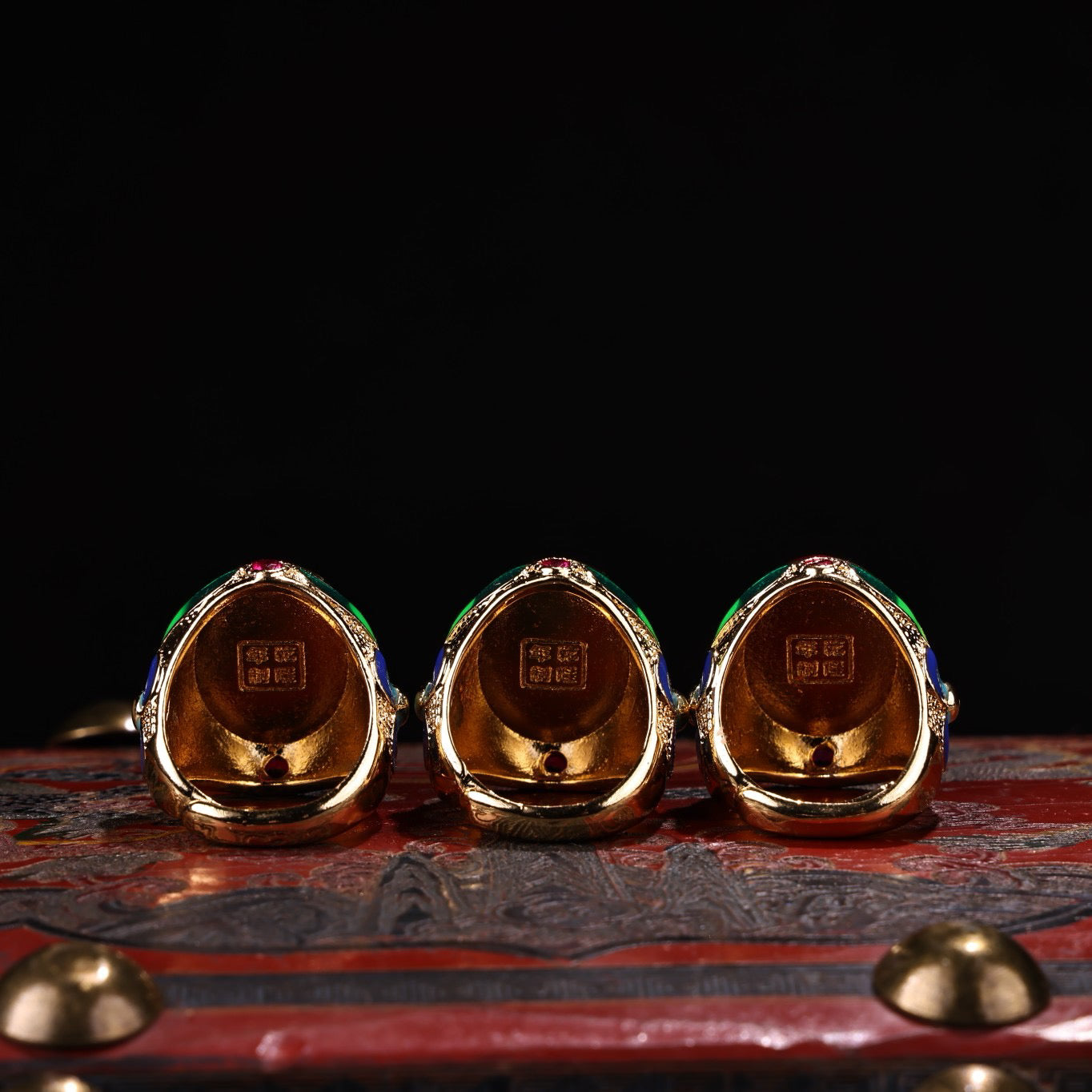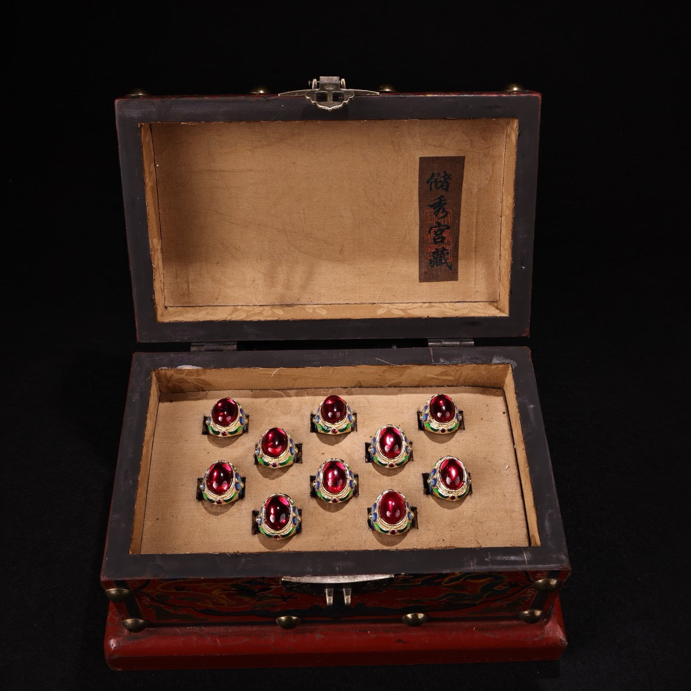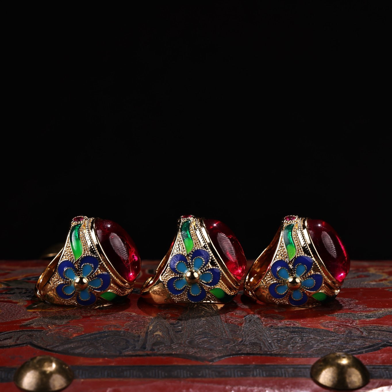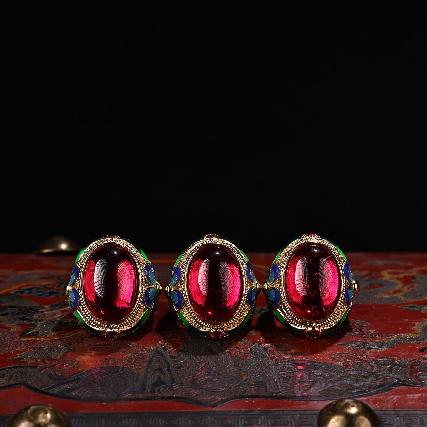 A box of rare and exquisite red gemstone and diamond rings set with Chinese antique gilded gold inlay