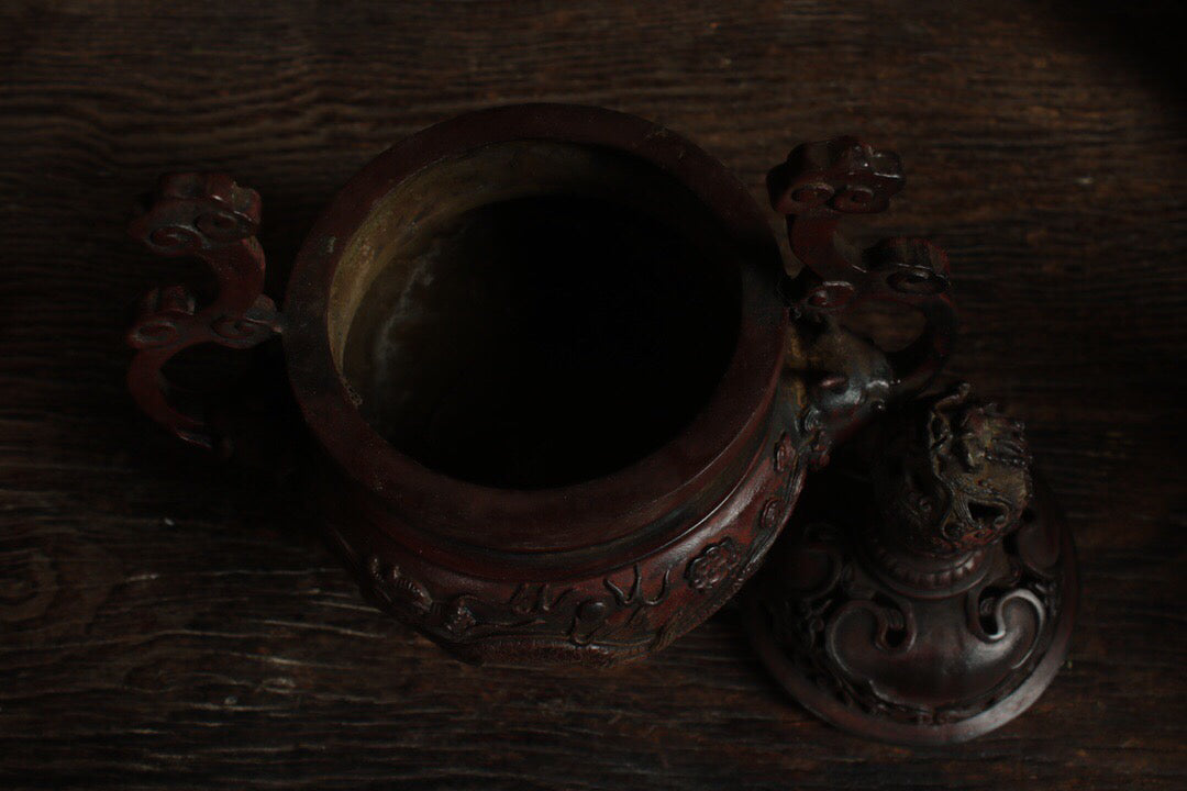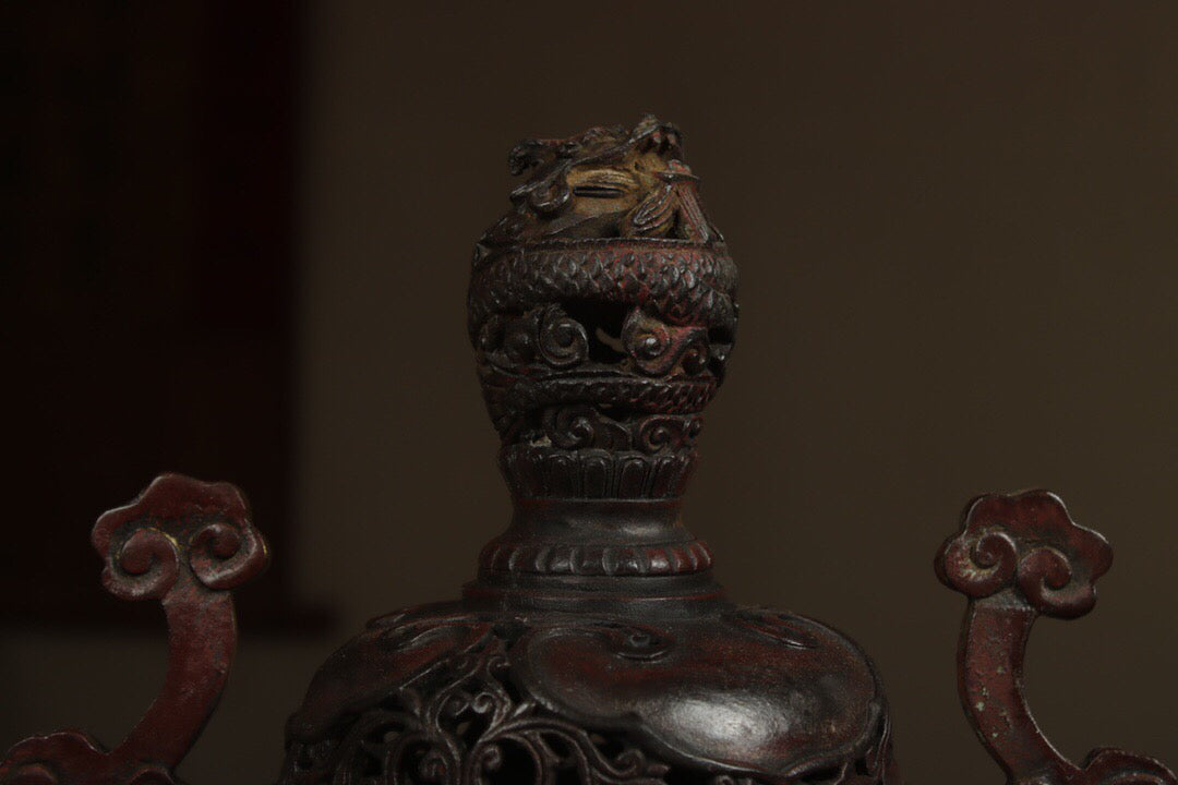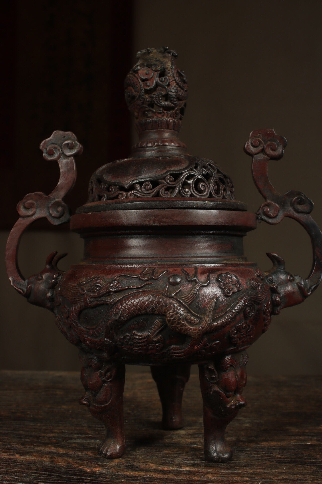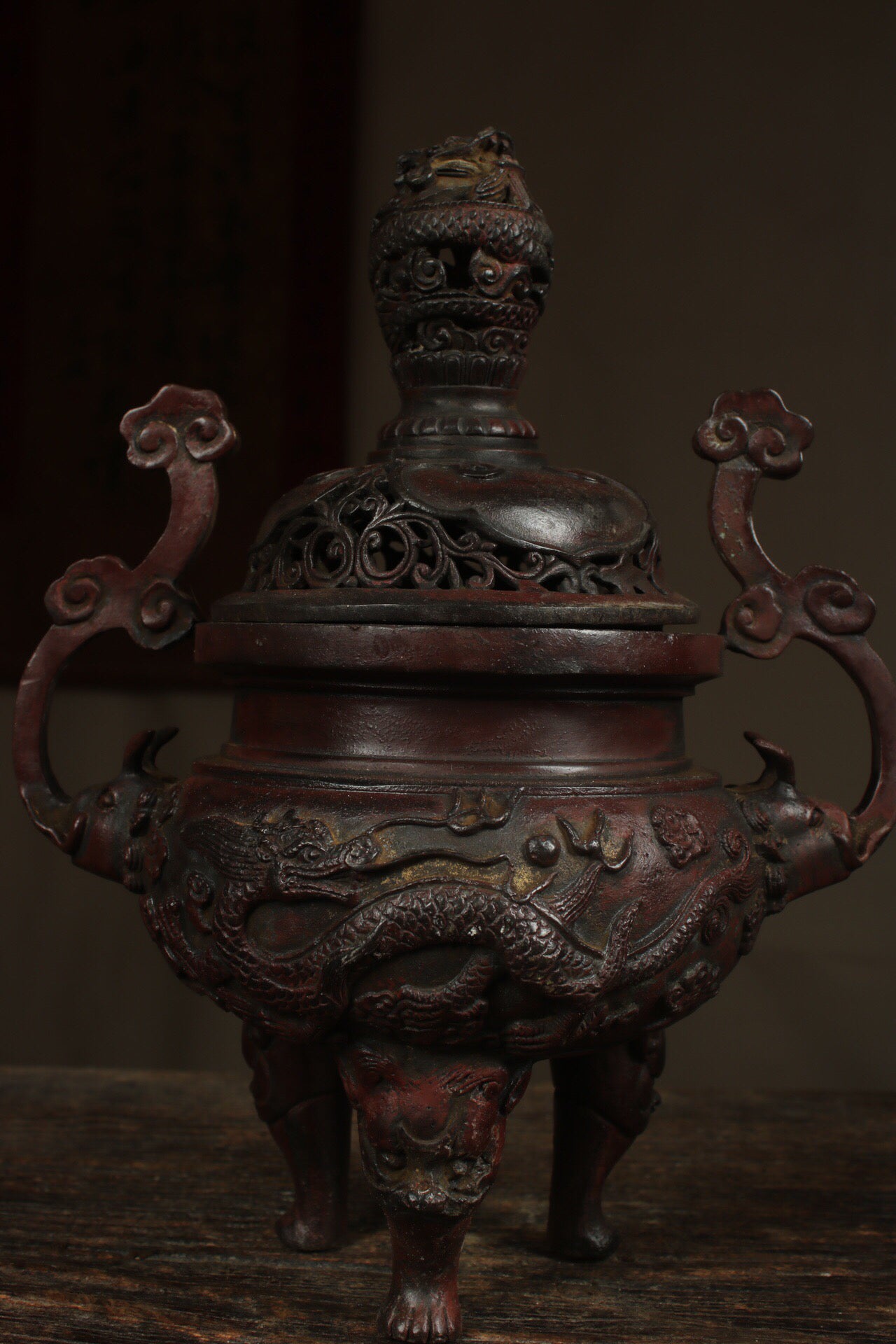 A Chinese antique pure copper incense burner with three legs and two dragons