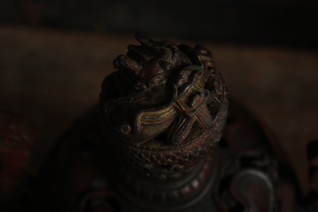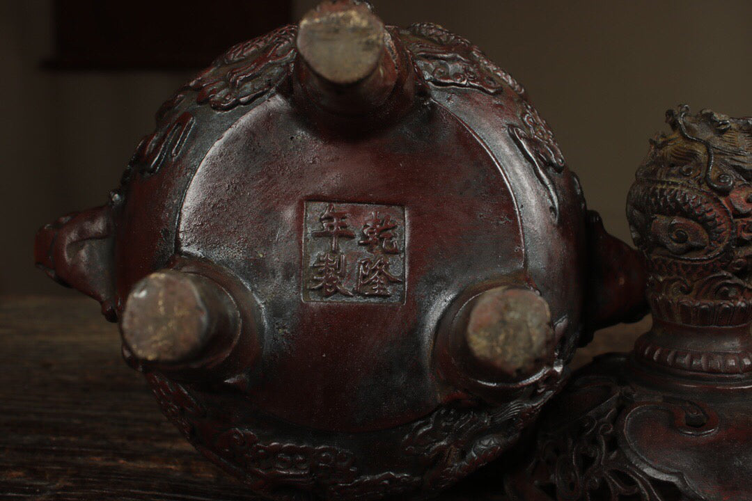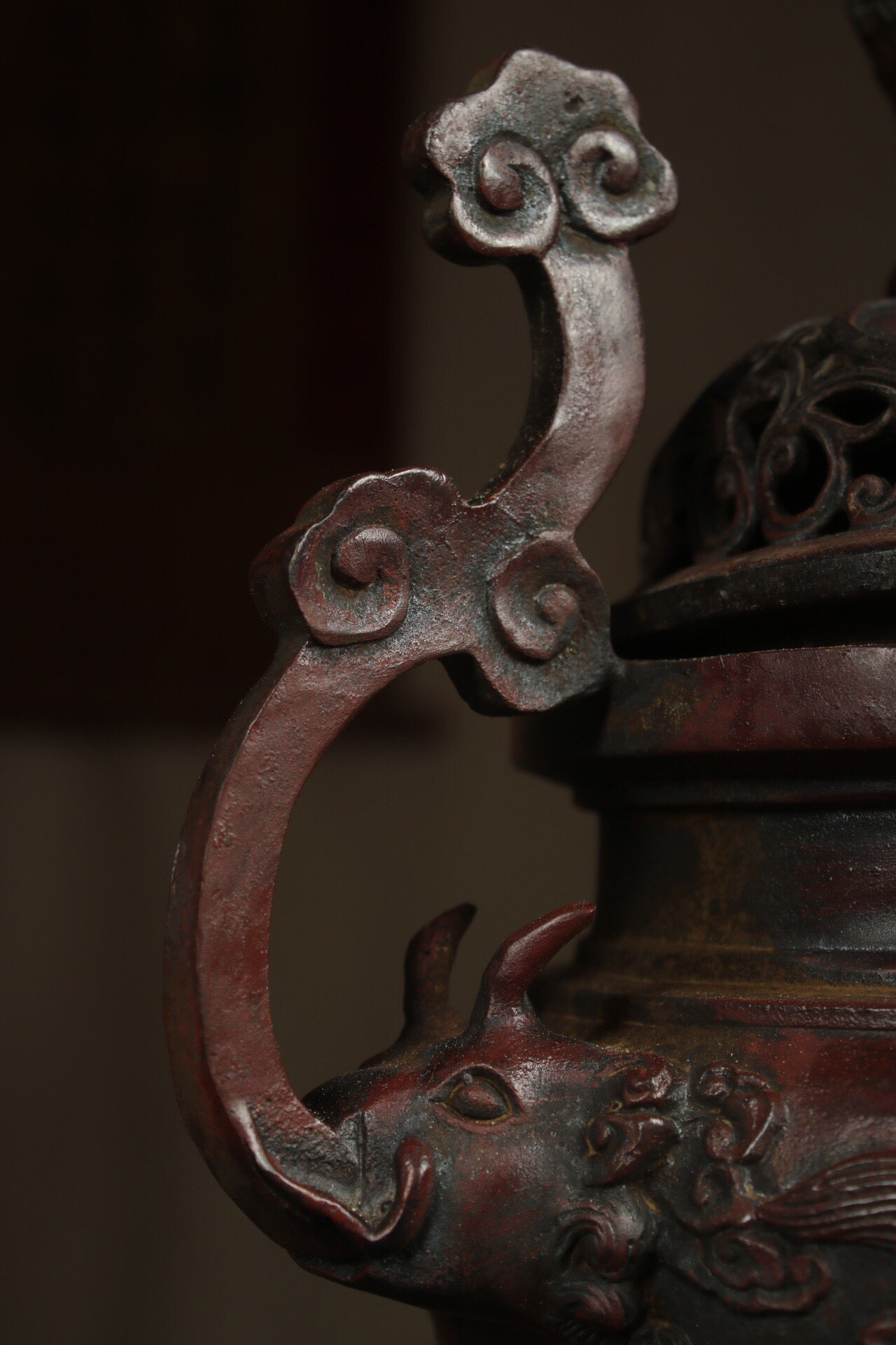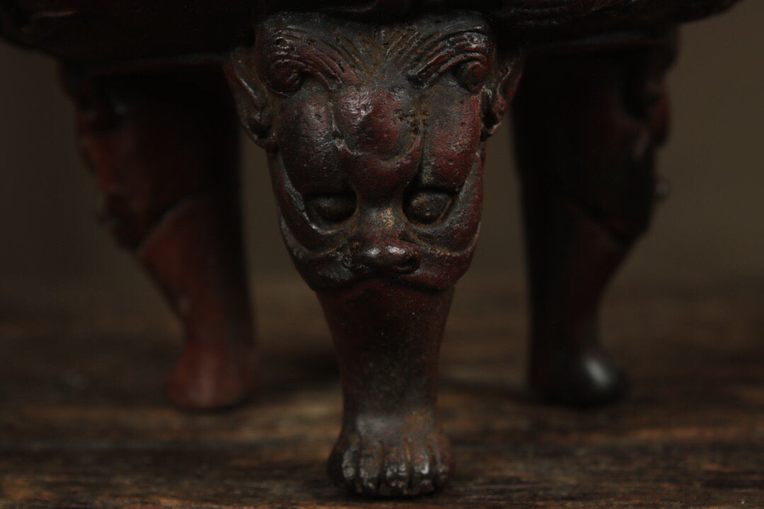 A Chinese antique pure copper incense burner with three legs and two dragons
