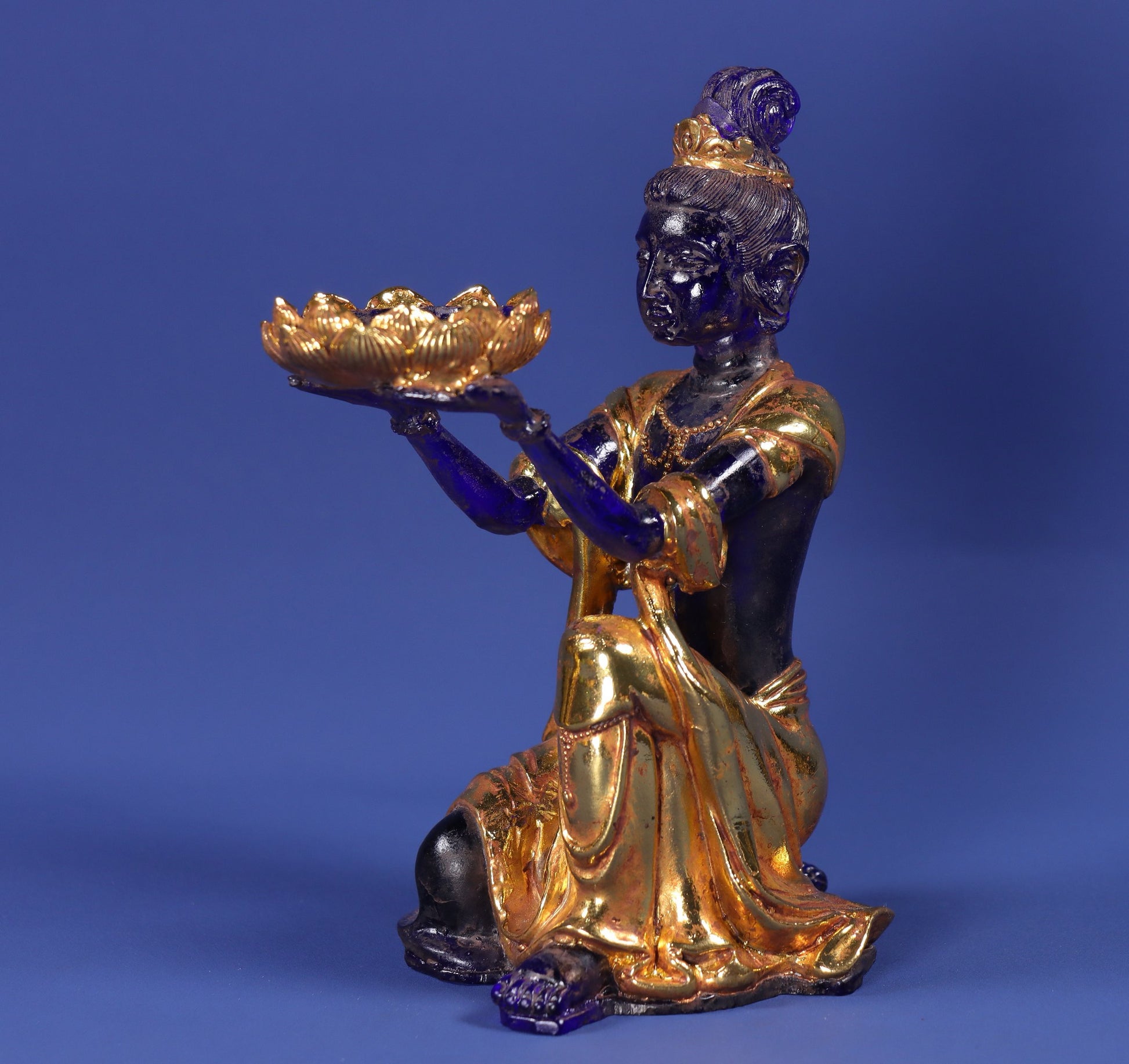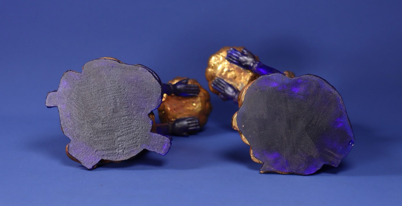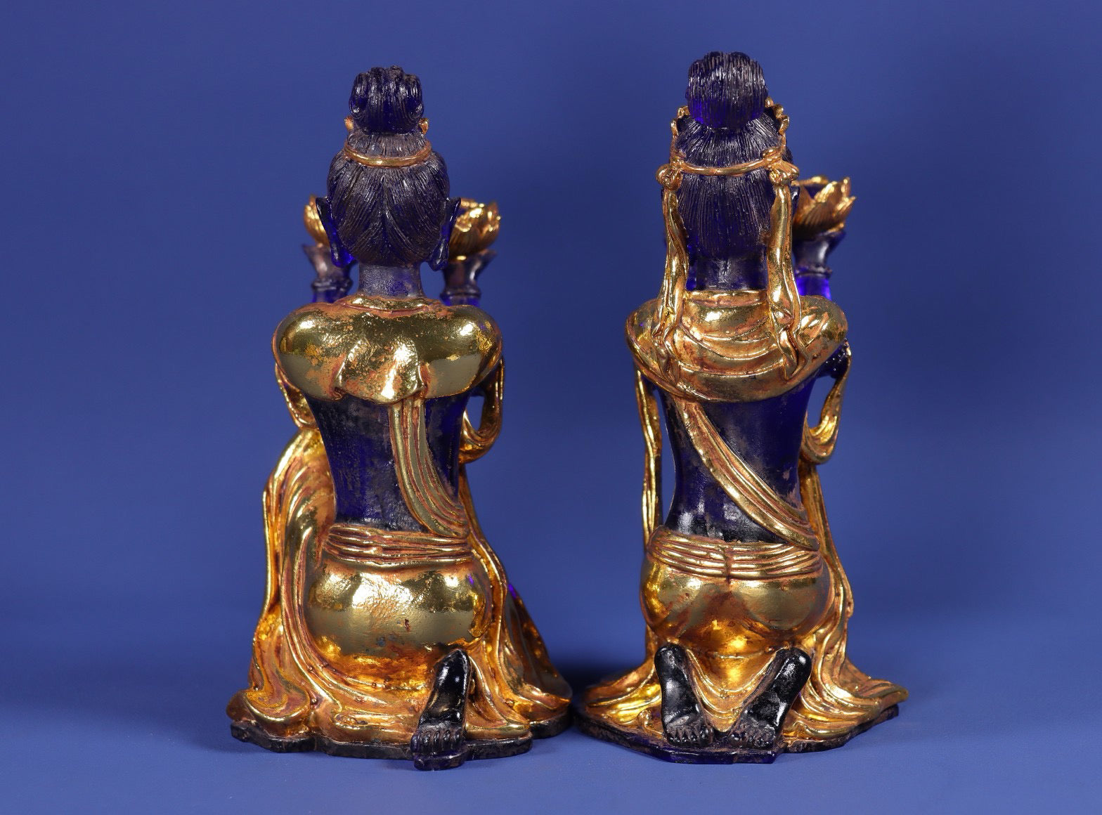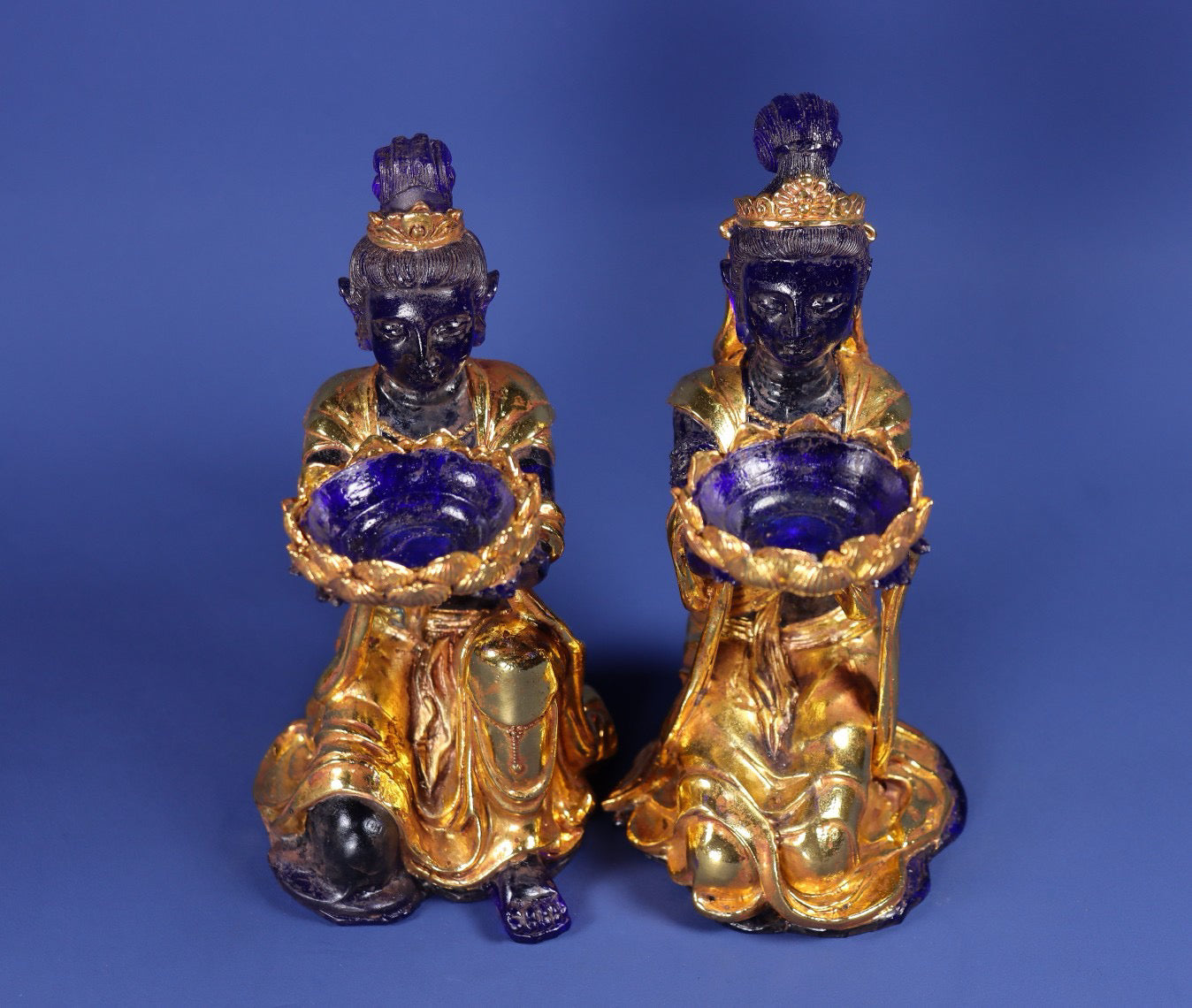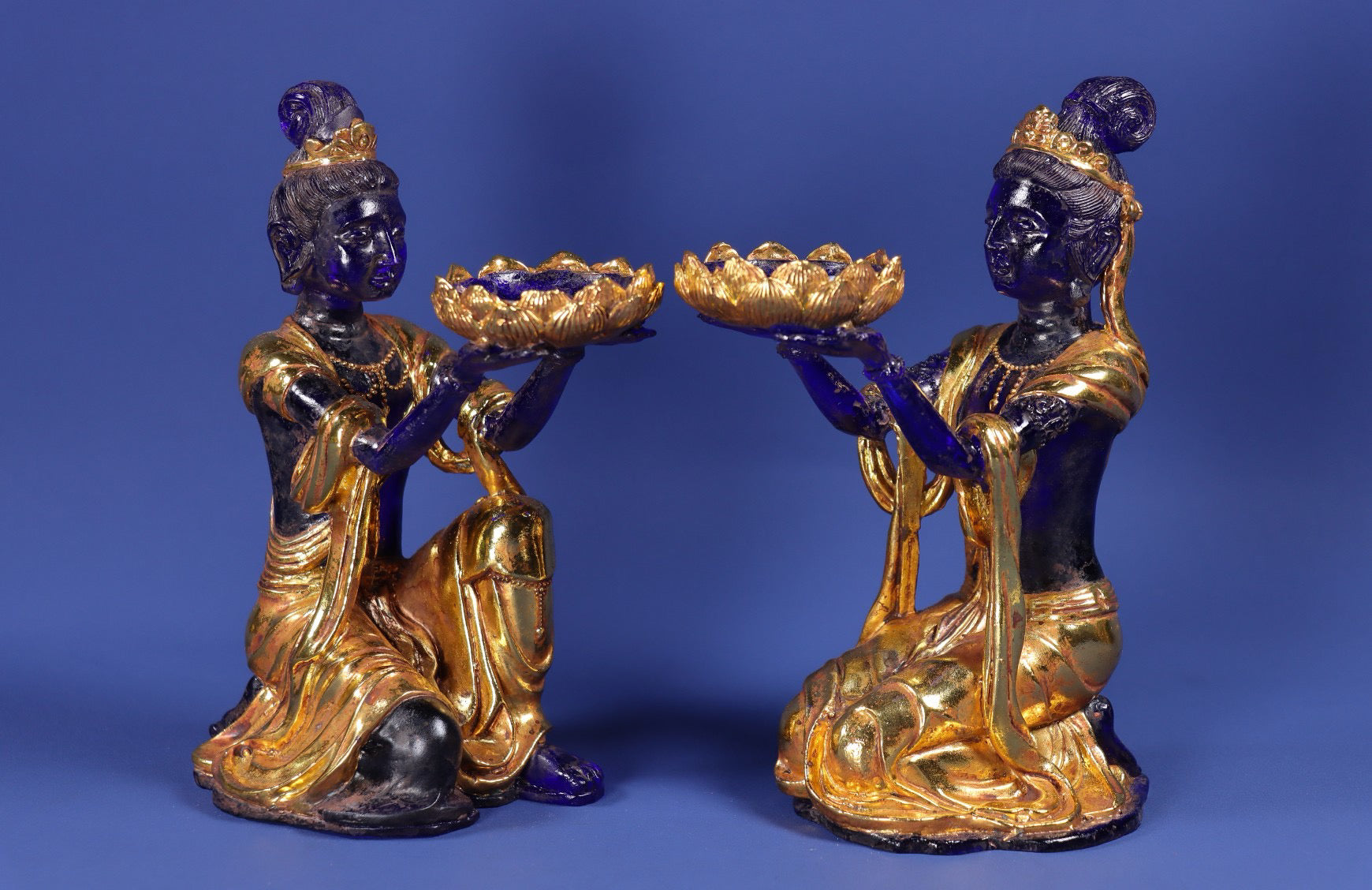 A pair of ancient Chinese glazed gold wrapped fairy candlestick ornaments