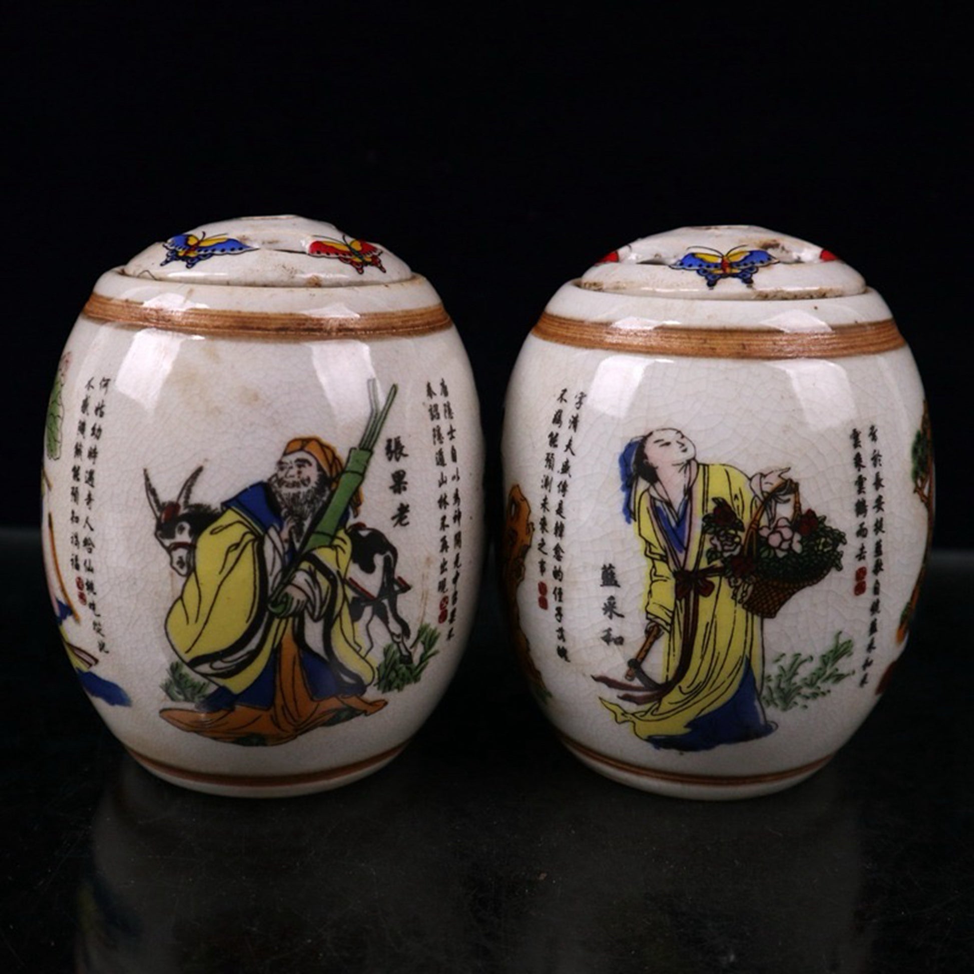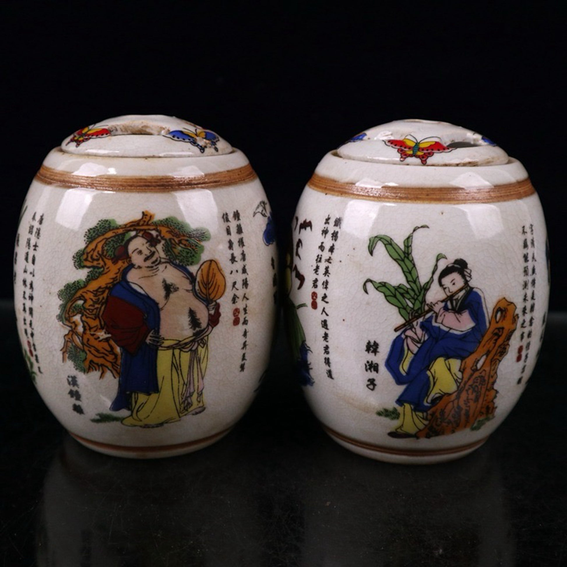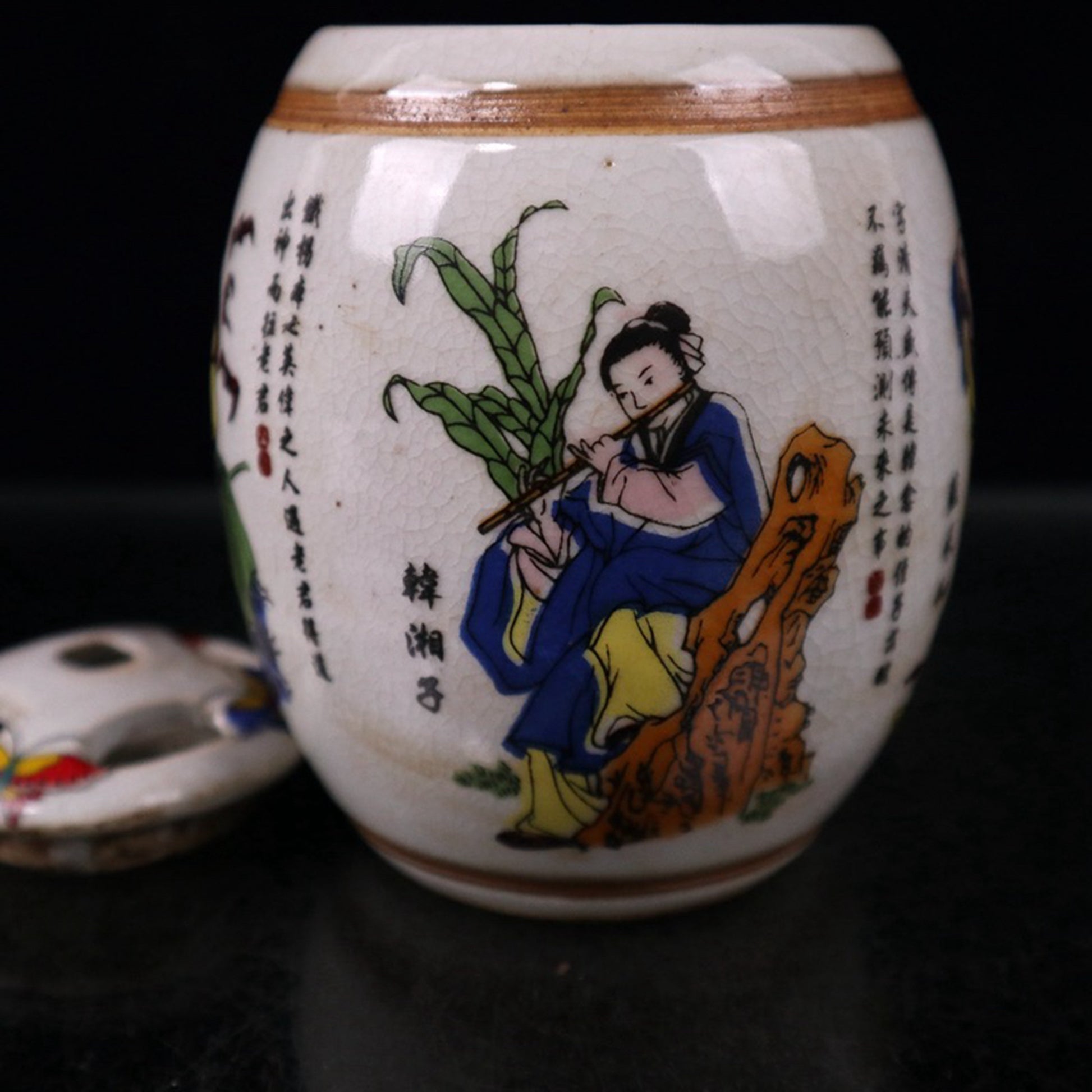 A pair of ceramic open panel pink Eight Immortals patterned waist drum lid jars
