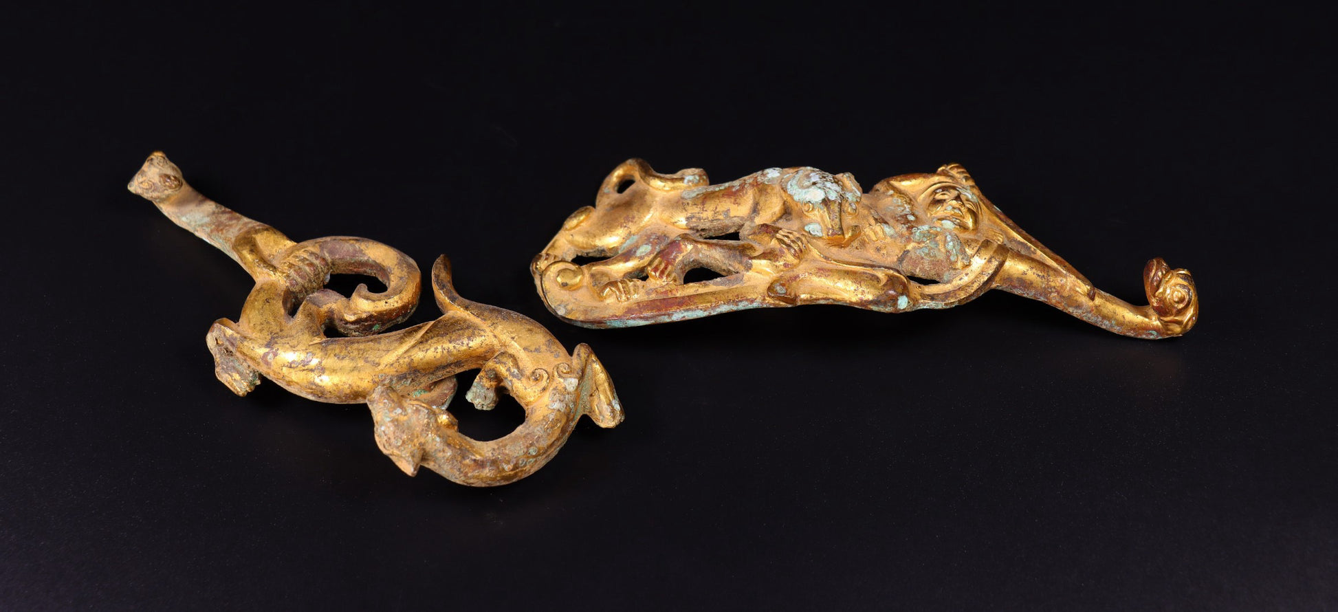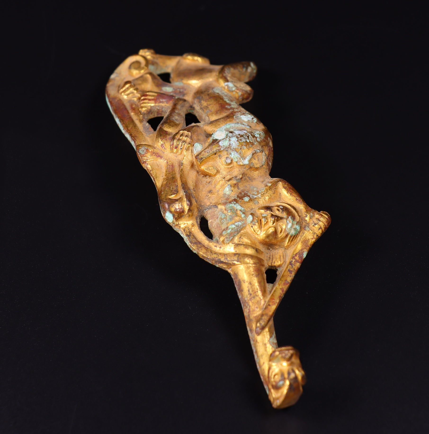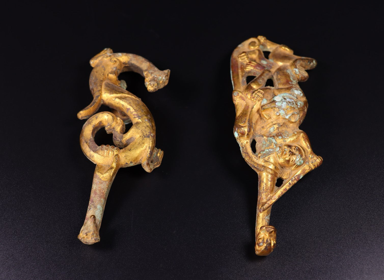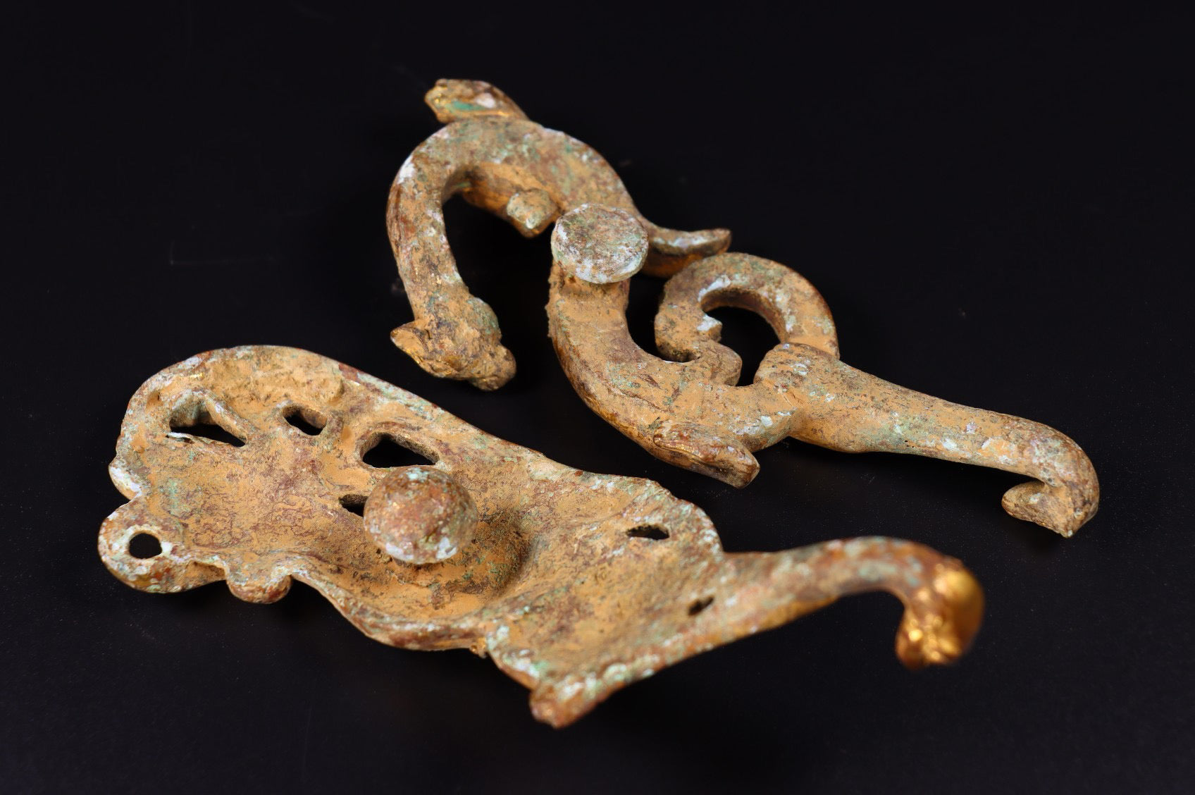 A pair of Chinese antique bronze gilded with red spots, green rust, and hooks