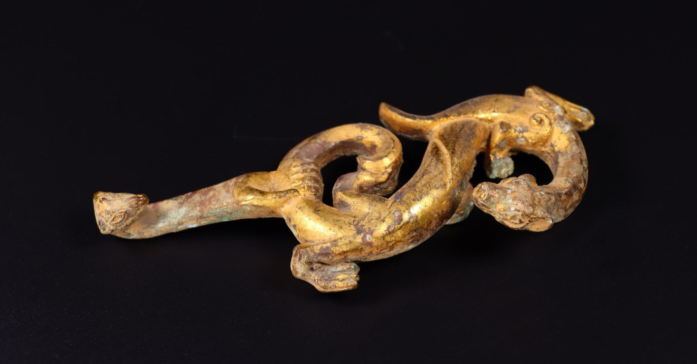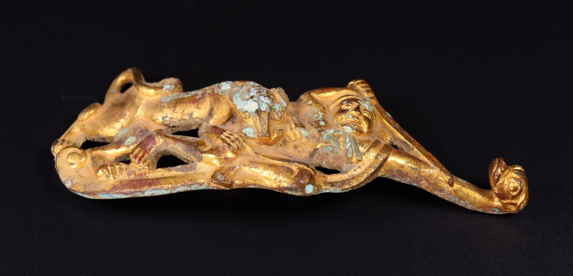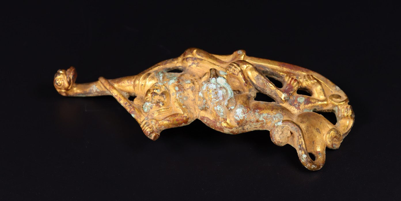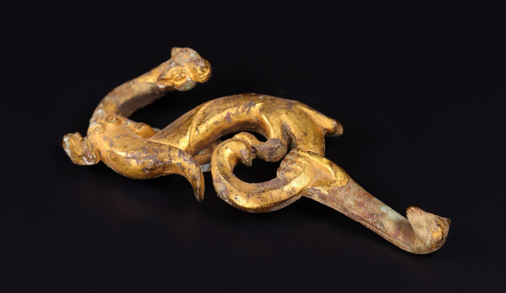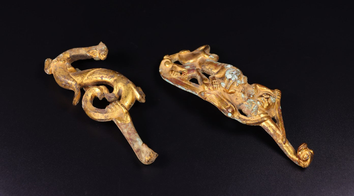 A pair of Chinese antique bronze gilded with red spots, green rust, and hooks