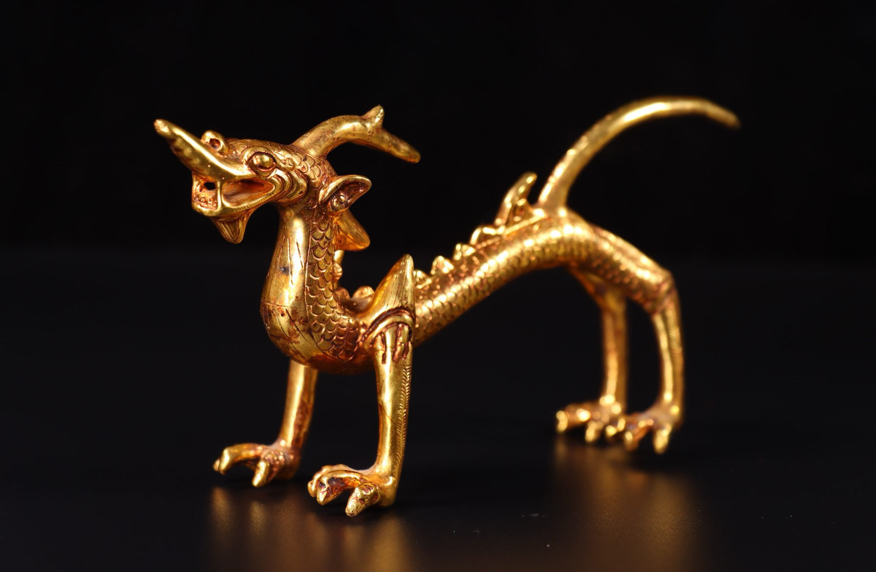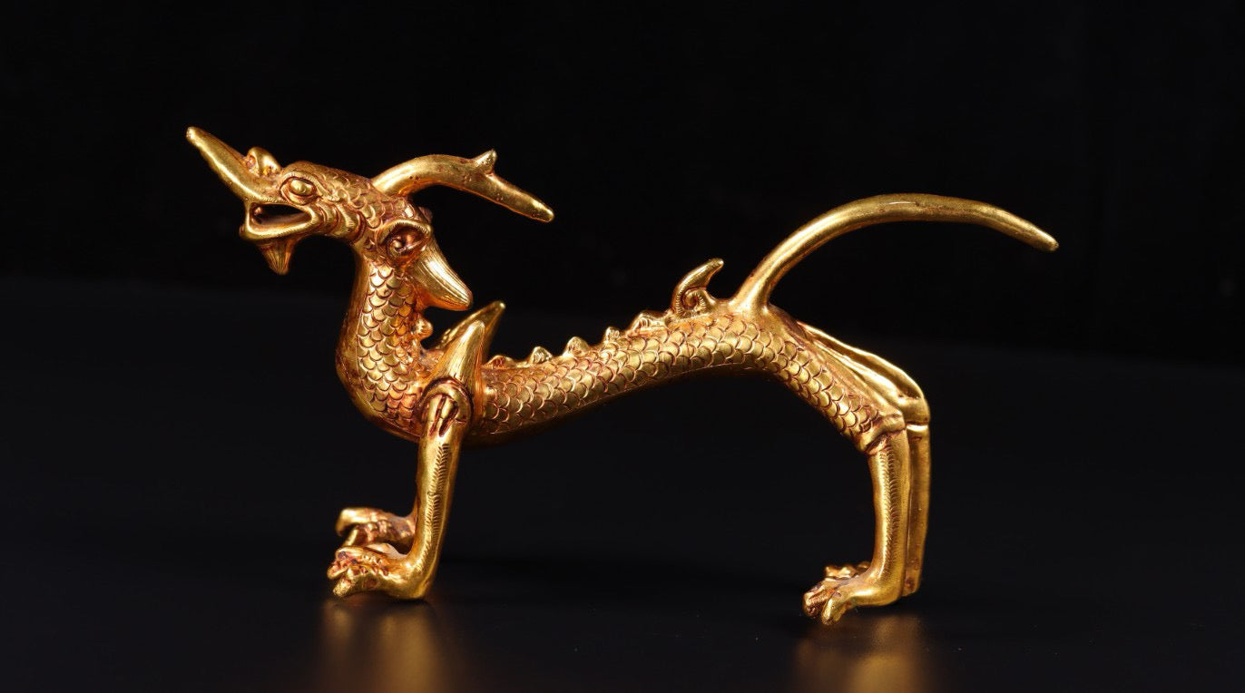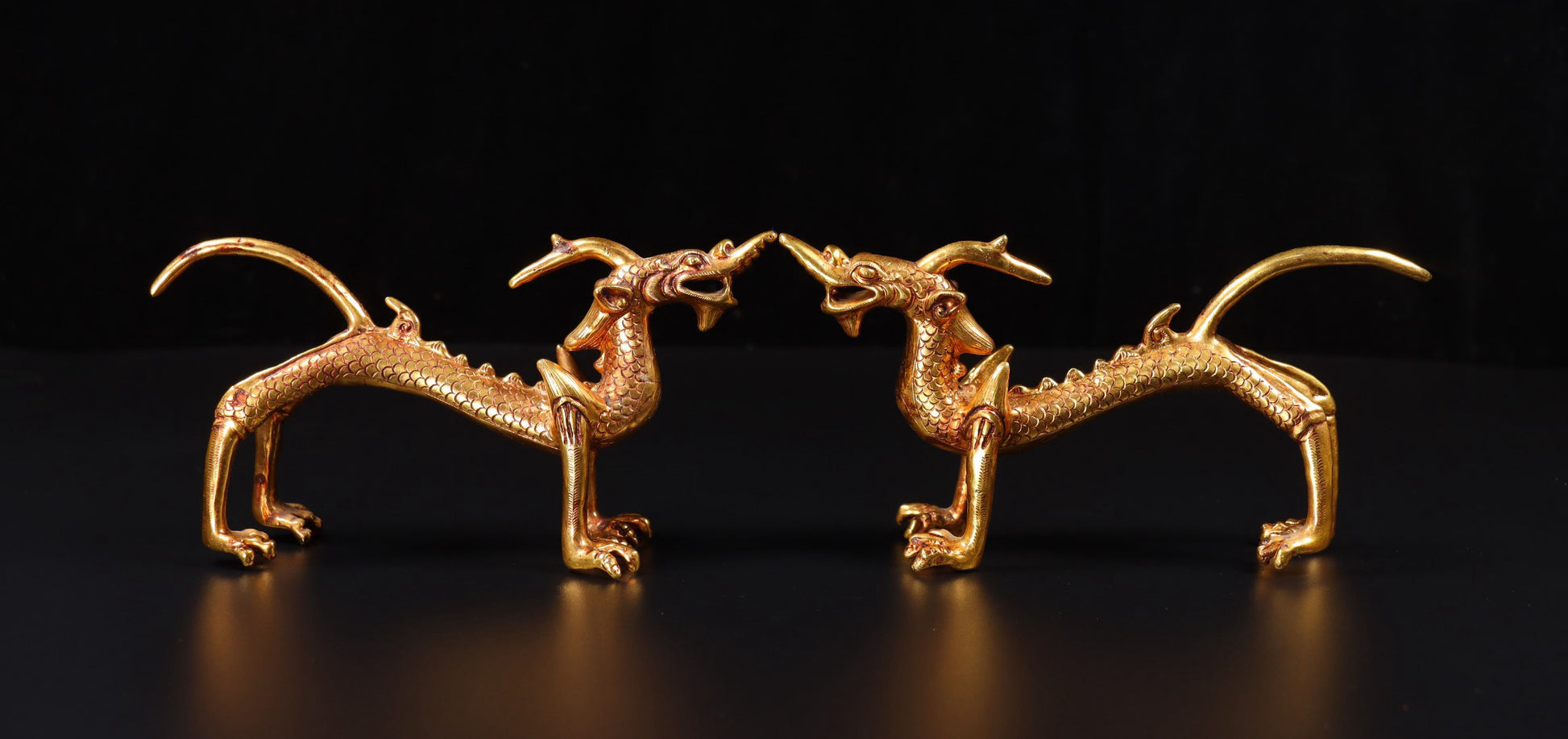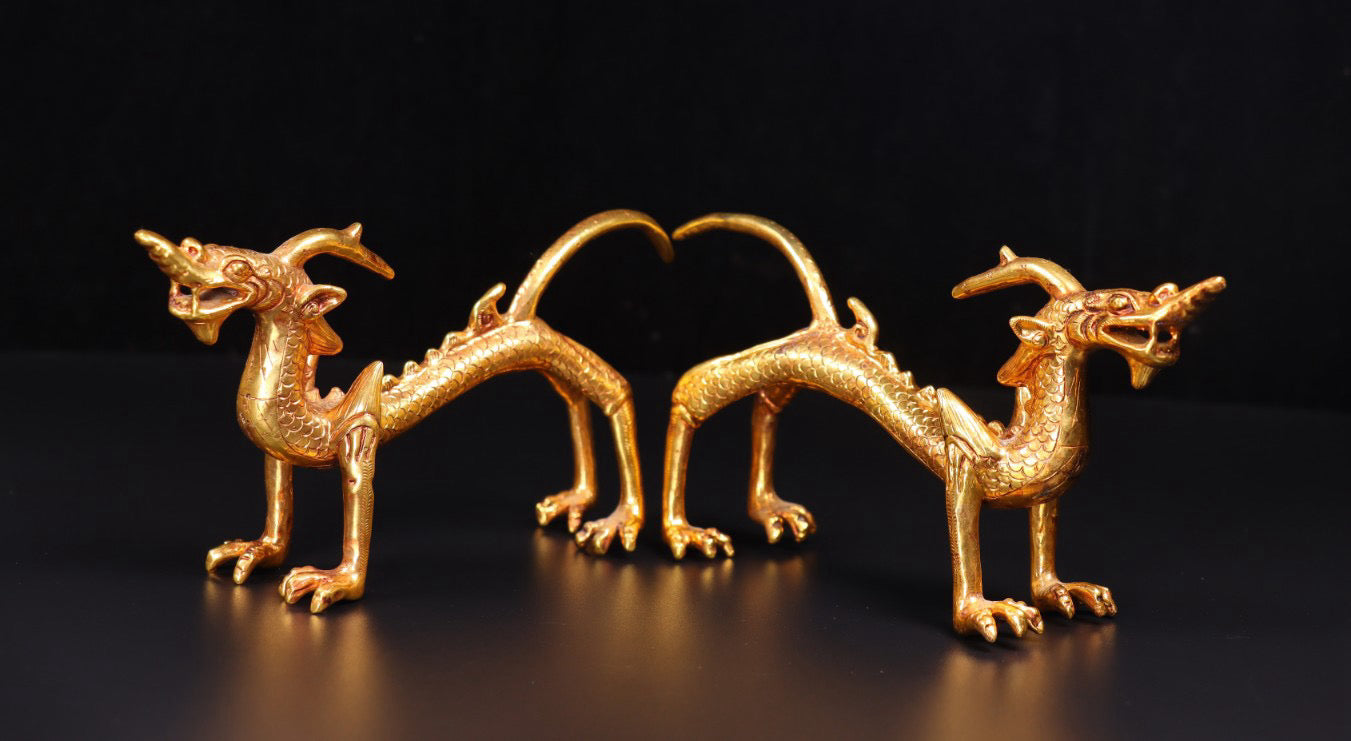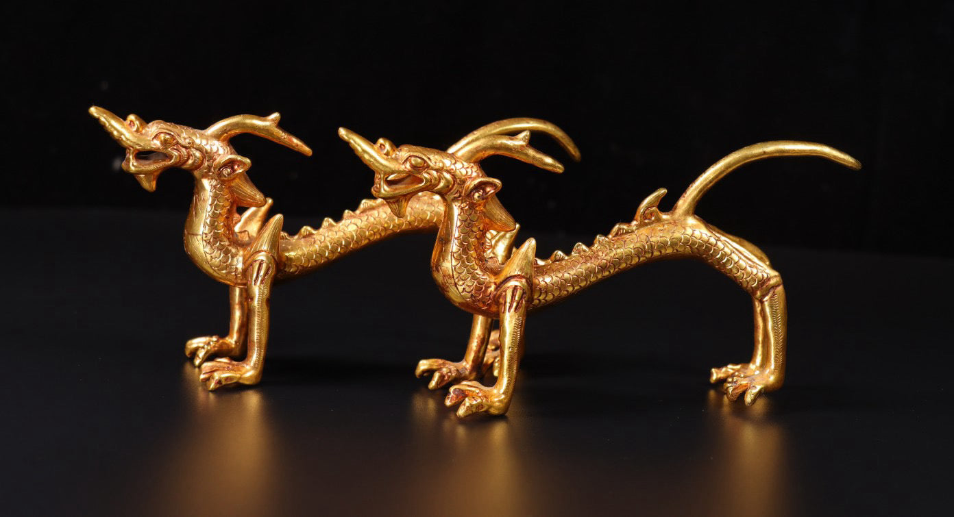 A pair of Chinese antique handmade copper gilded gold high relief carved dragons