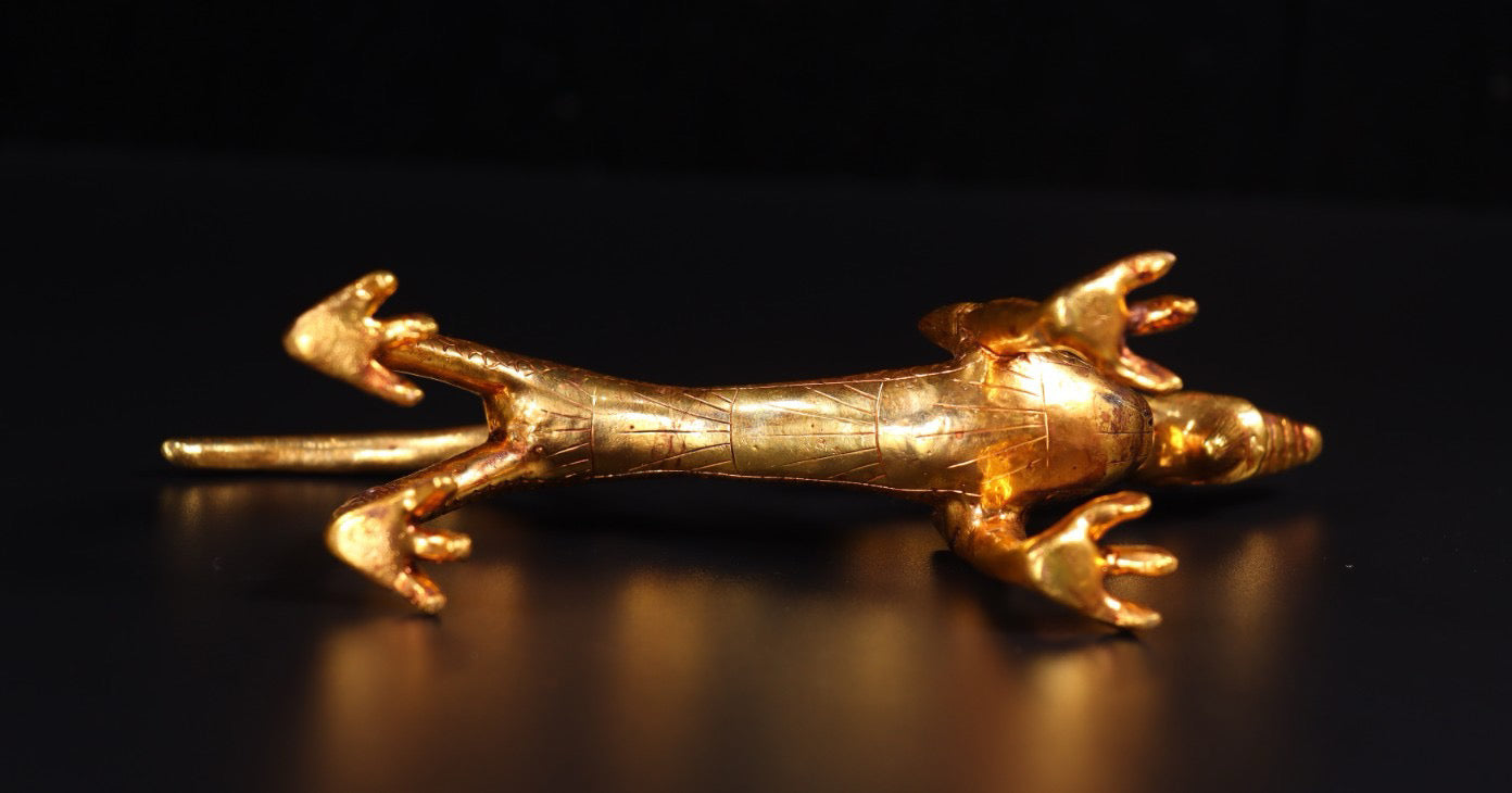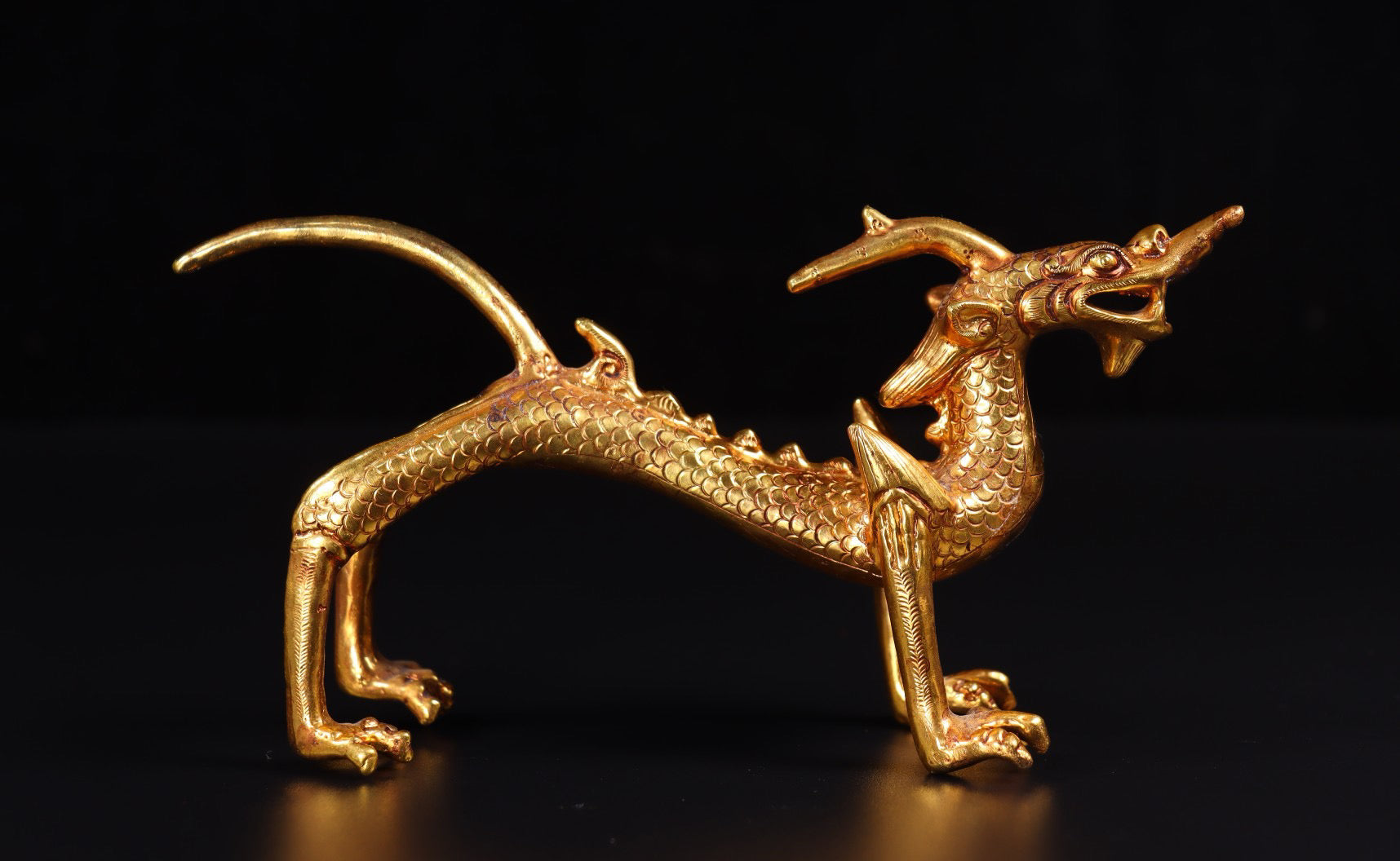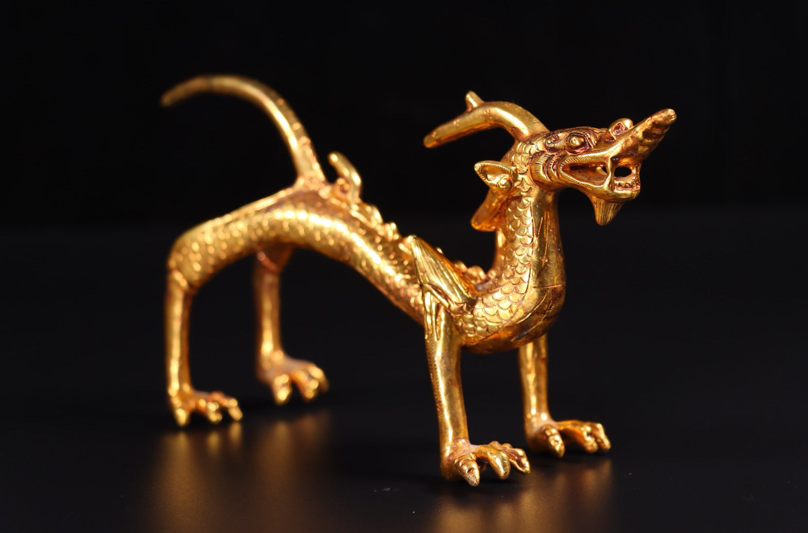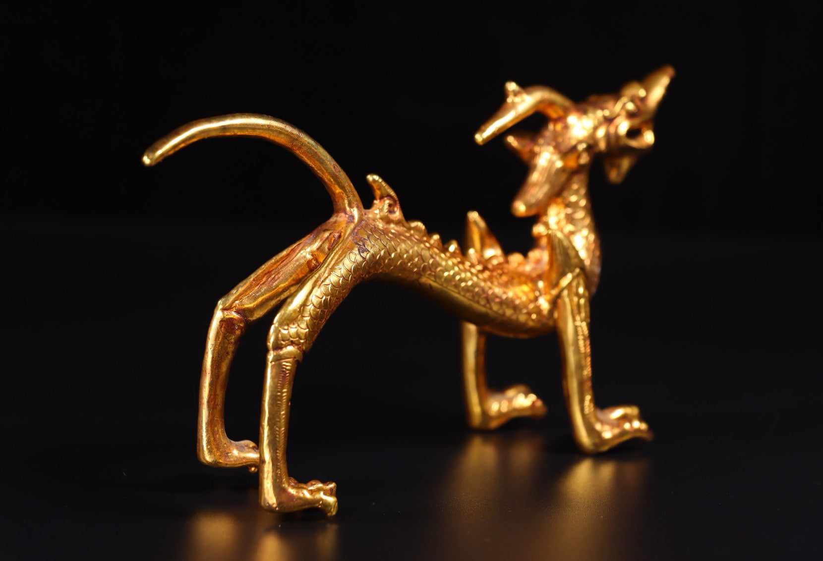 A pair of Chinese antique handmade copper gilded gold high relief carved dragons