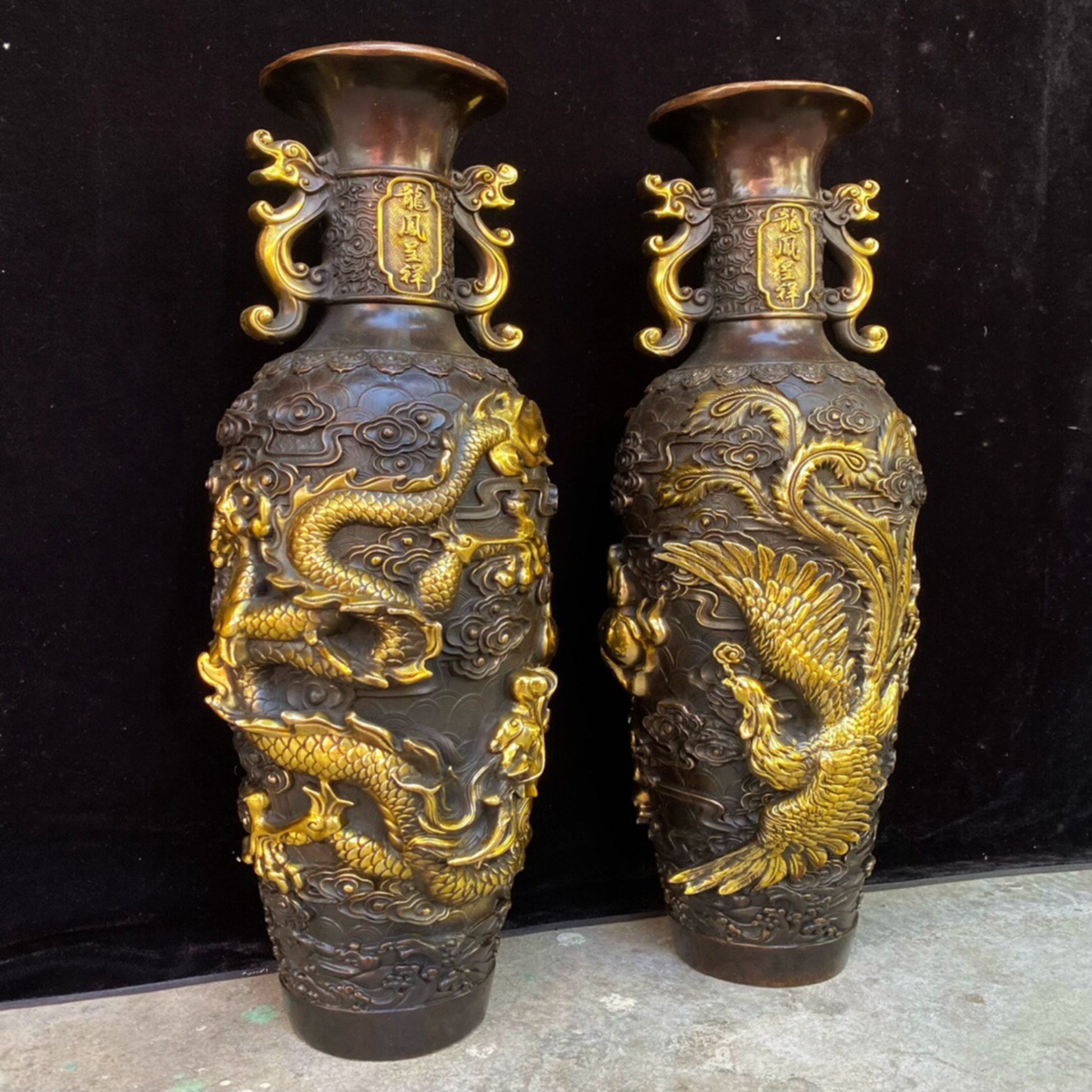 A pair of Chinese antique pure copper dragon and phoenix auspicious vases