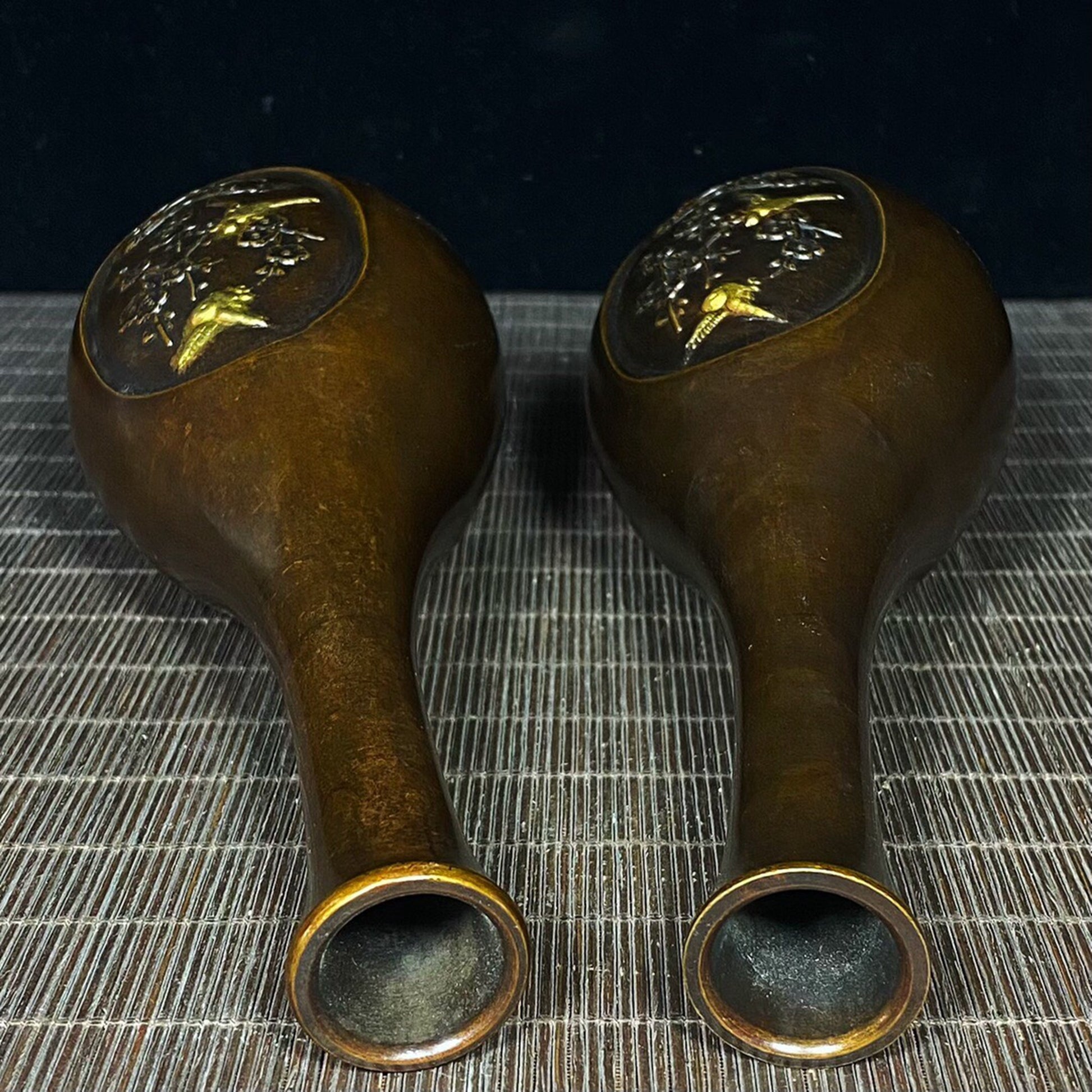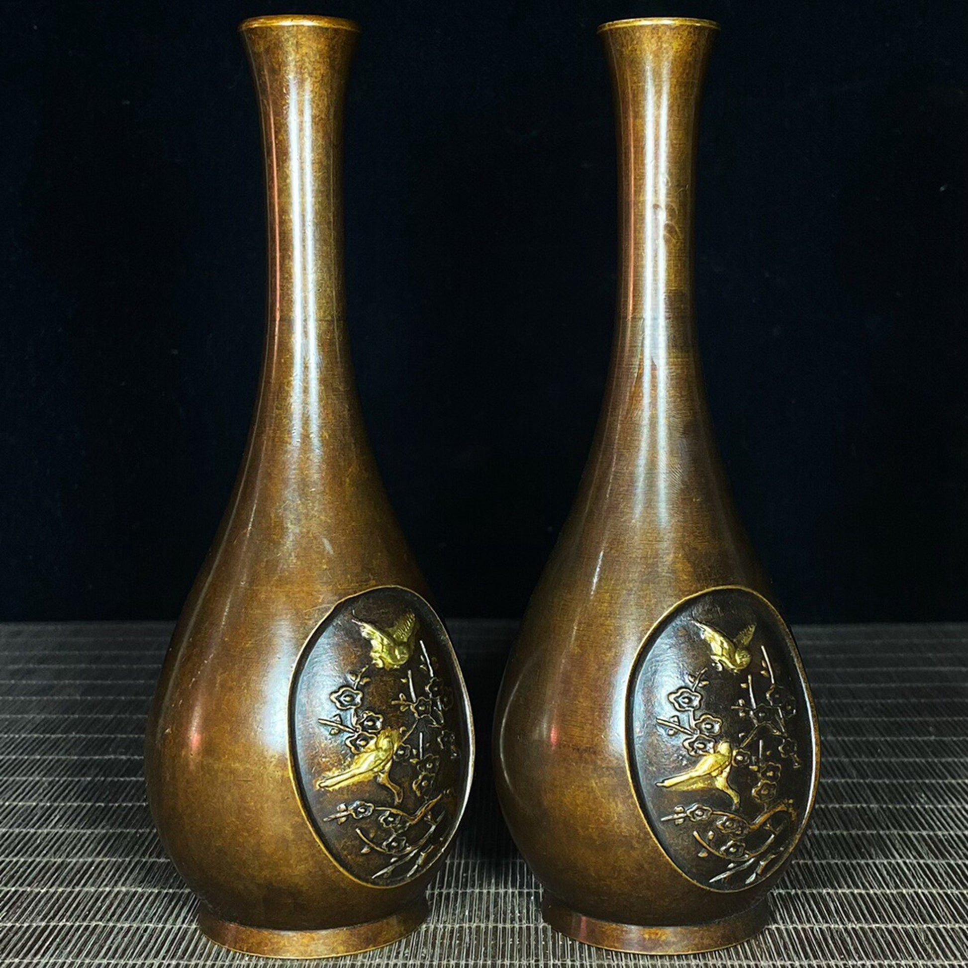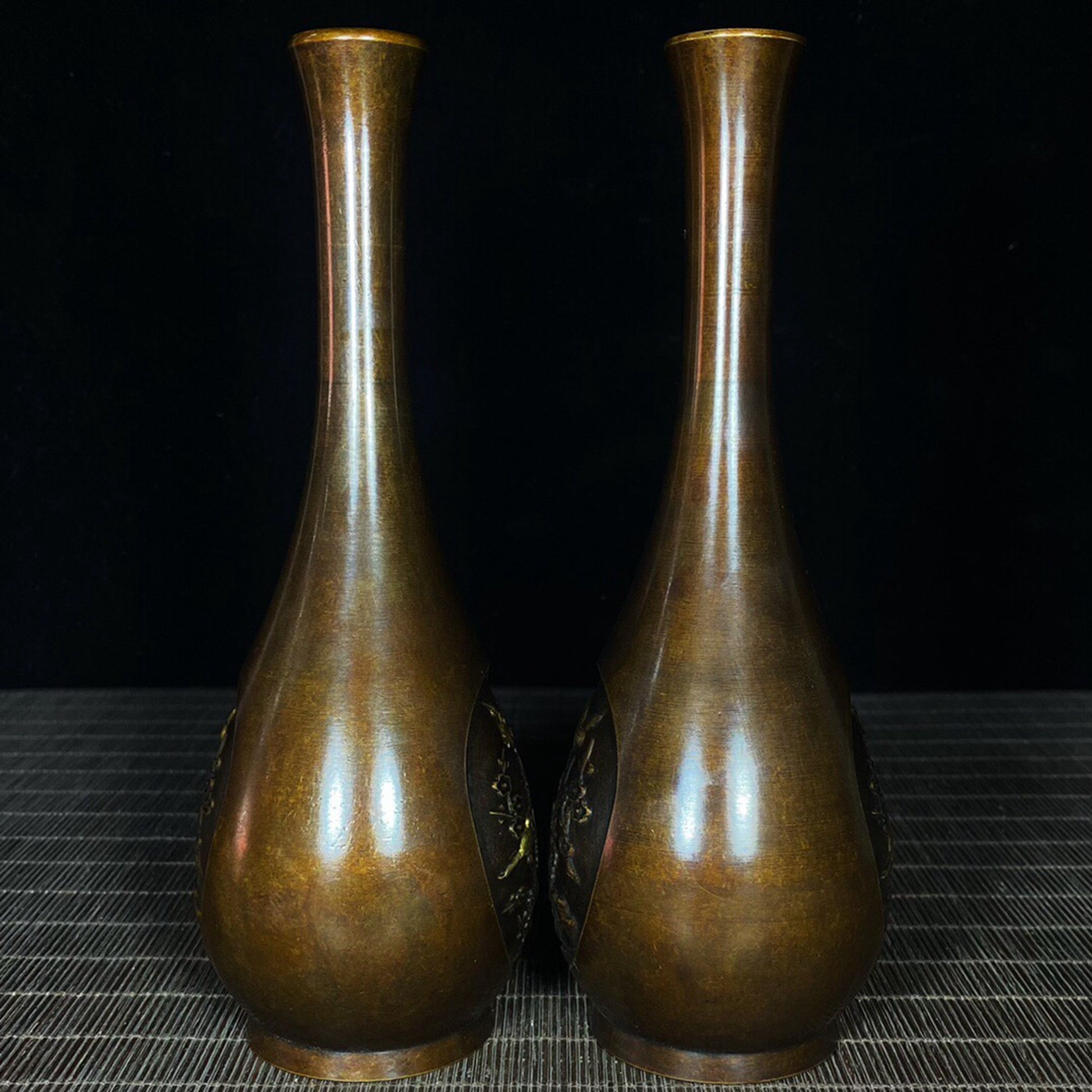 A pair of Chinese antique pure copper joyous eyebrow shaped vases