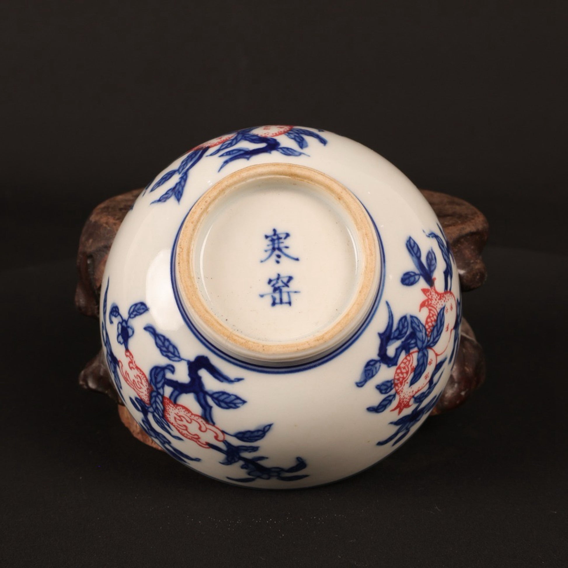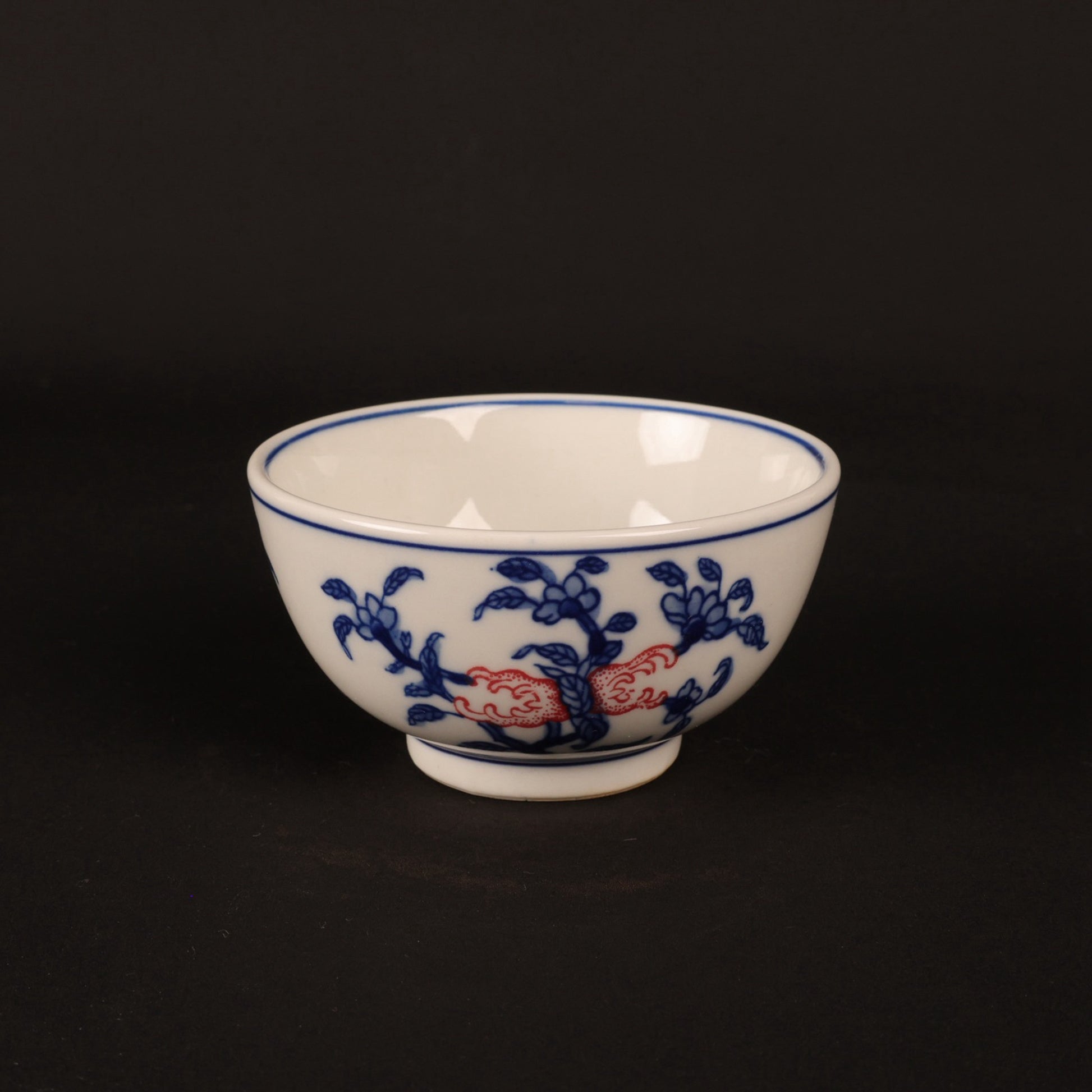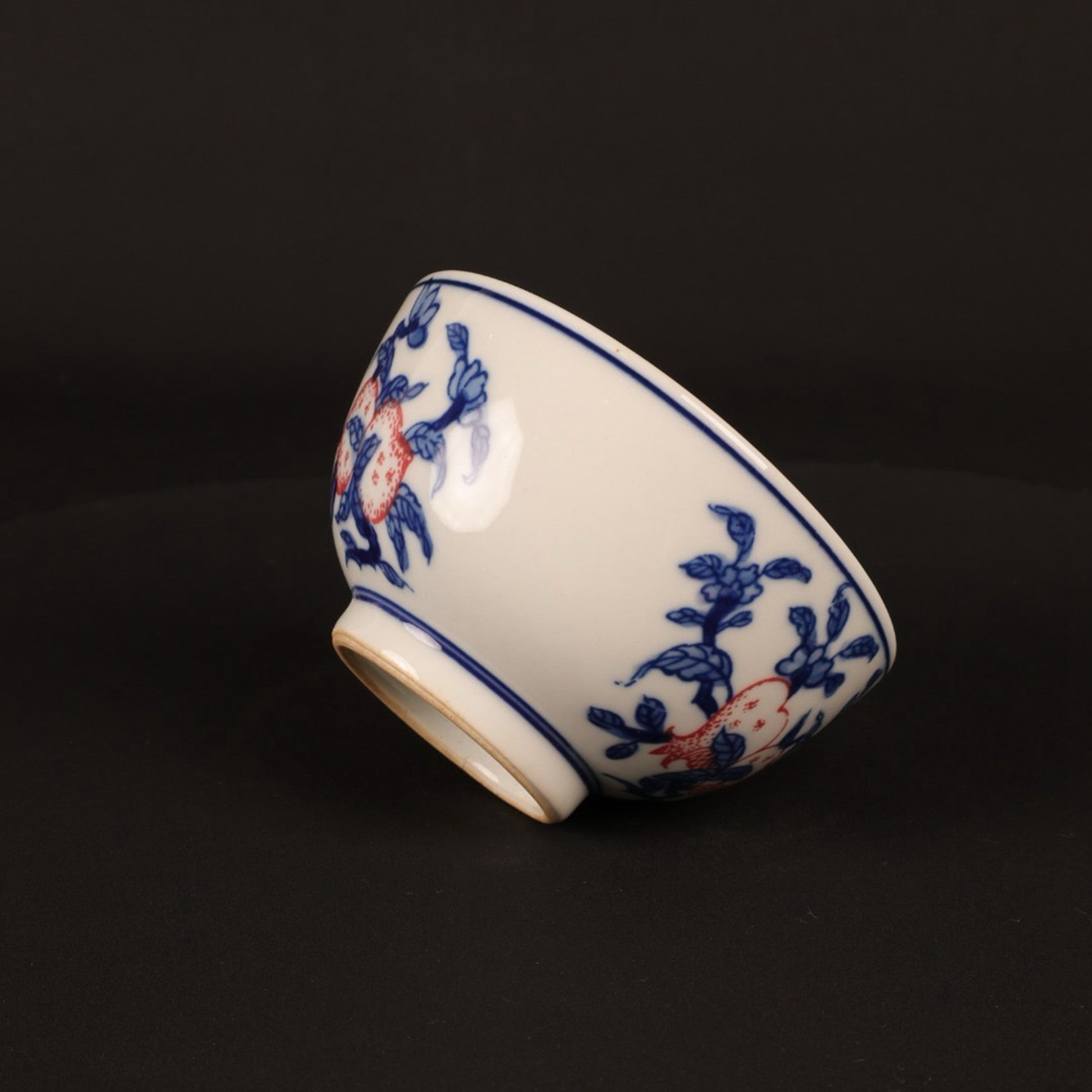 A pair of hand pressure cups with blue and white enamel, red blessings and longevity pictures