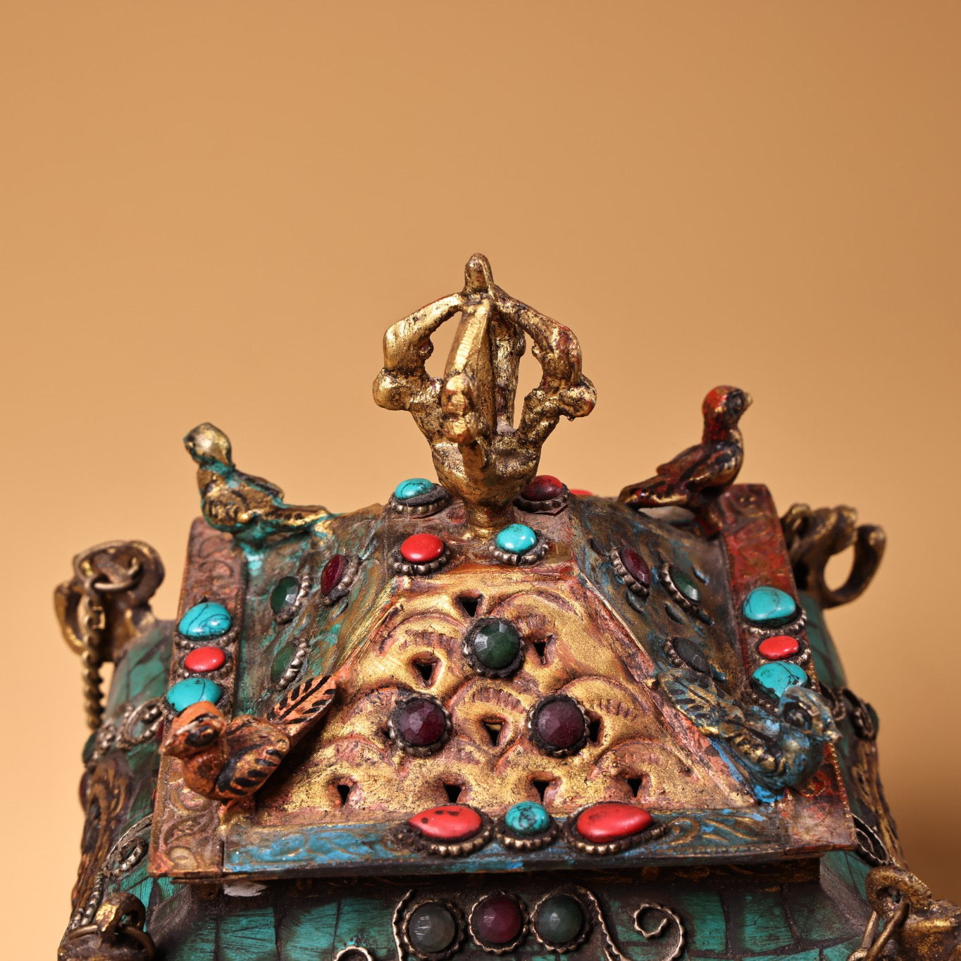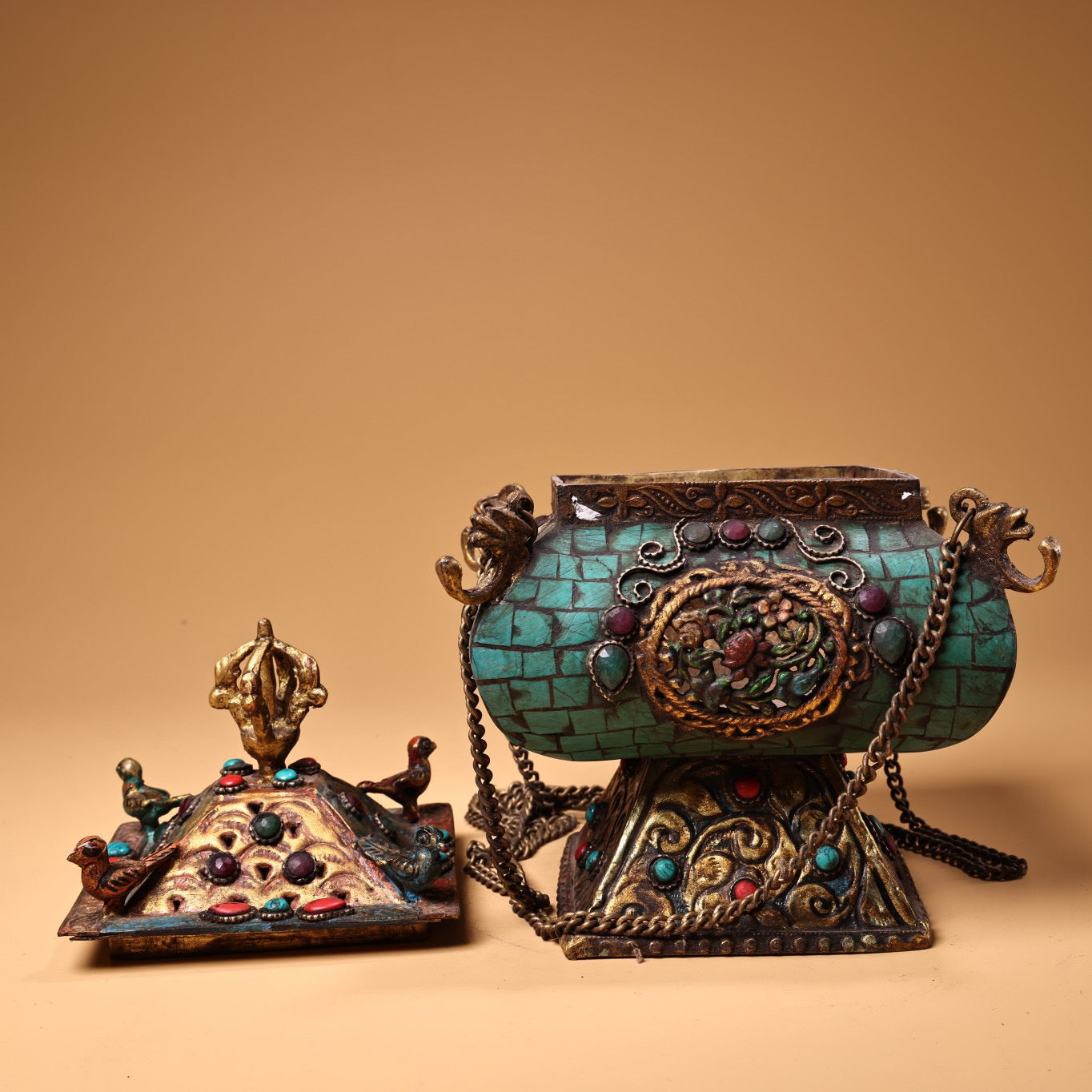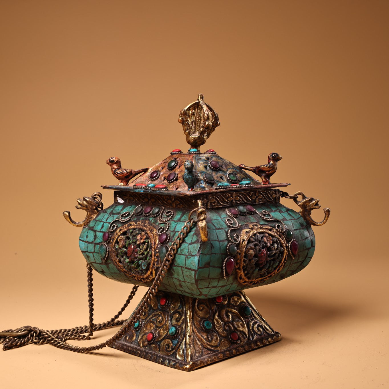 Antique collection, pure copper, Tibetan craftsmanship, inlaid with gemstones, painted with gold, hanging incense burner