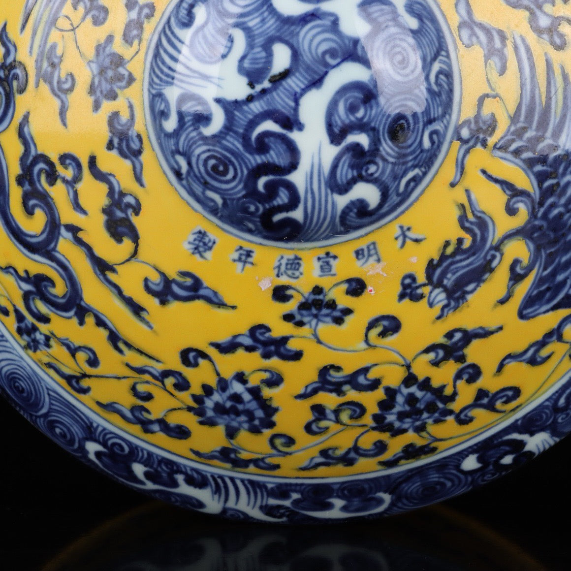 Blue and white glazed double phoenix patterned wall vase with yellow glaze