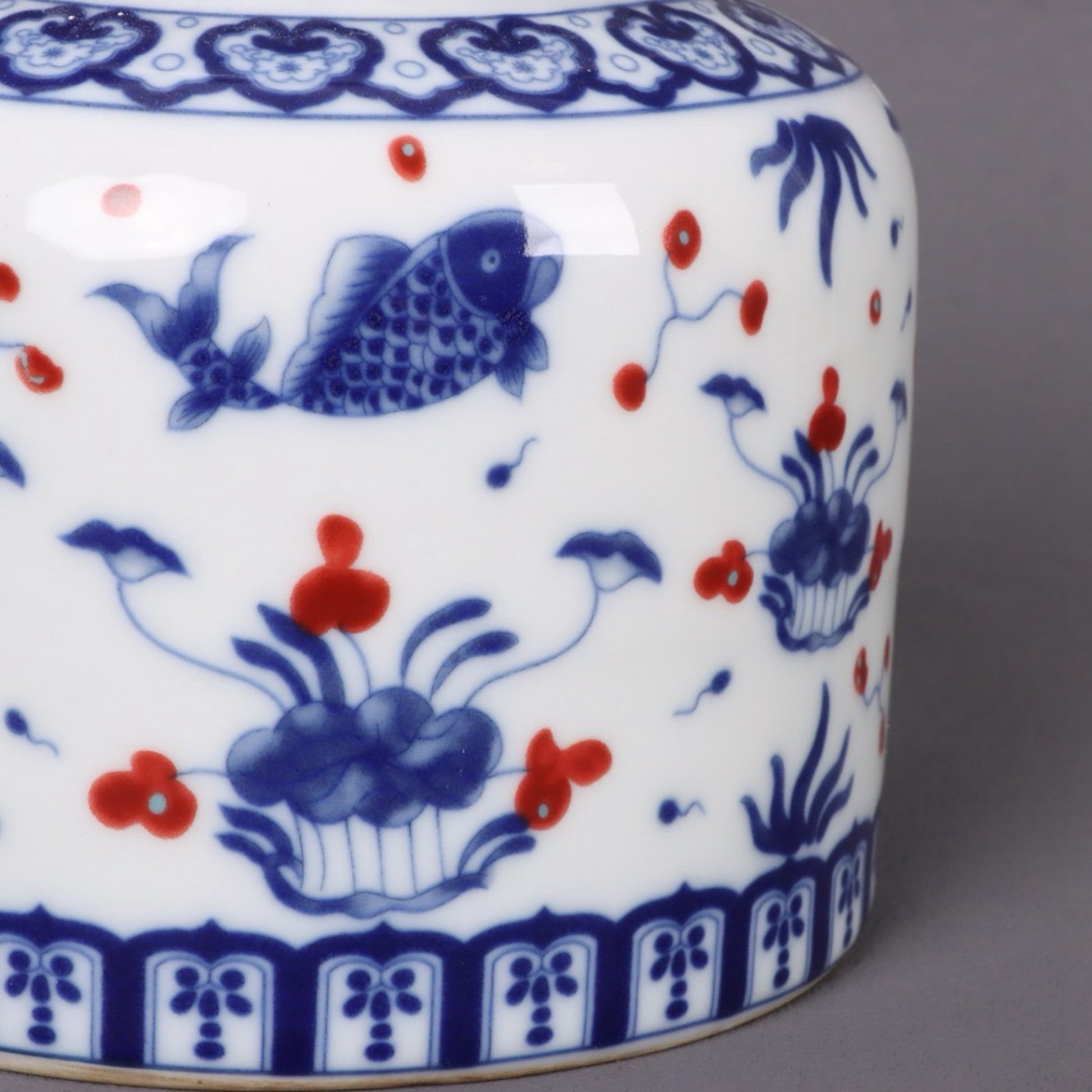 Blue and white glazed red fish algae patterned tea jar