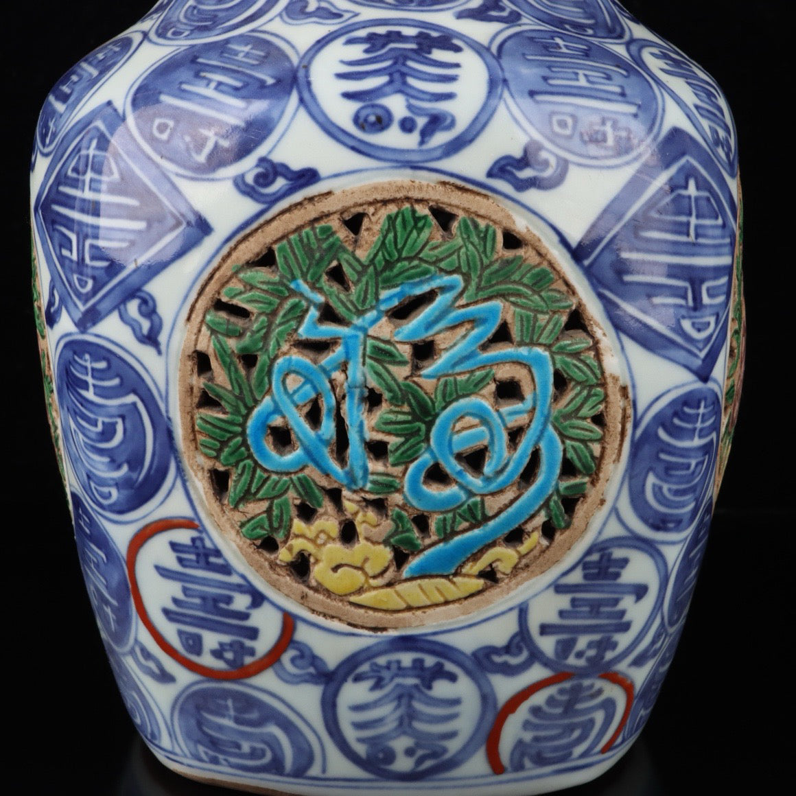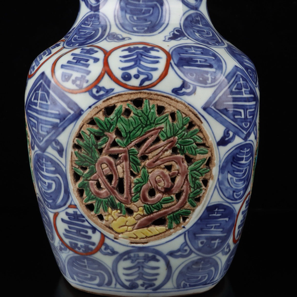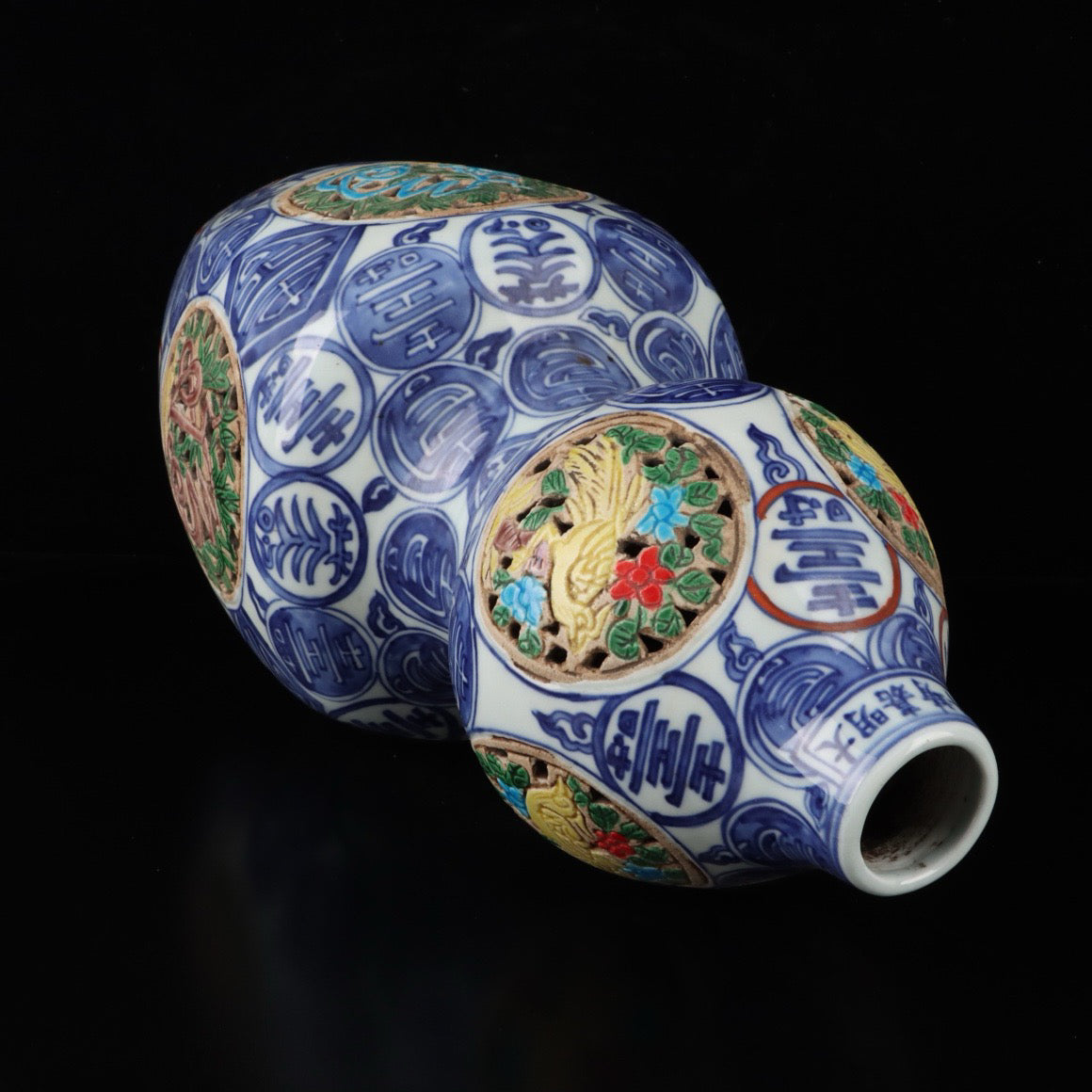 Blue and white hollowed out gourd vase with colorful longevity patterns