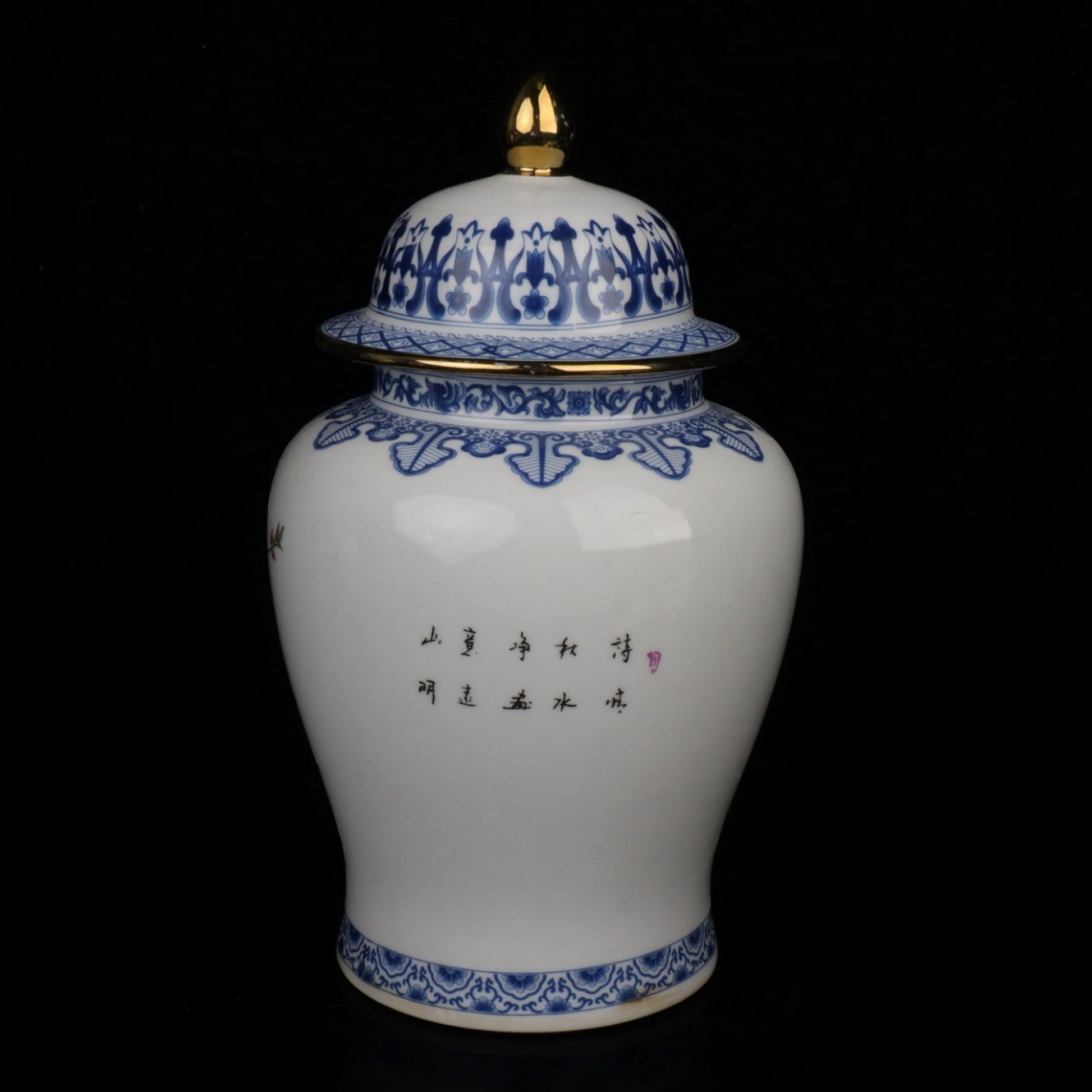Blue and white jar with colorful bird songs and floral fragrance patterns