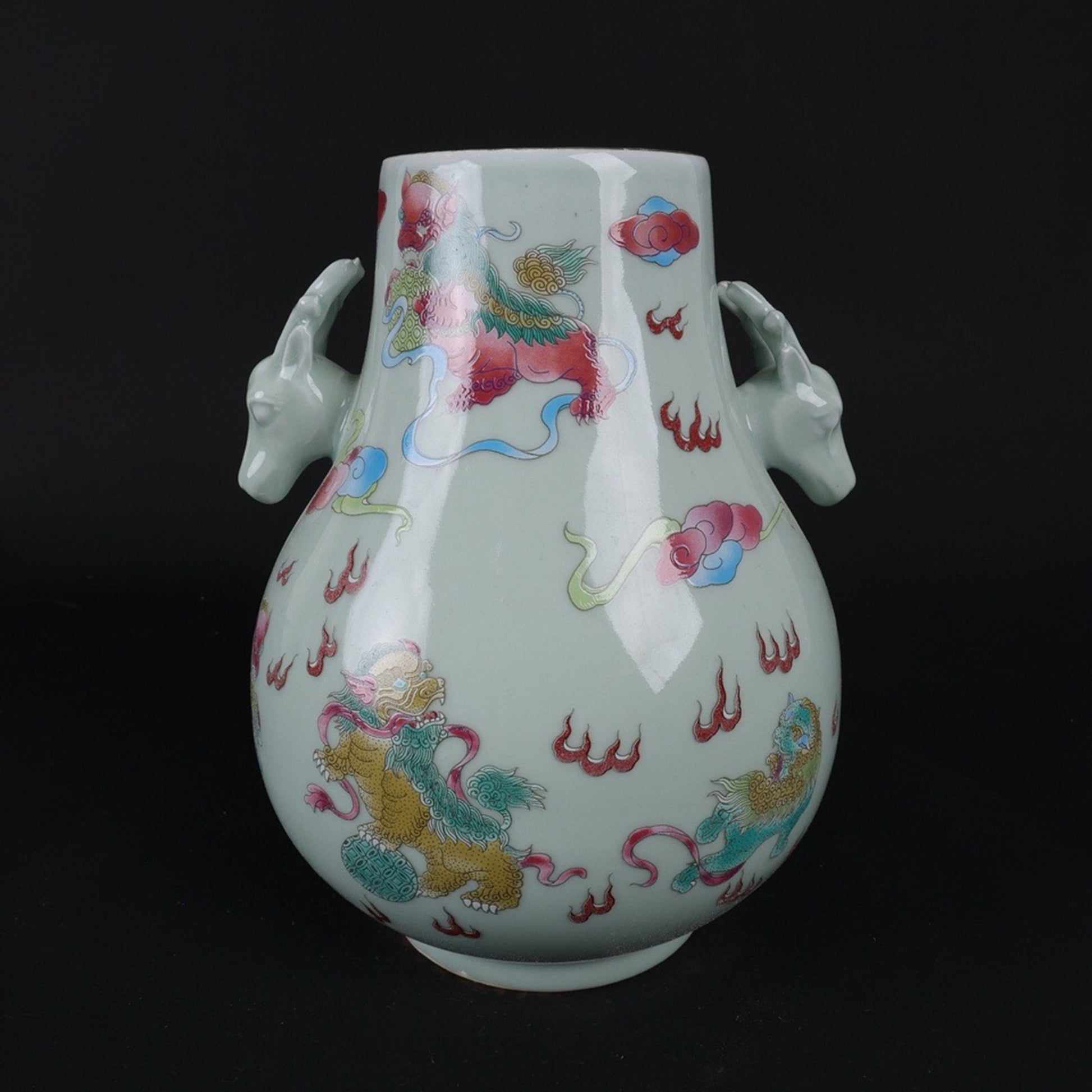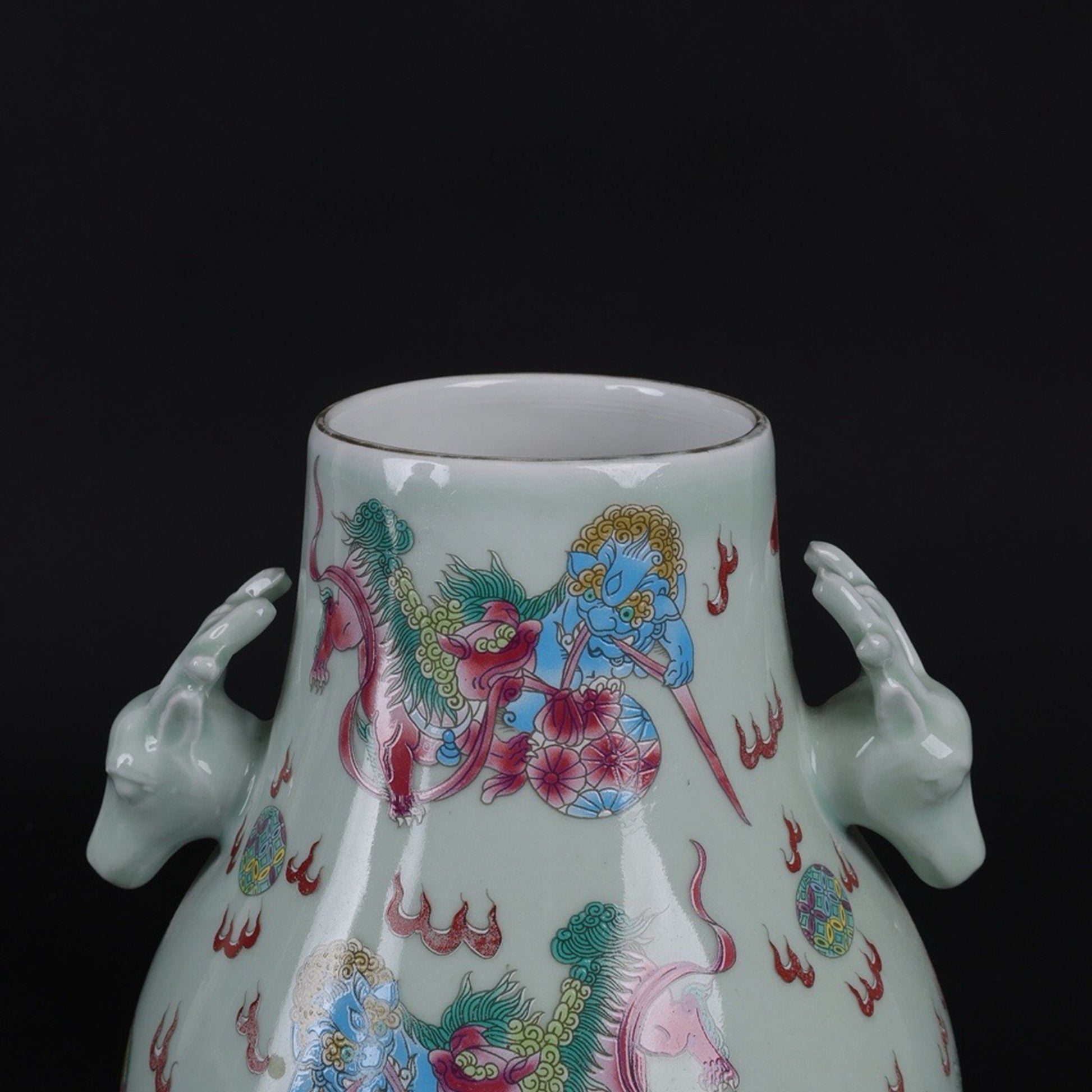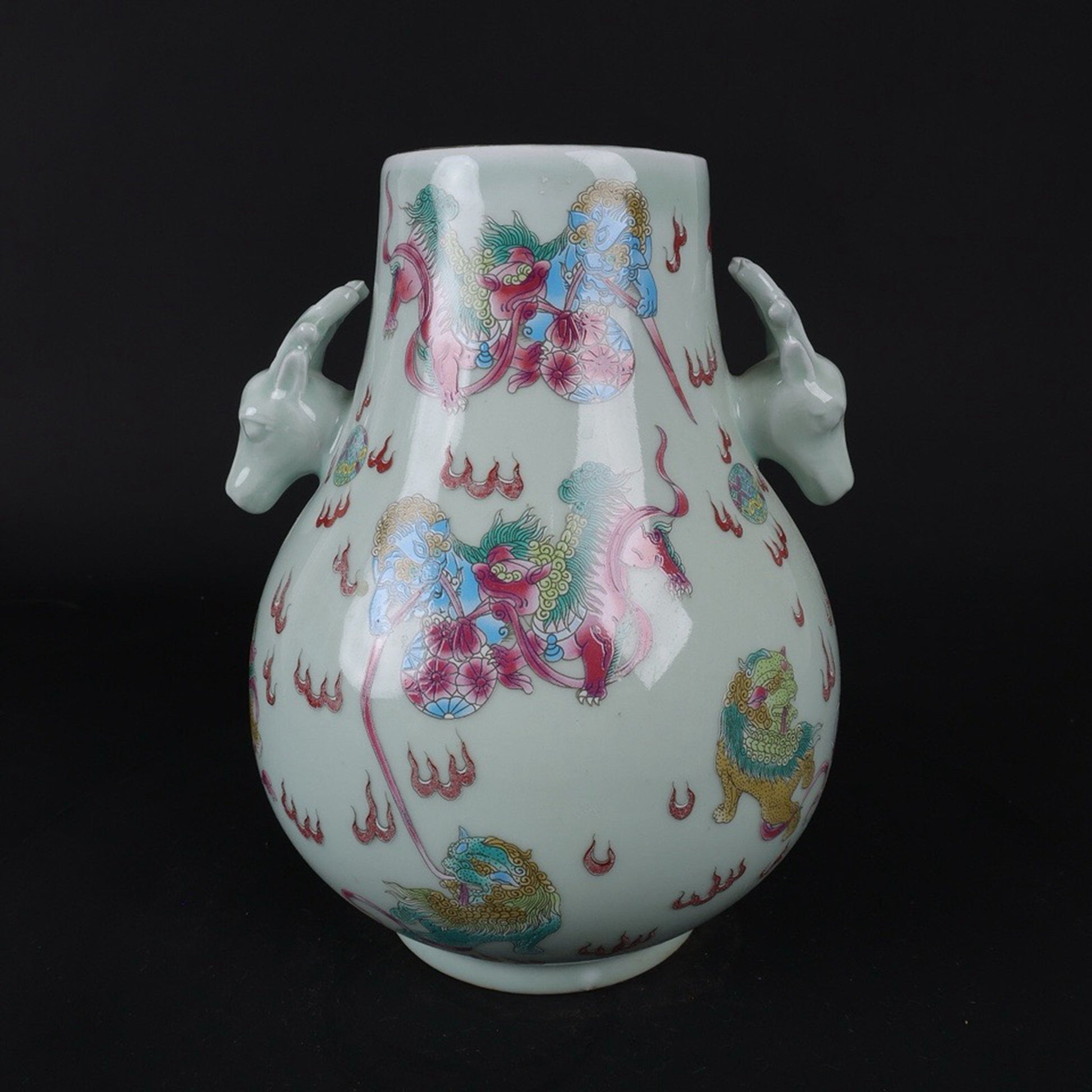 Blue glazed pink lion patterned sheep head statue