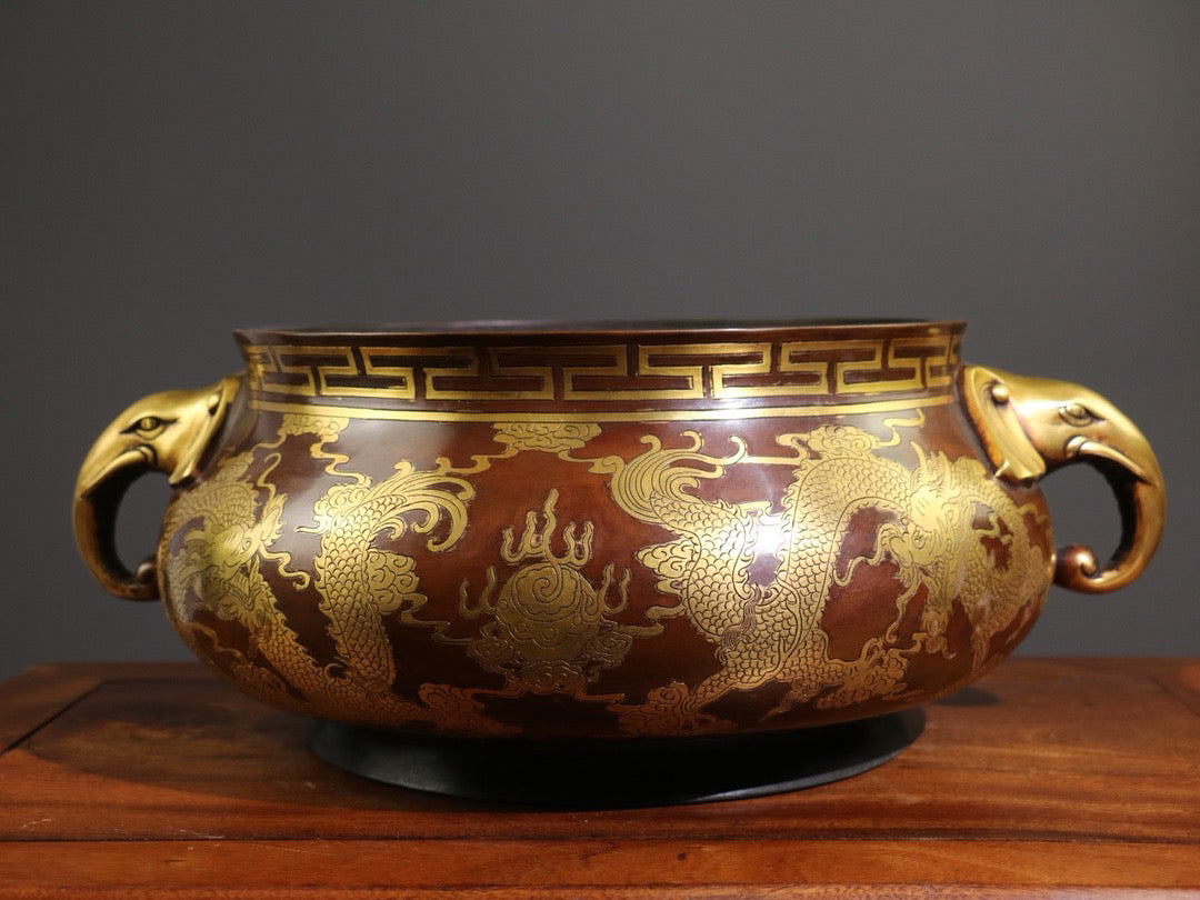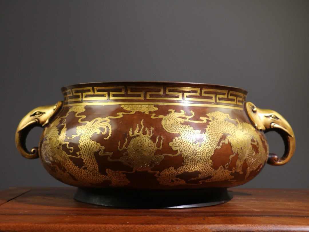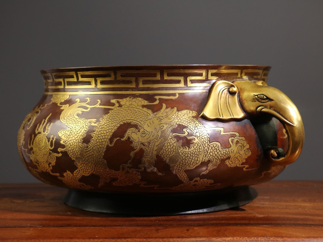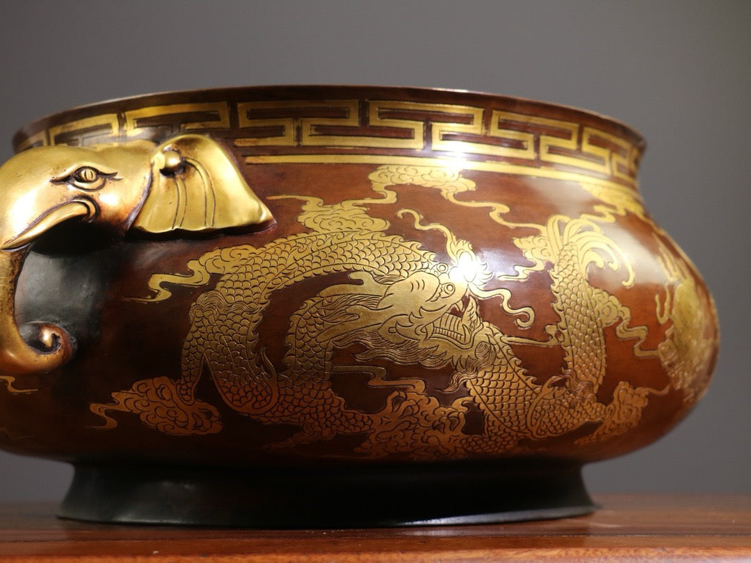 [Carving gluttonous patterns (double dragons playing with pearls), elephant trunk, double ears, large incense burner]