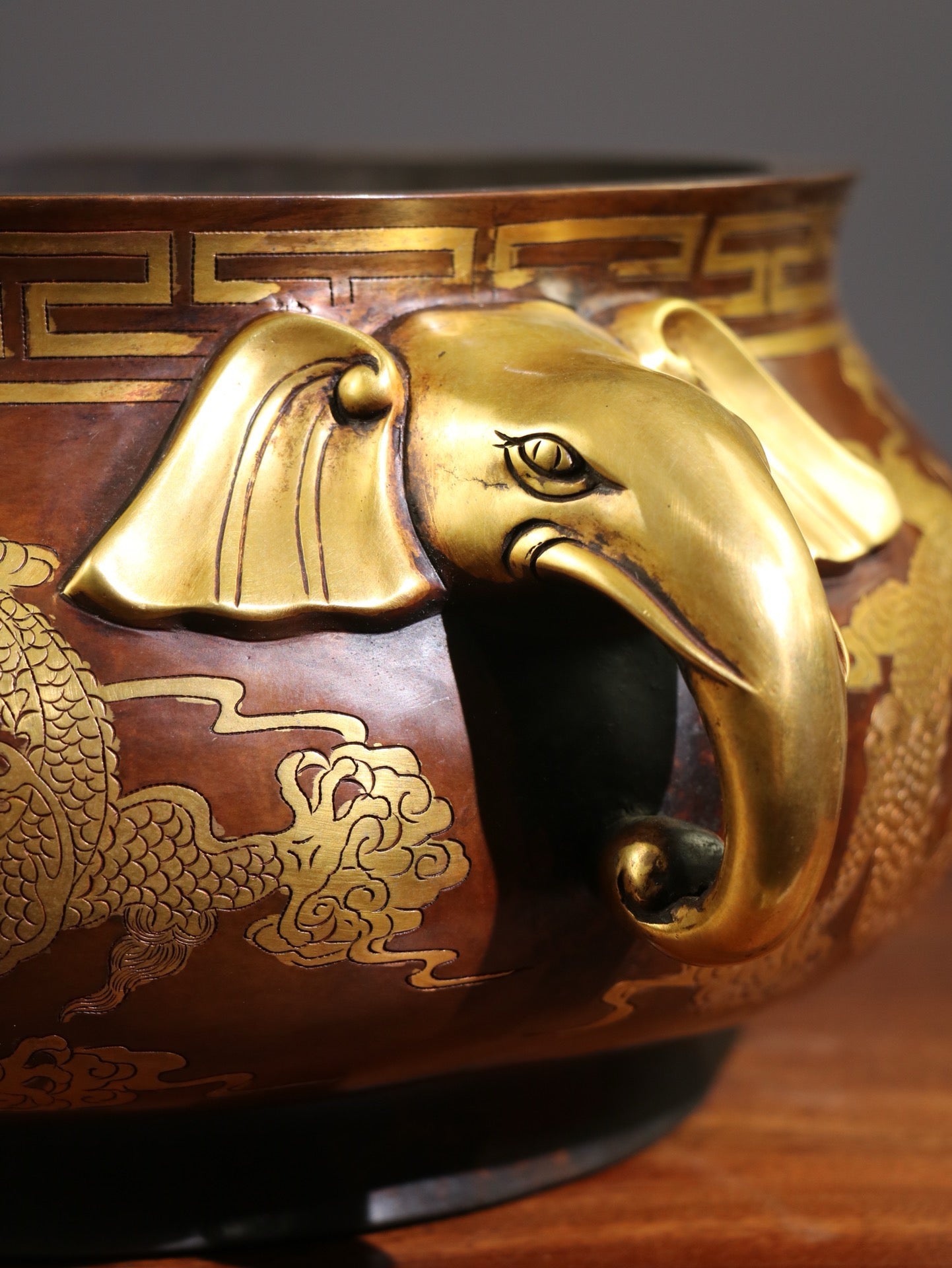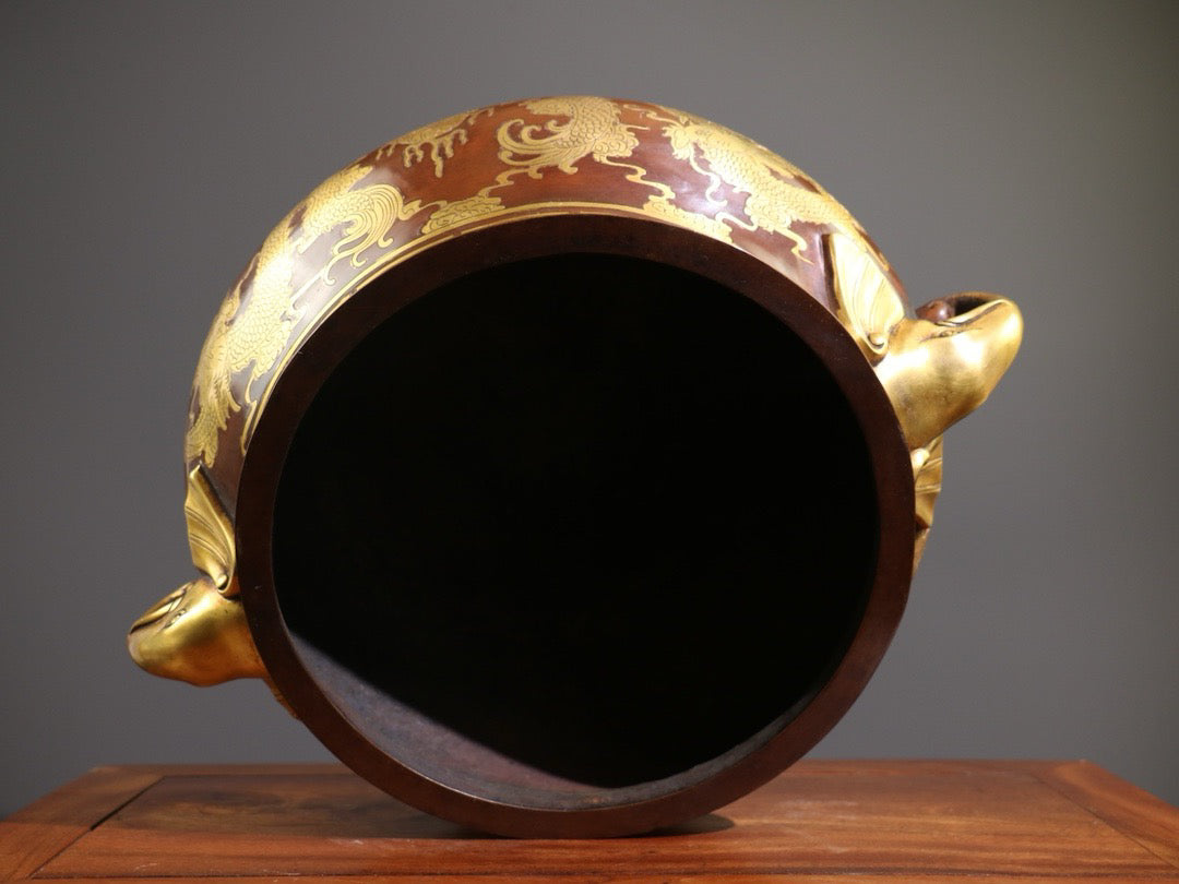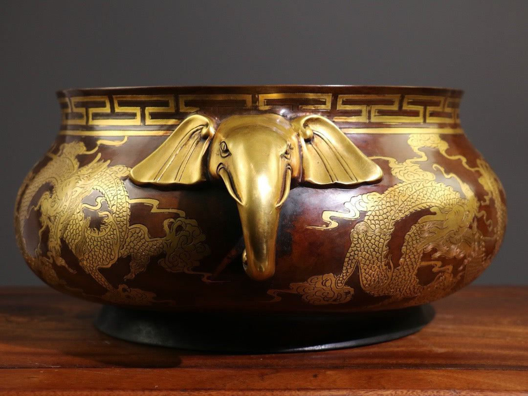 [Carving gluttonous patterns (double dragons playing with pearls), elephant trunk, double ears, large incense burner]
