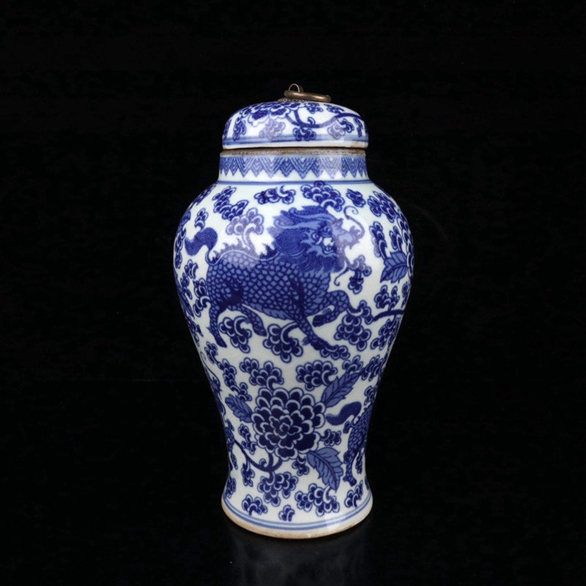 Ceramic blue and white Kirin patterned lid jar