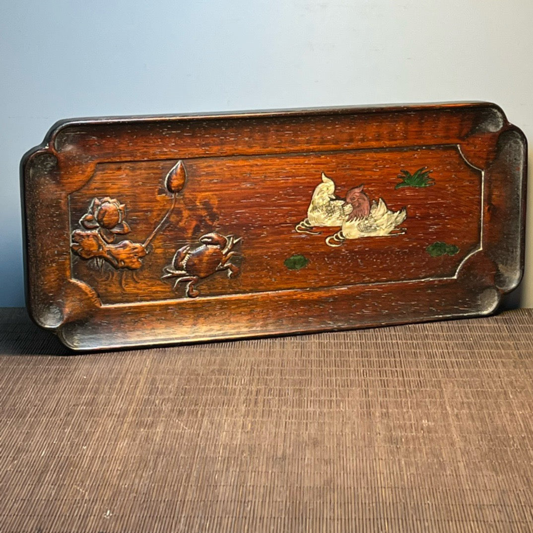 Chinese antique blood sandalwood inlaid with seashell carved tea plate ornaments