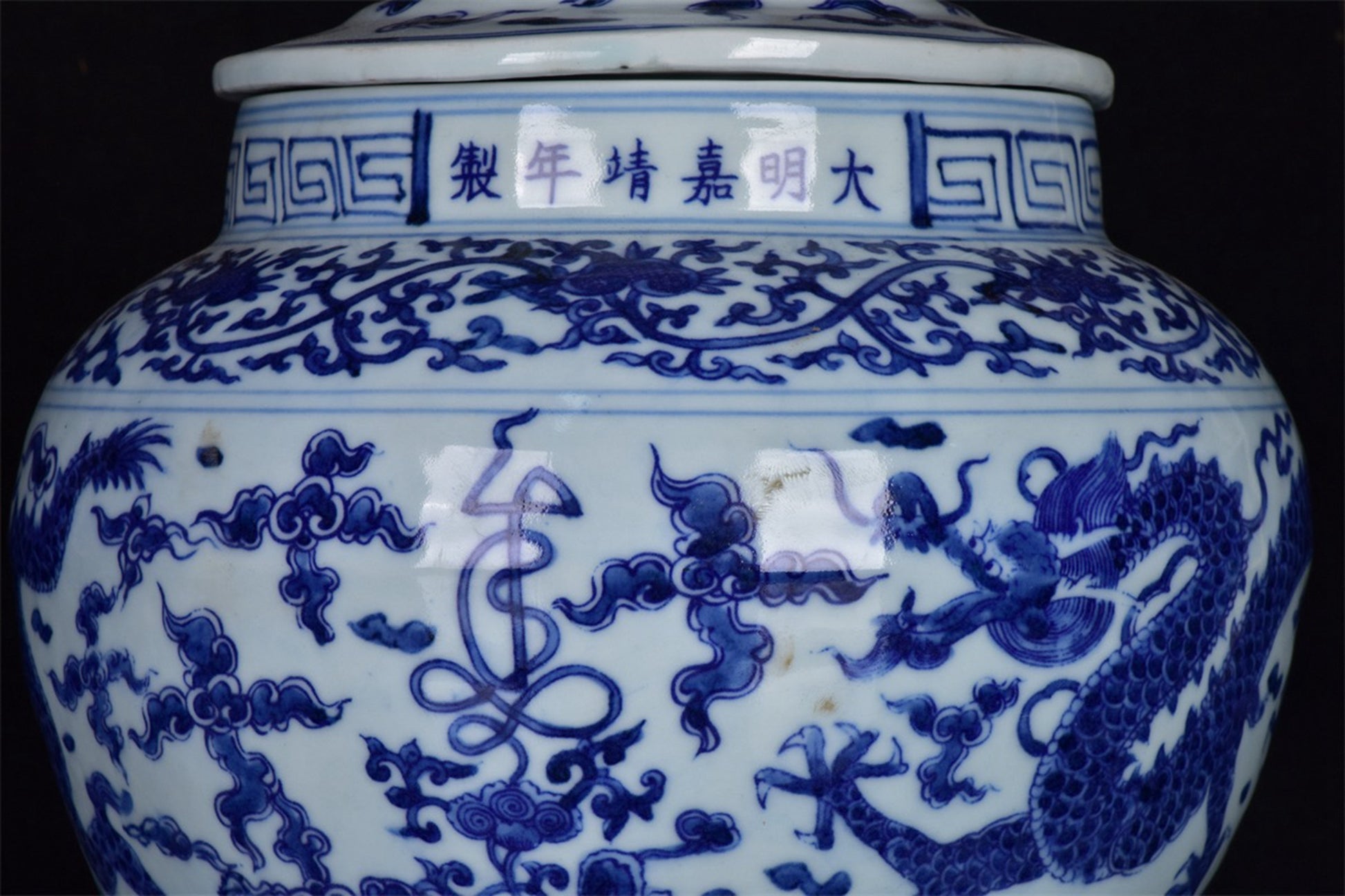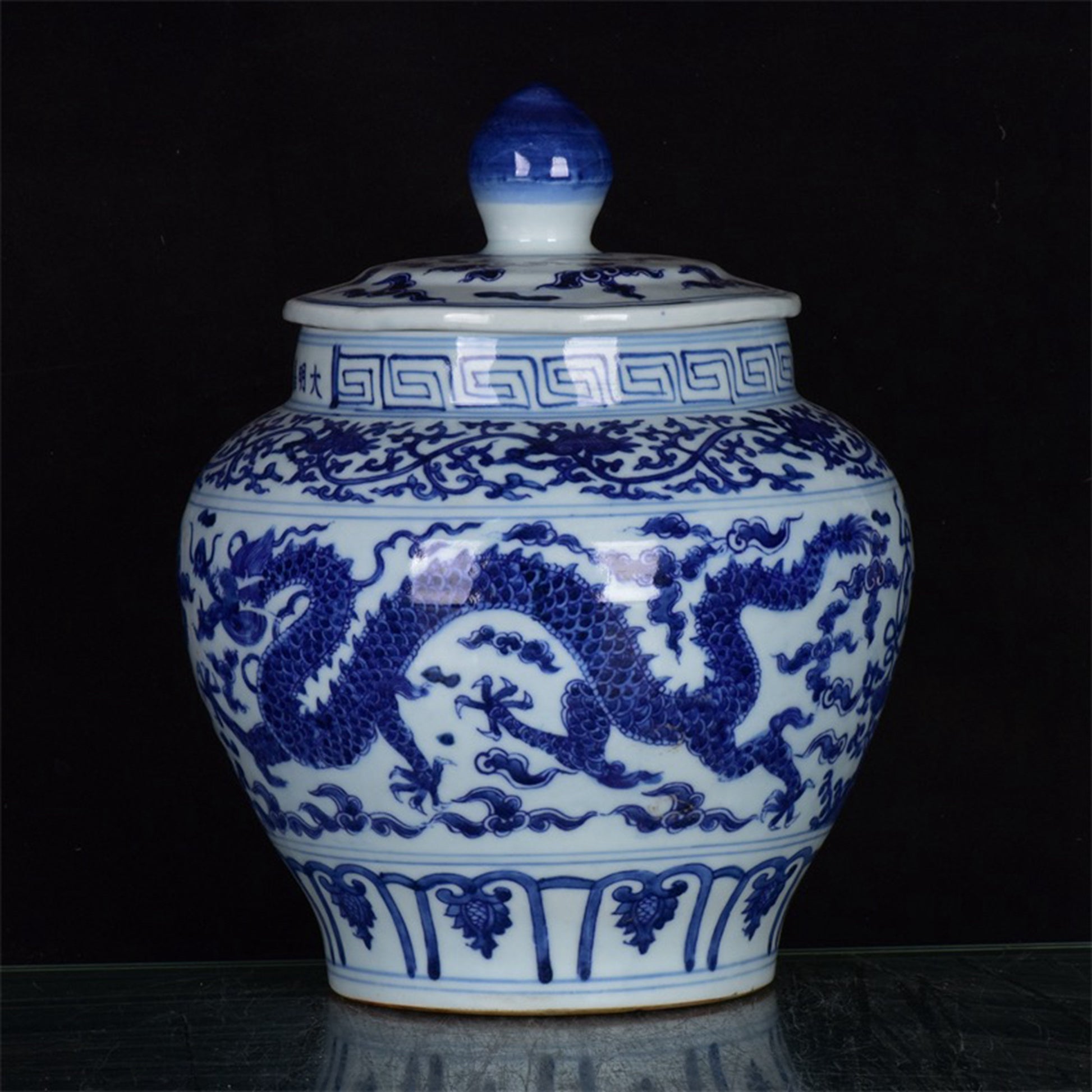 Chinese antique blue and white auspicious cloud dragon patterned lid jar