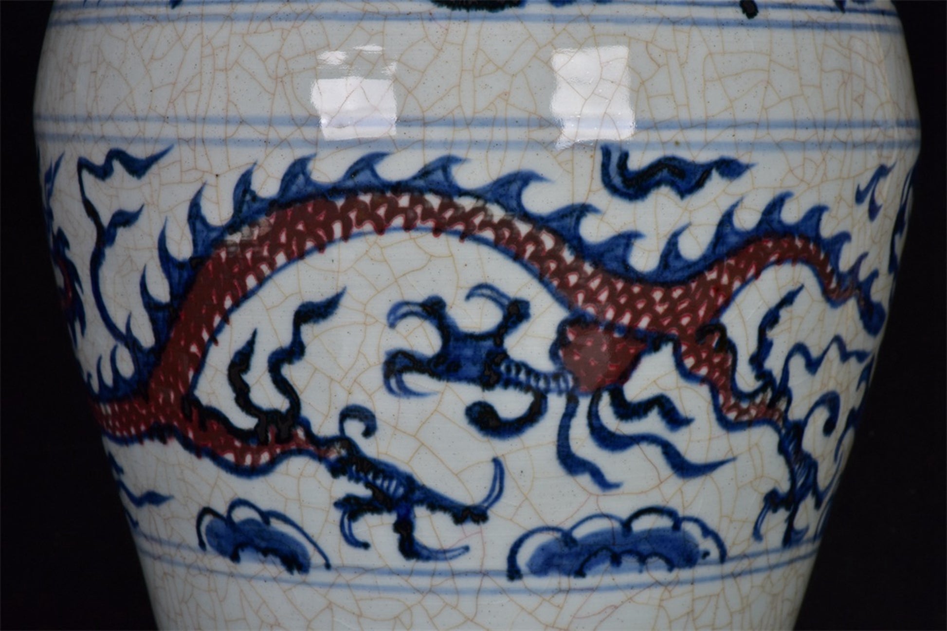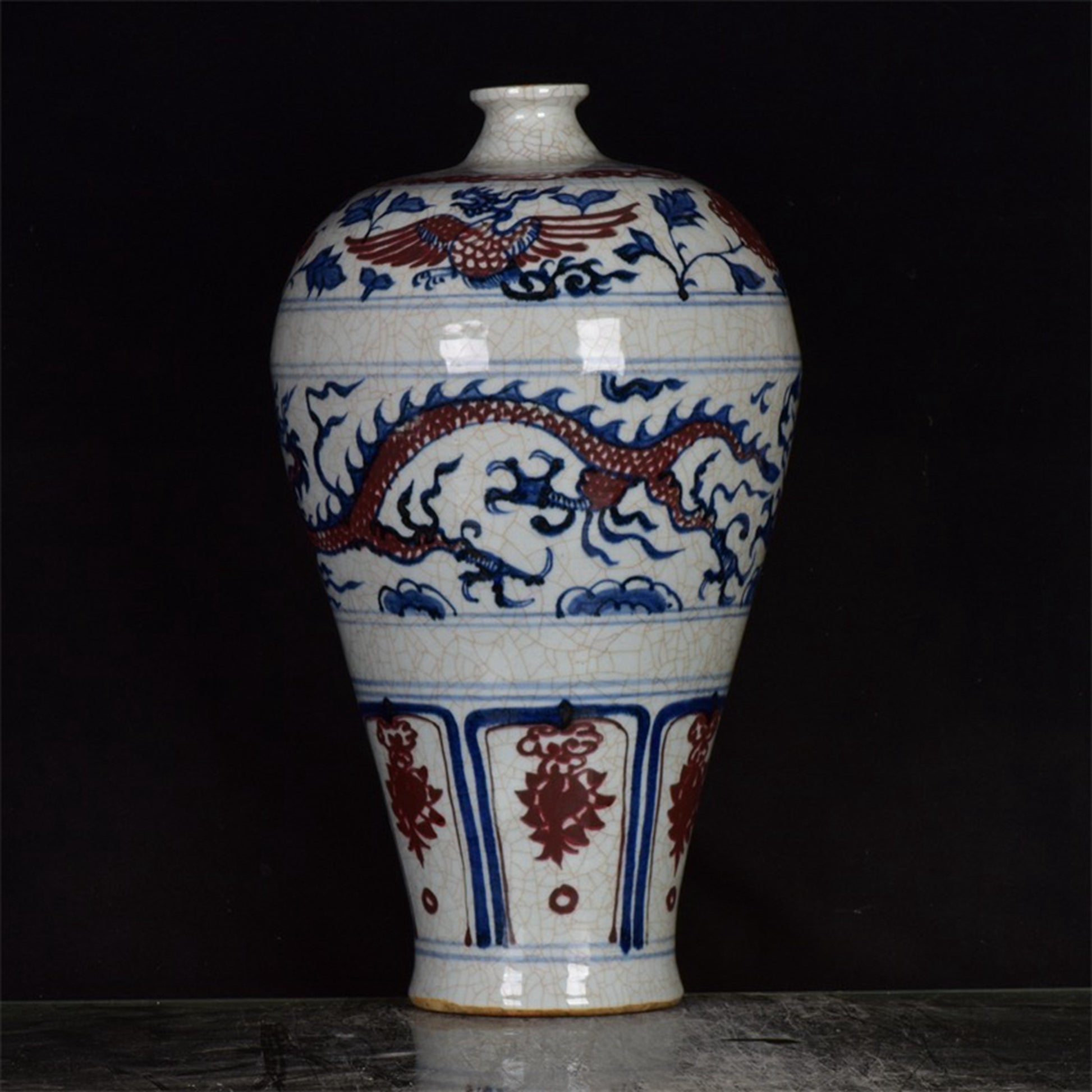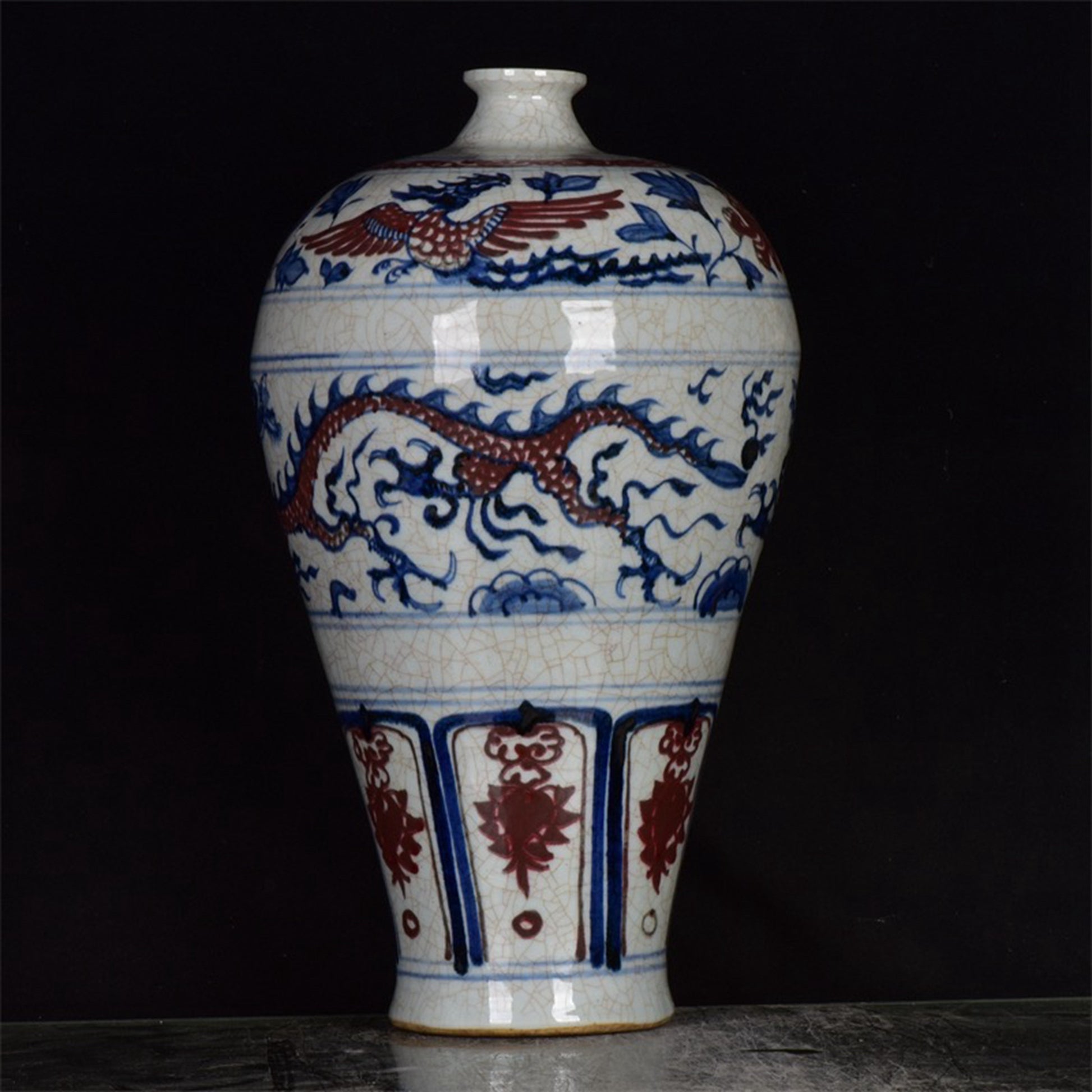 Chinese antique blue and white glazed red dragon patterned open leaf plum vase