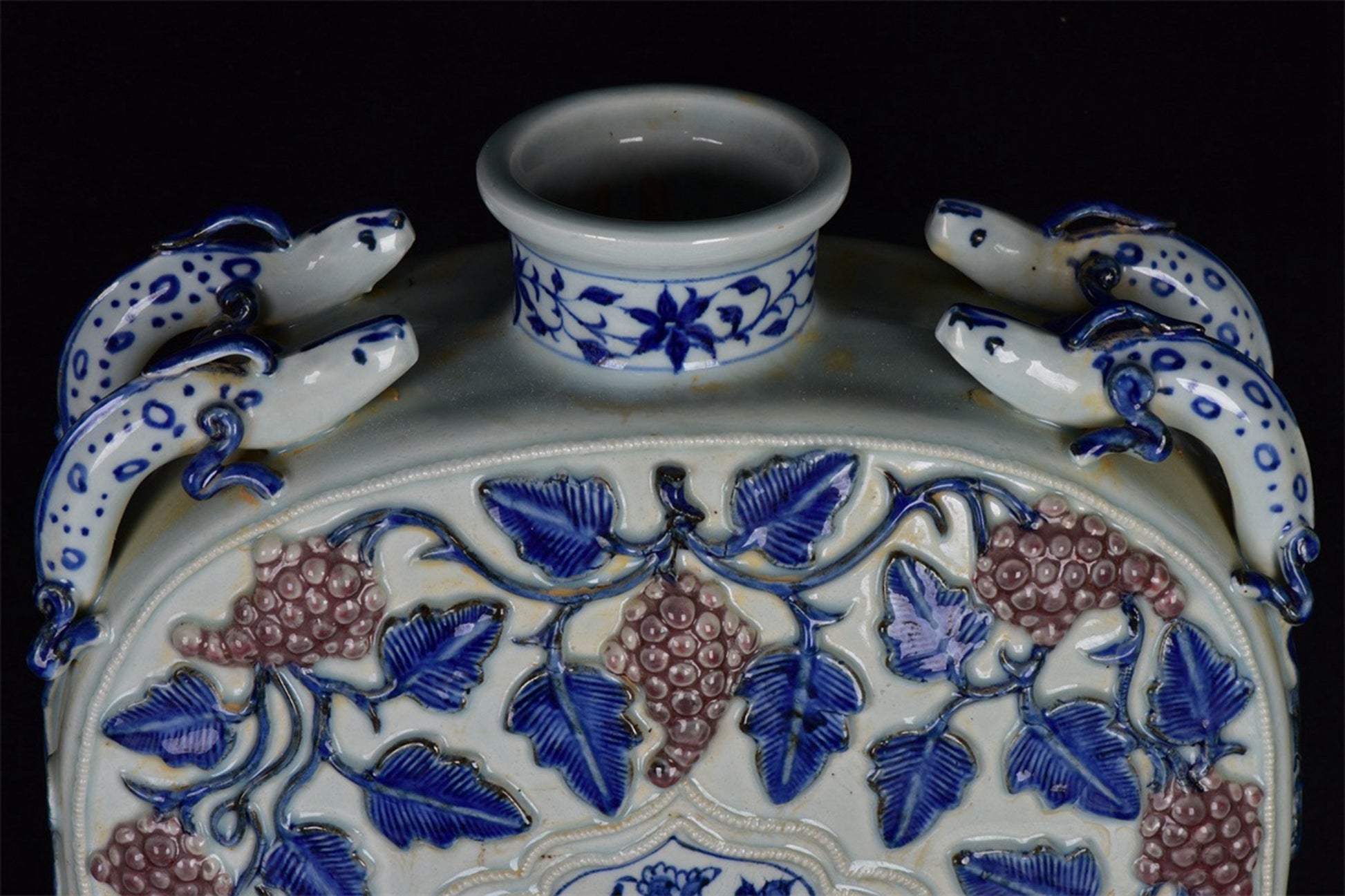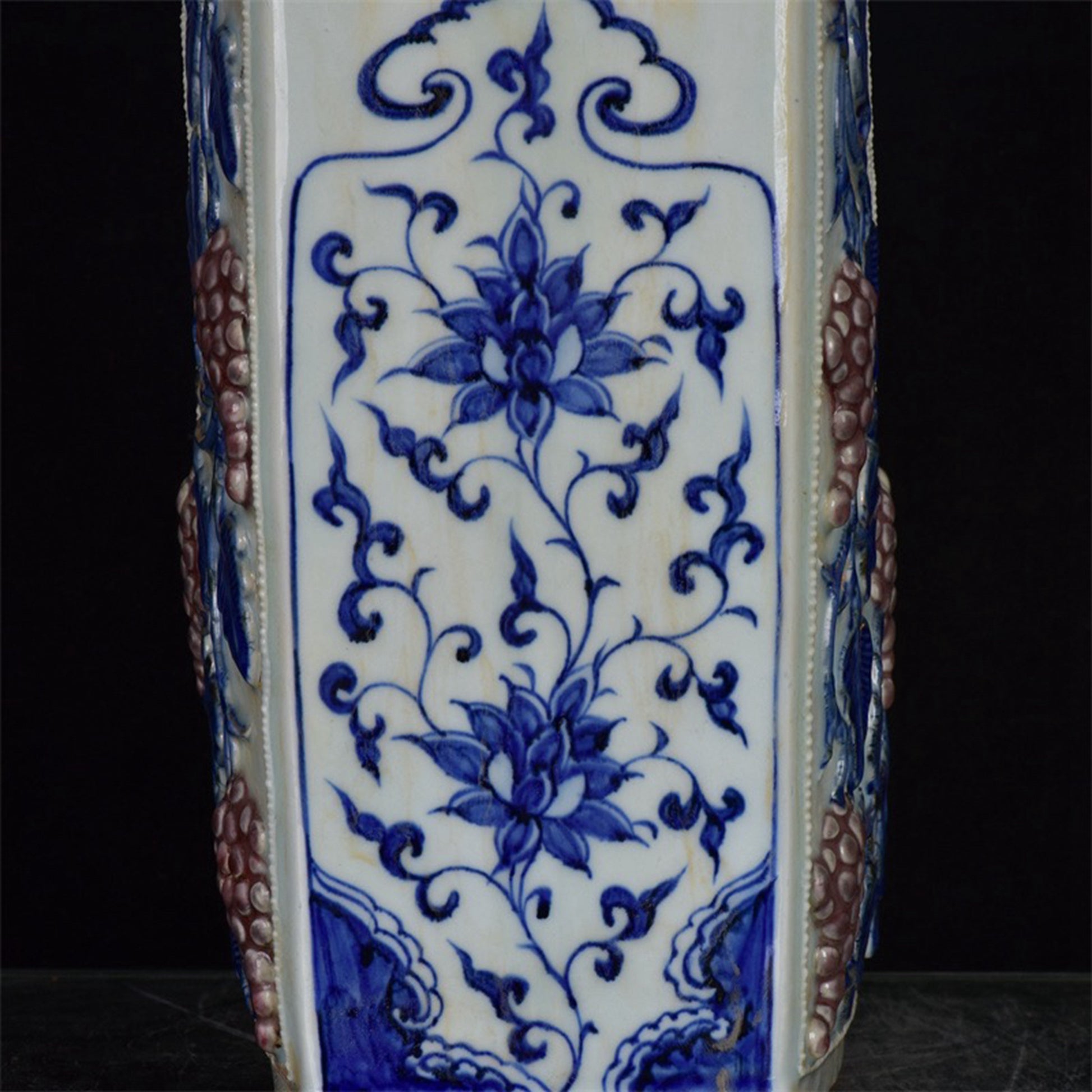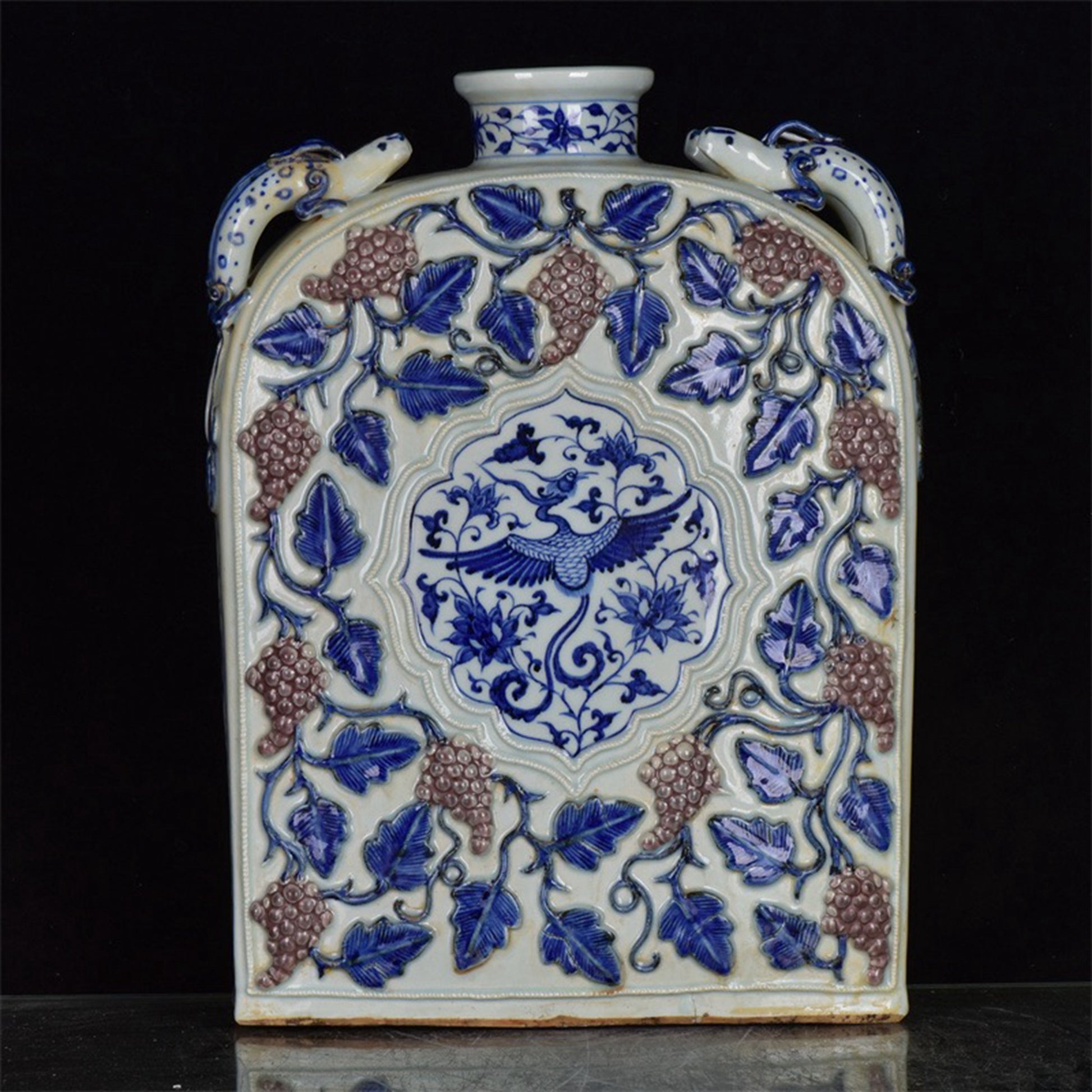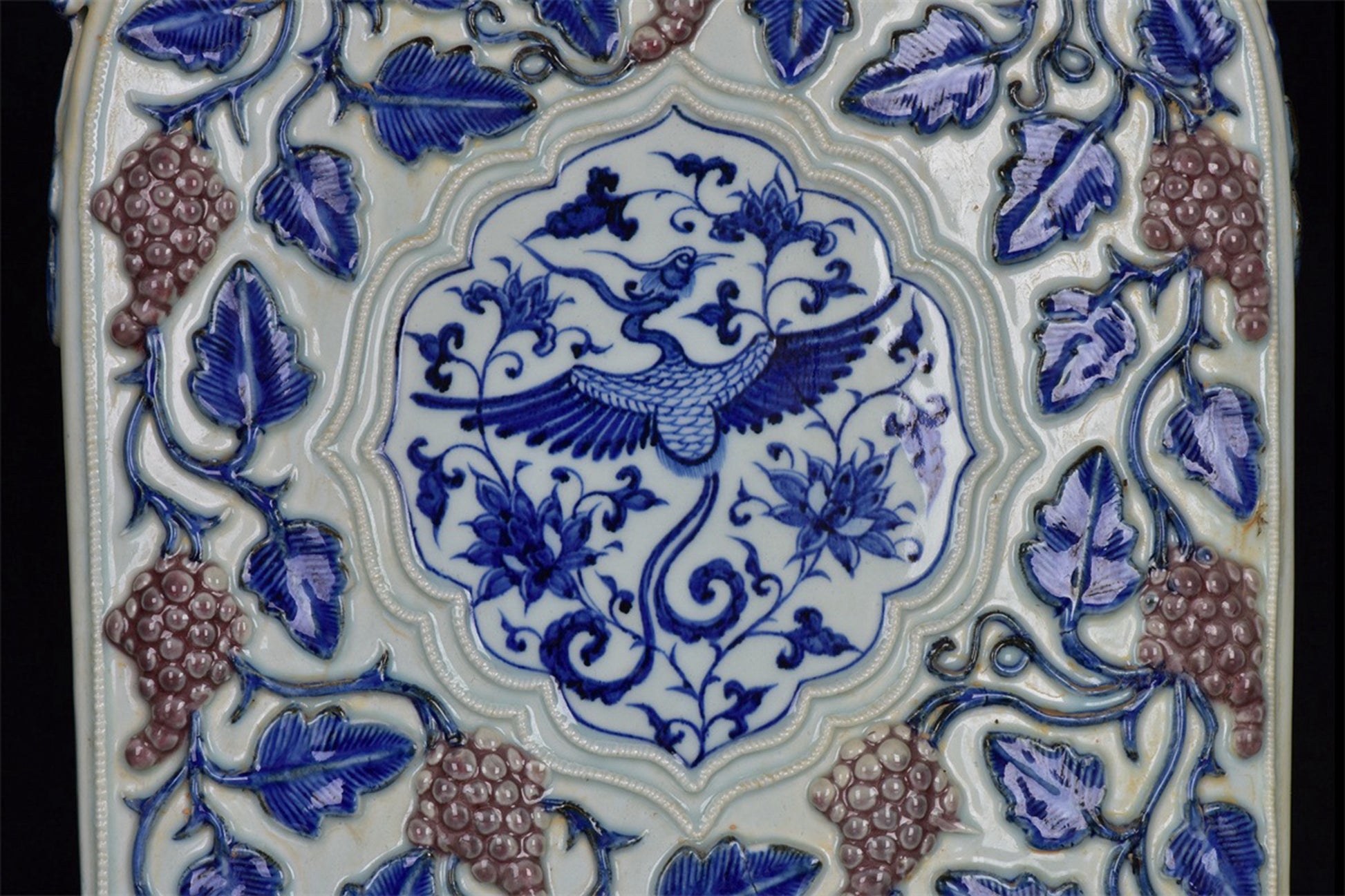 Chinese antique blue and white glazed red relief bottle with multiple grape patterns and a square shape