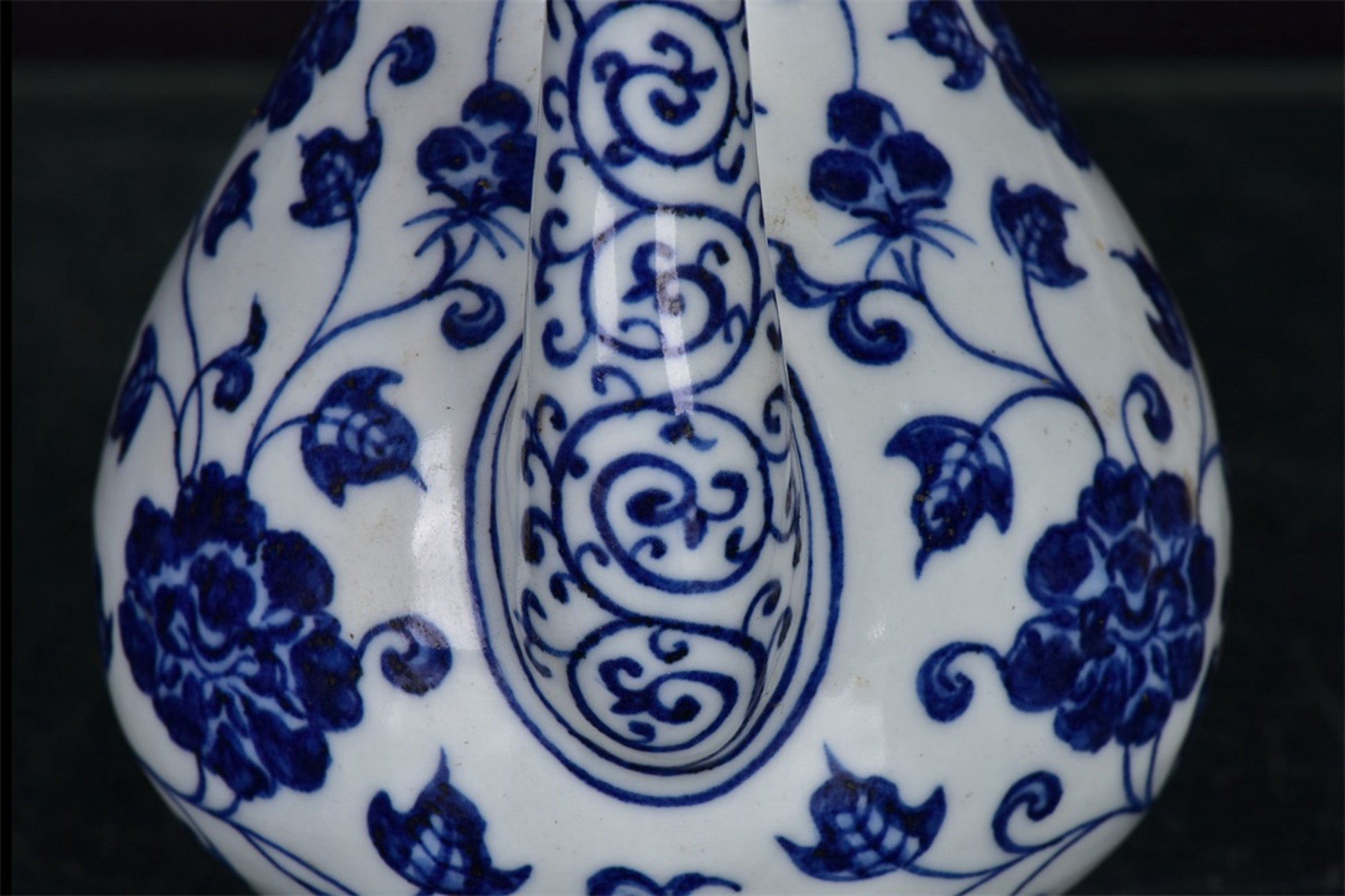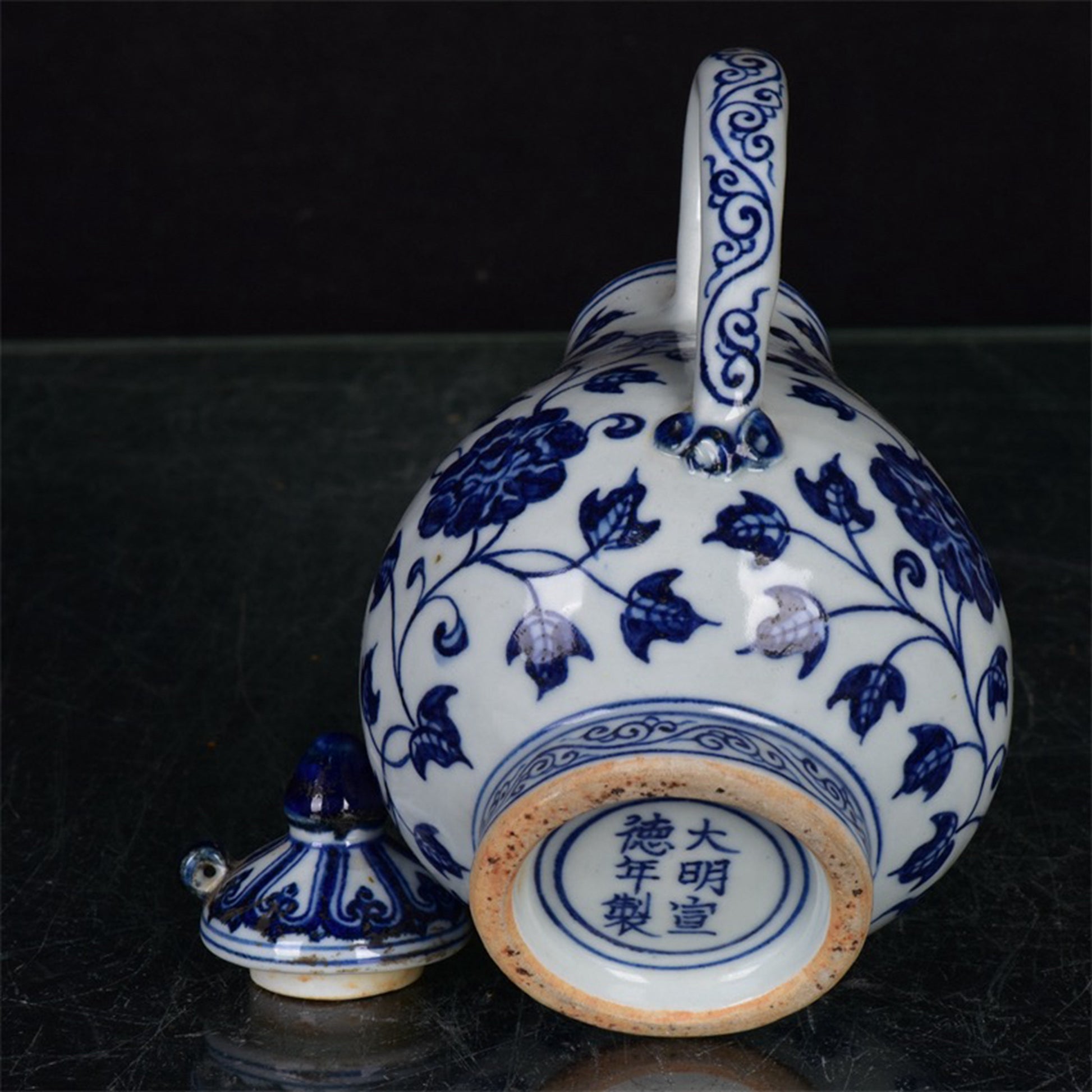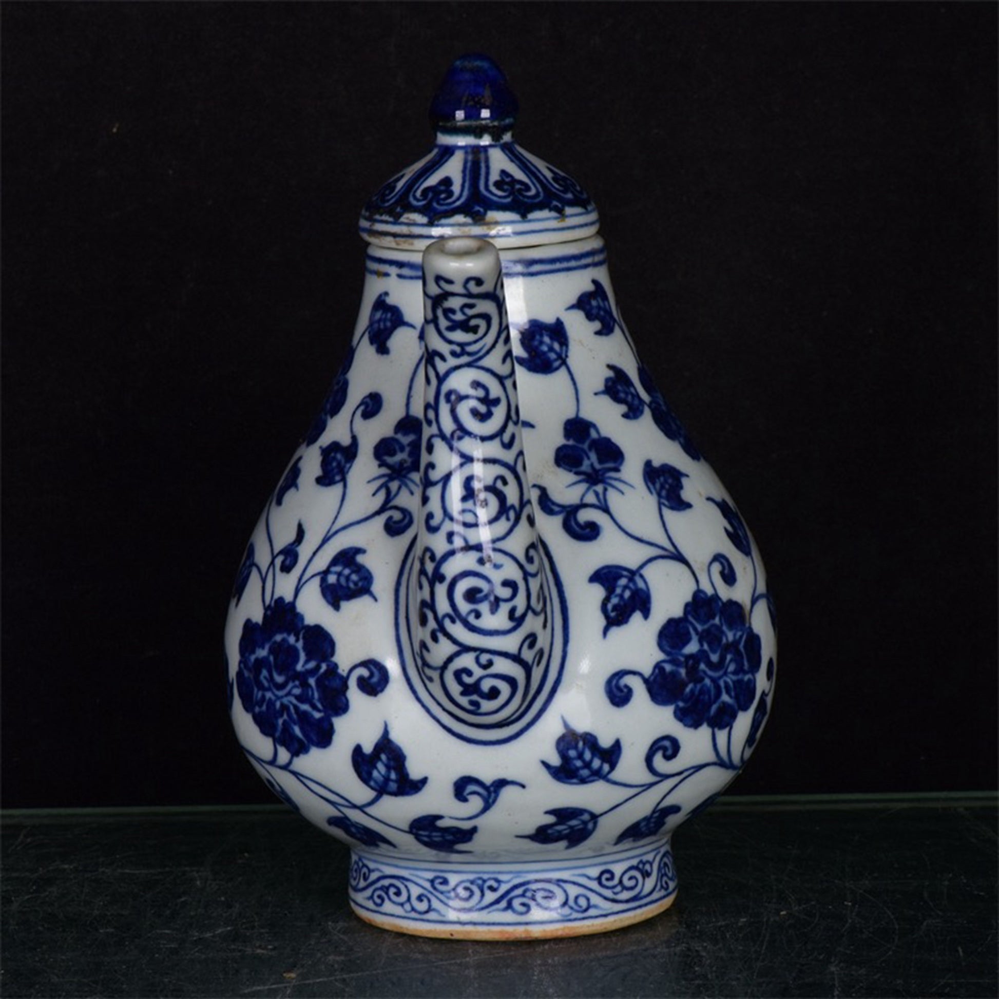 Chinese antique blue and white pear shaped teapot with tangled branches and floral patterns