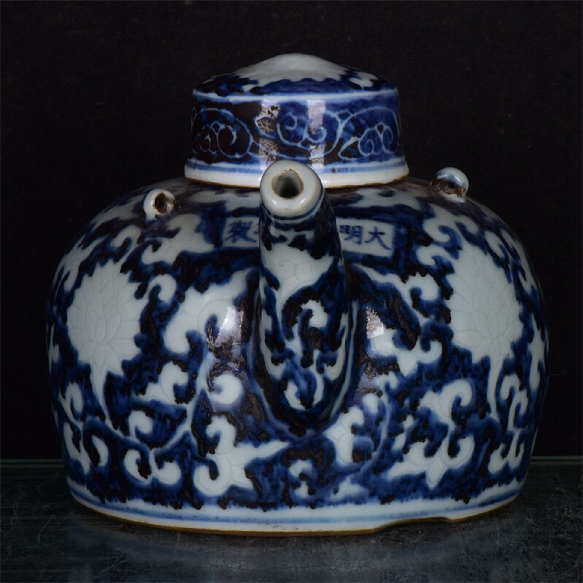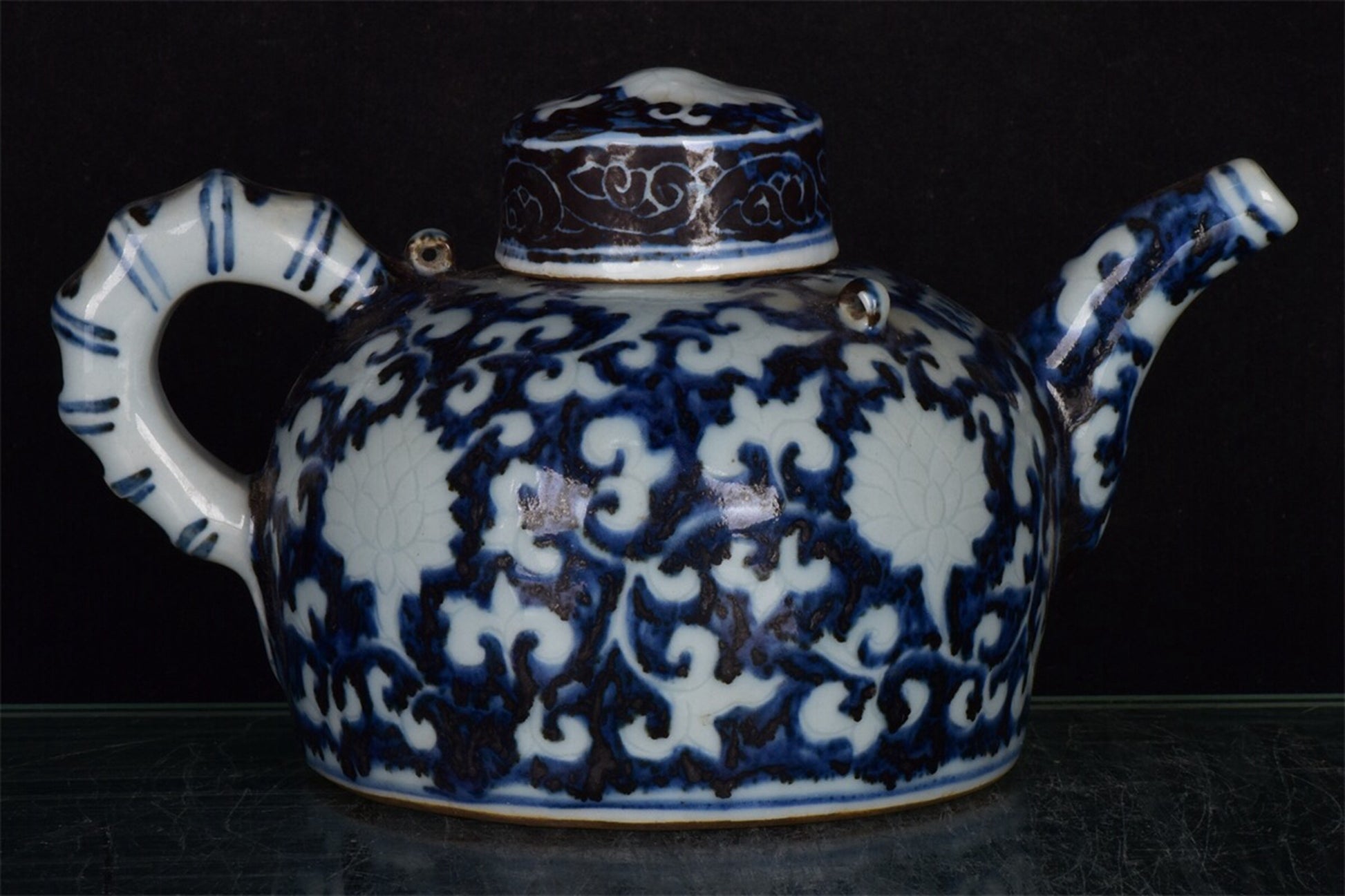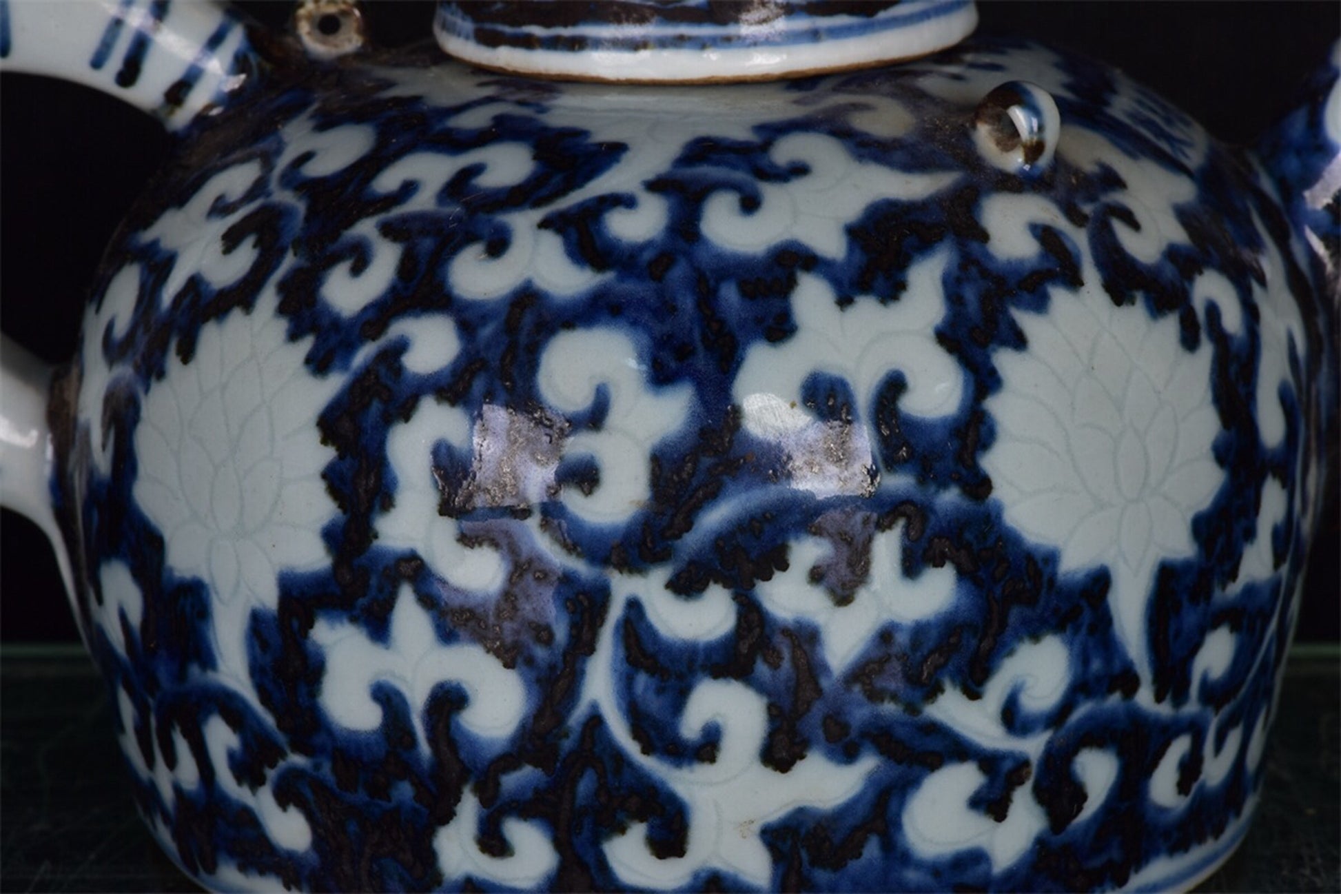 Chinese antique blue and white with white space, entwined flower pattern, three series bamboo teapot
