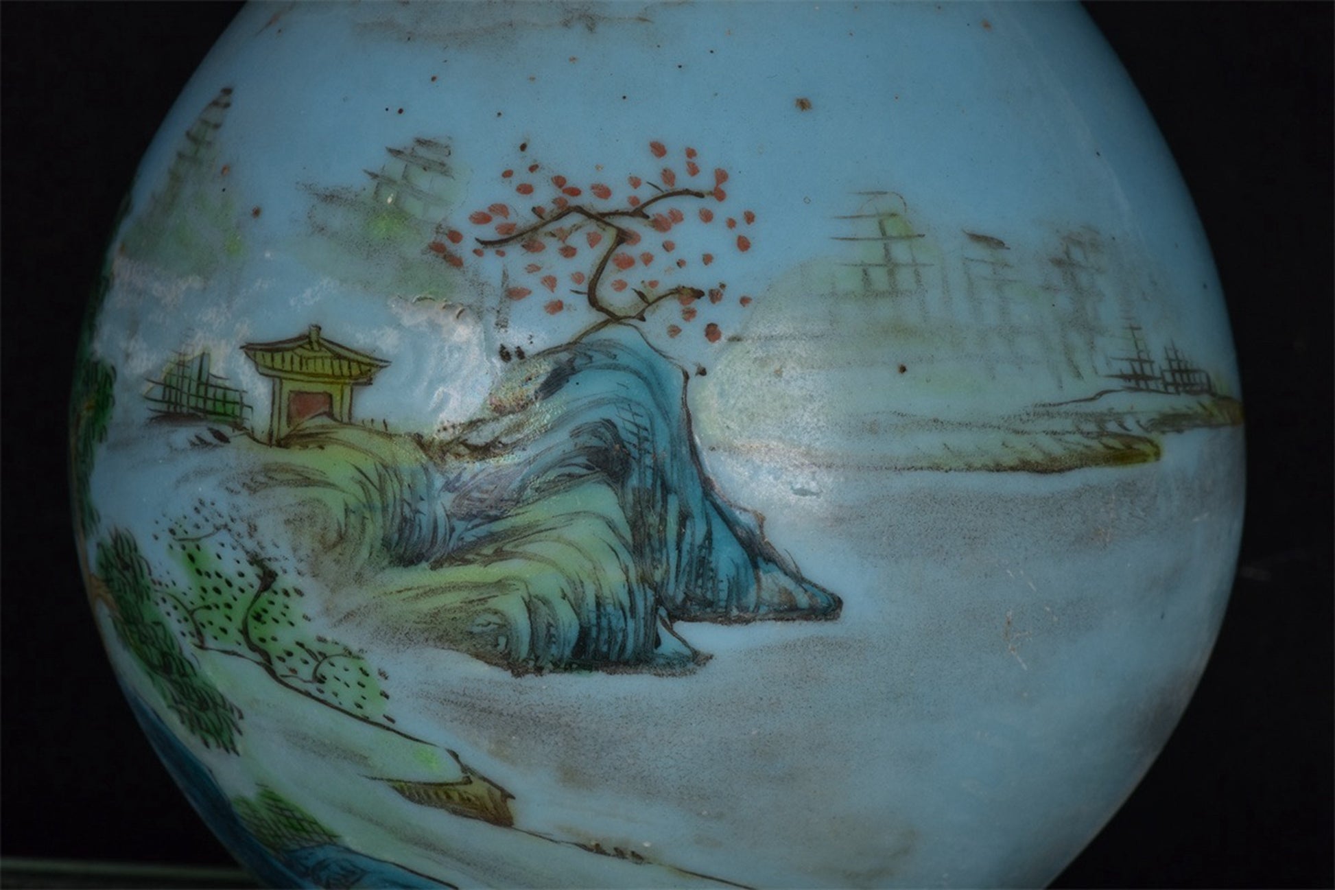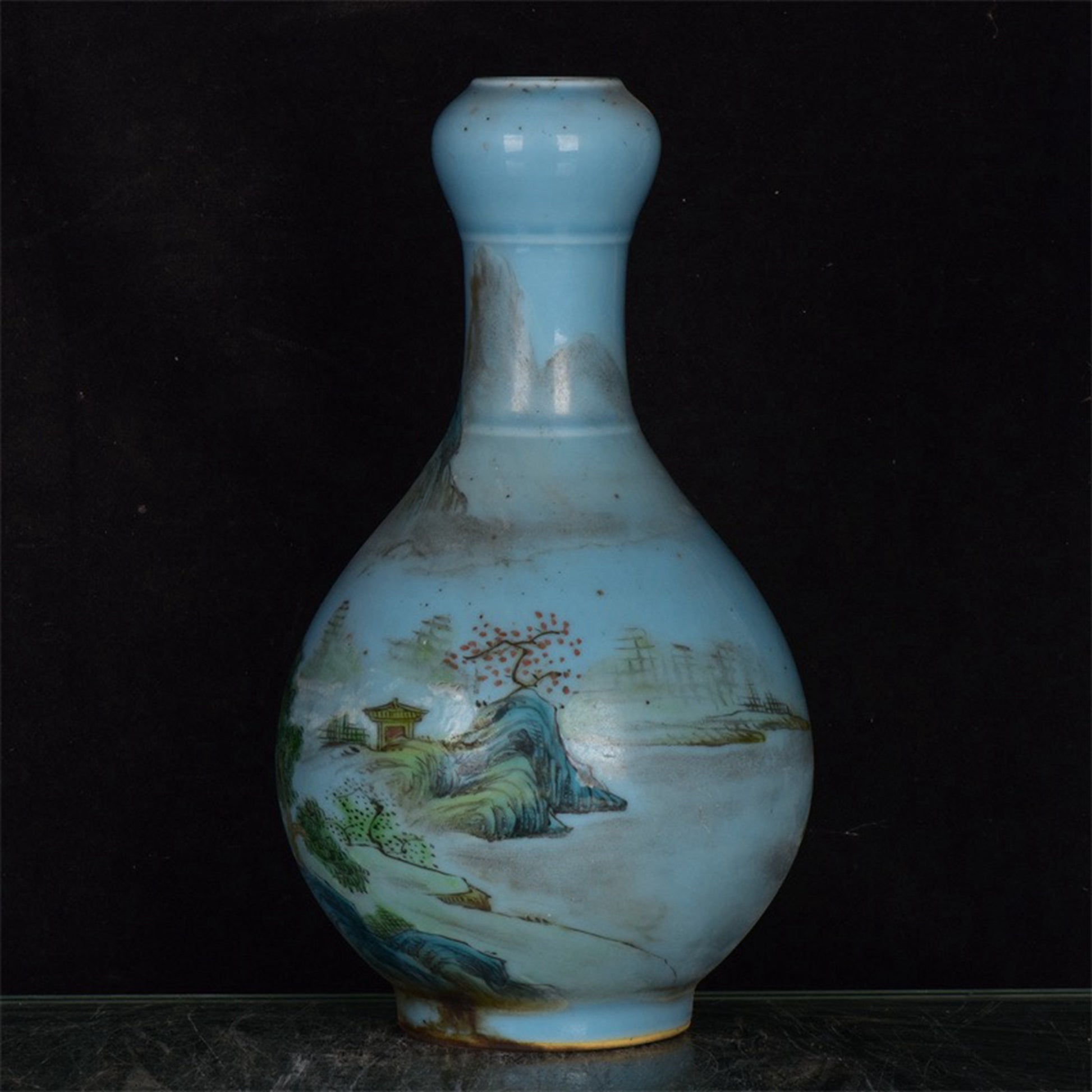 Chinese antique blue glazed pink landscape patterned garlic bottle