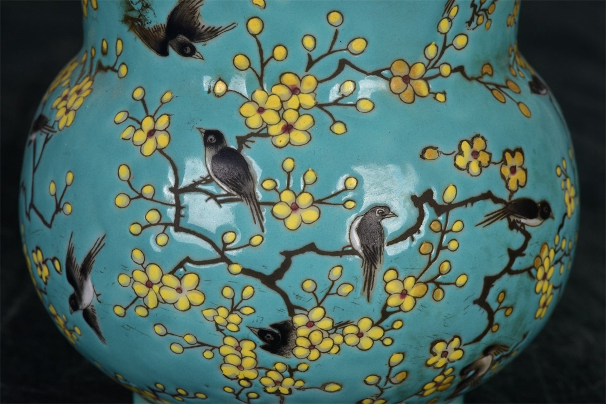 Chinese Antique Blue Glazed Powder Colored Pleasant Eyebrow with Golden Flower Drum Pattern