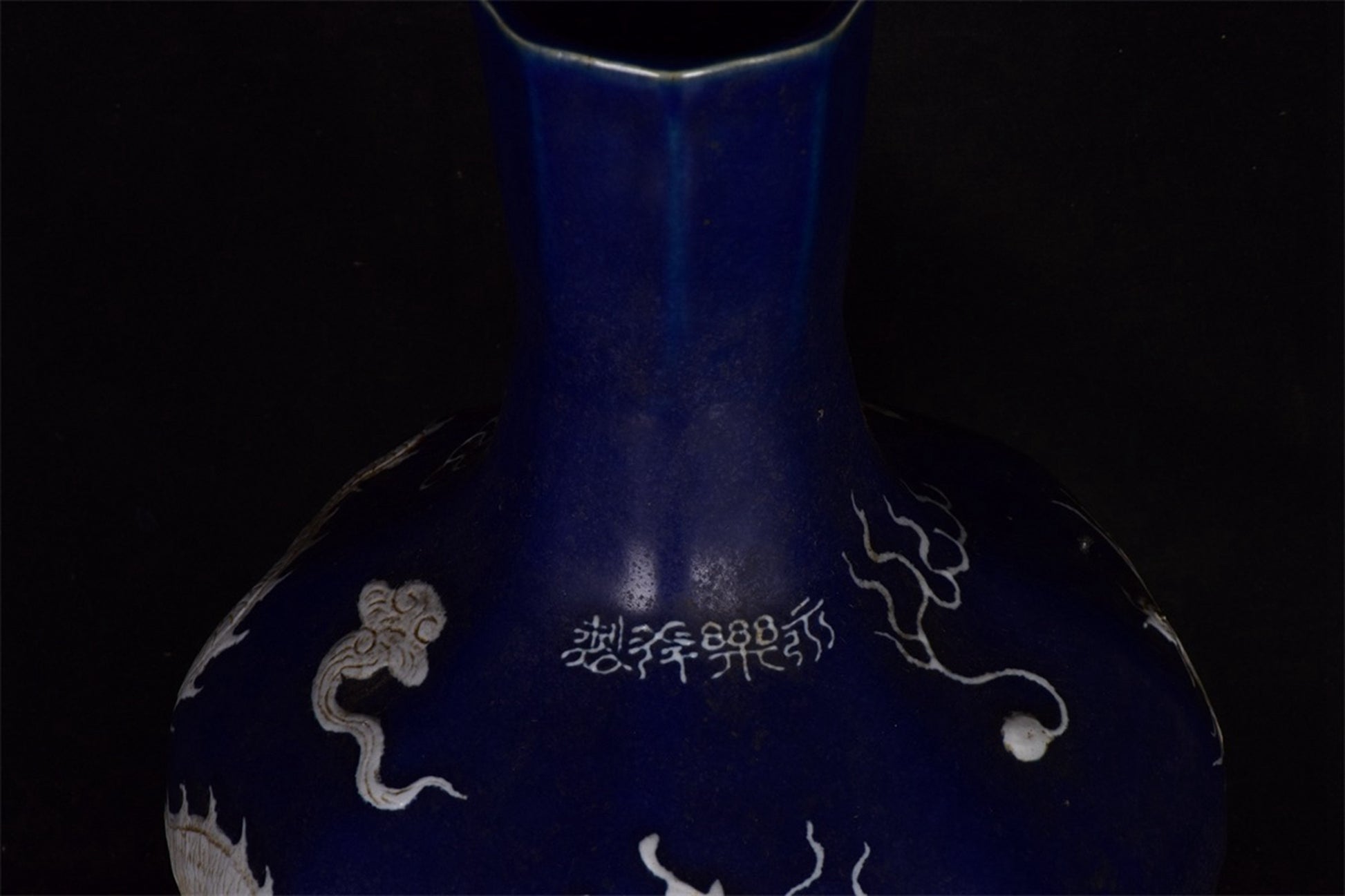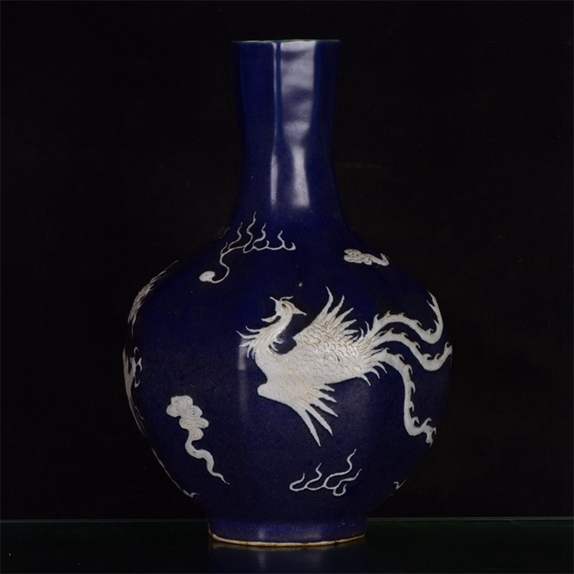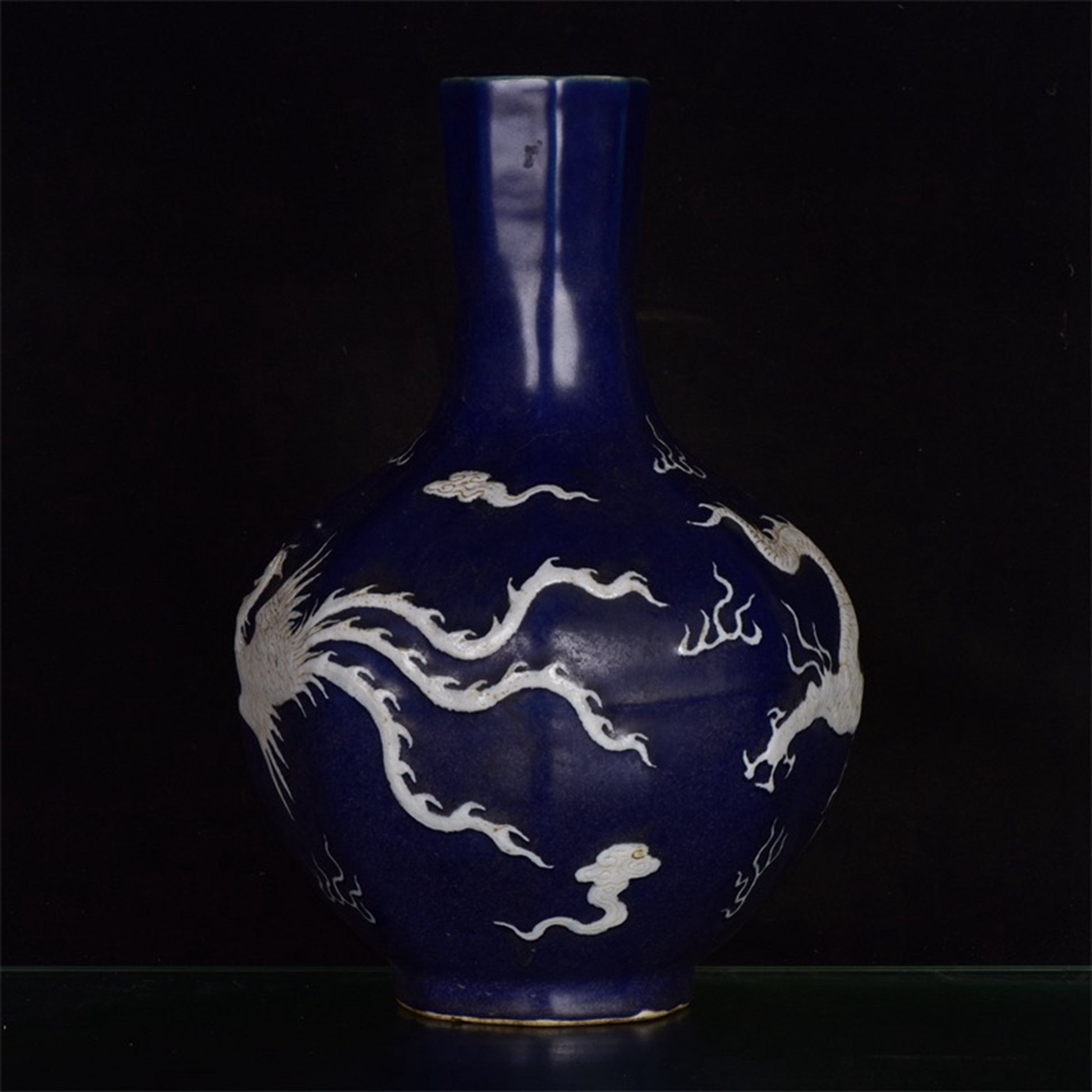 Chinese antique blue, white, dragon and phoenix with auspicious patterns, octagonal celestial sphere vase