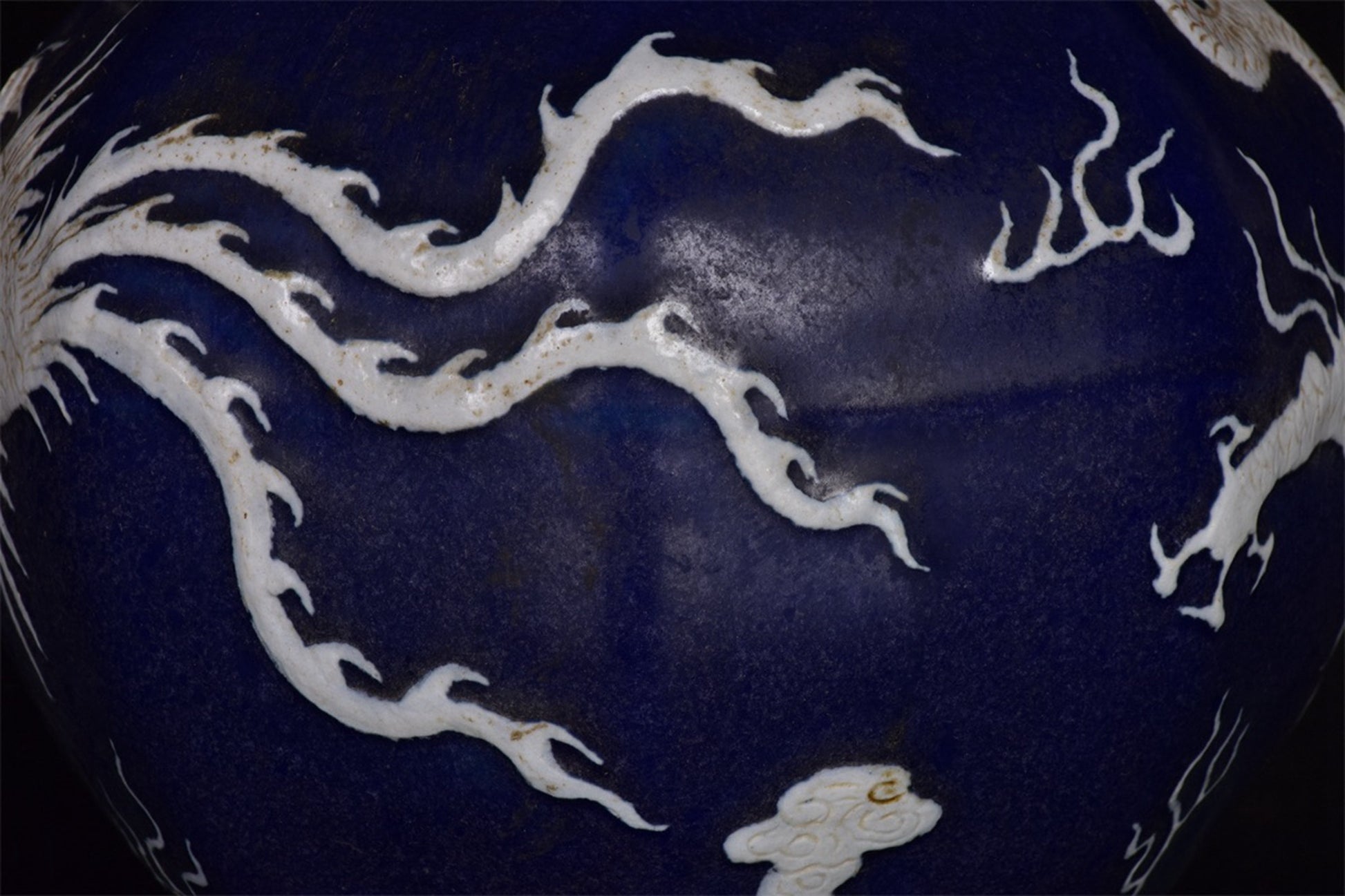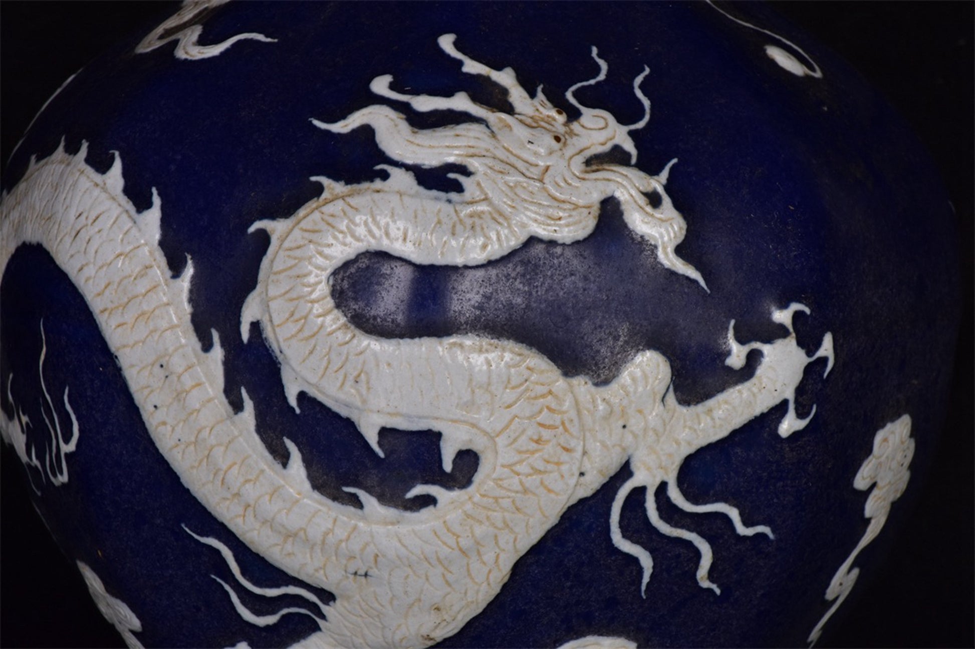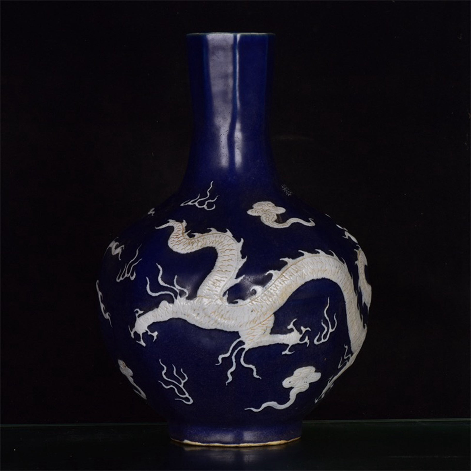 Chinese antique blue, white, dragon and phoenix with auspicious patterns, octagonal celestial sphere vase