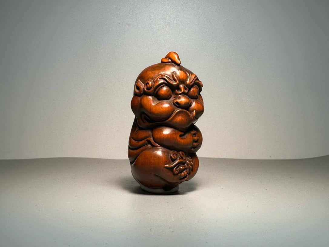 Chinese antique boxwood carving with exquisite craftsmanship, featuring a unicorn Pixiu holding a ball