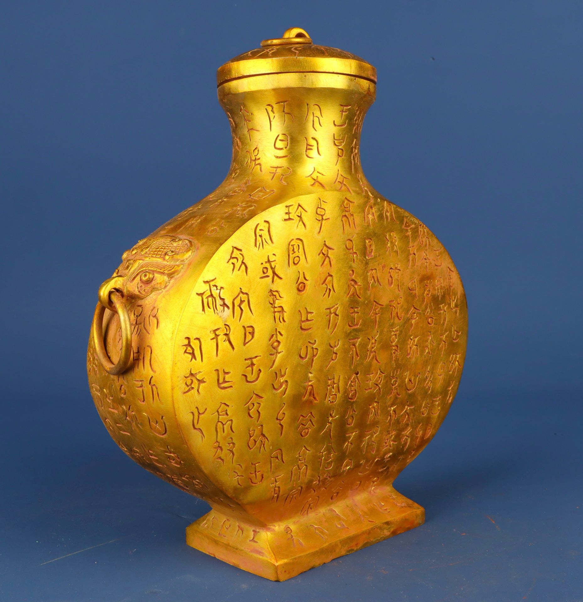 Chinese Antique Bronze Gilded Inscription Flat Pot