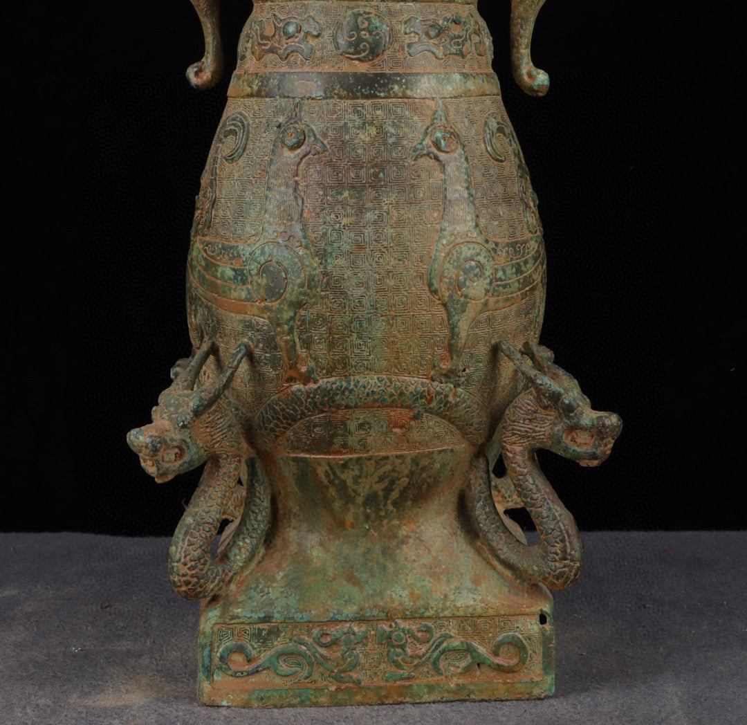Chinese antique bronze six dragon standing bird teapot