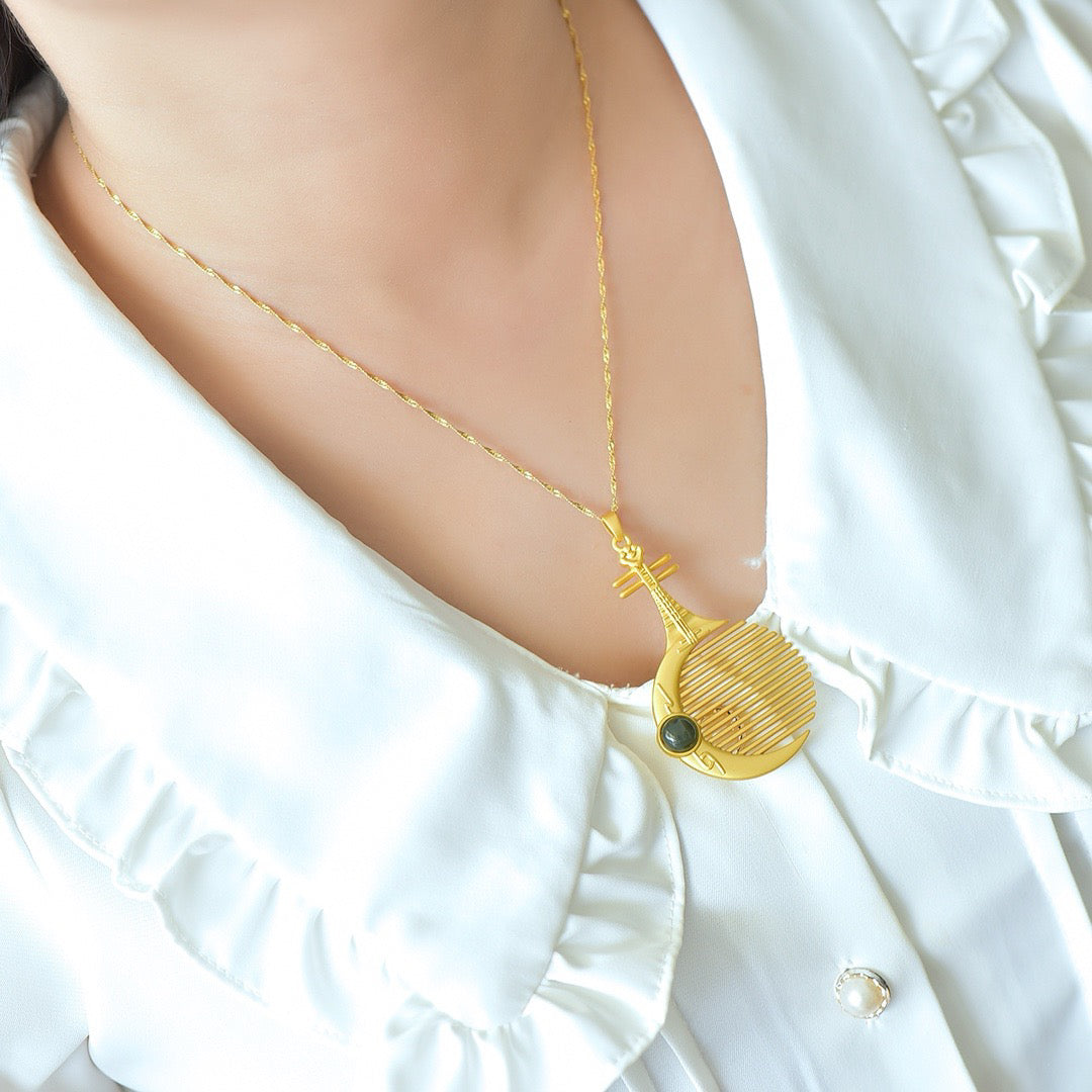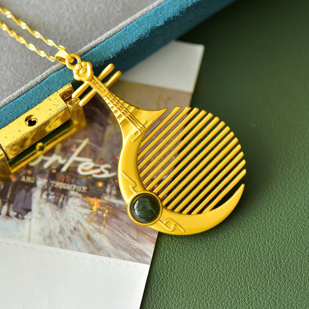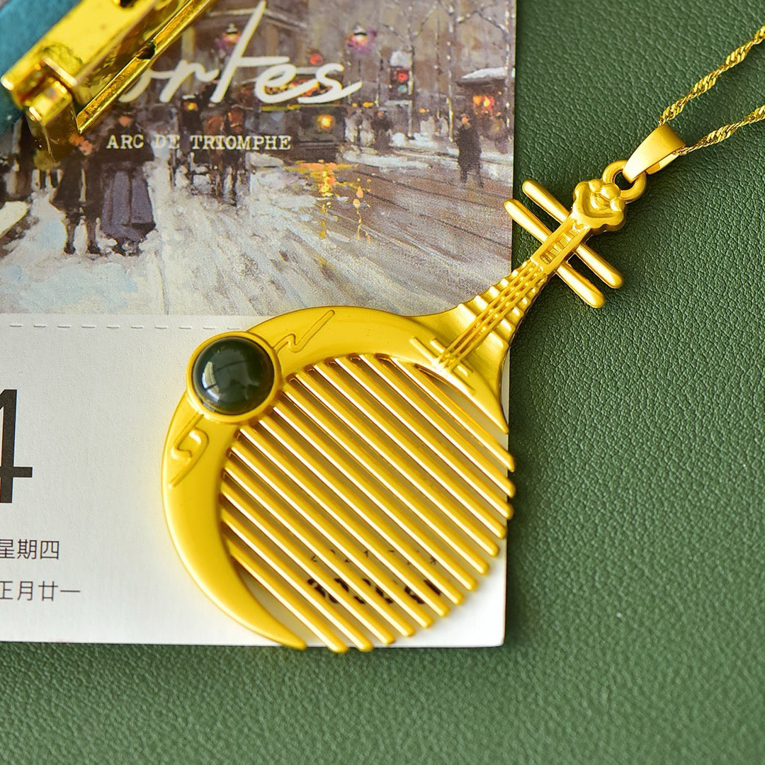Copper inlaid Hotan Jade drum face pipa comb fashion pendant