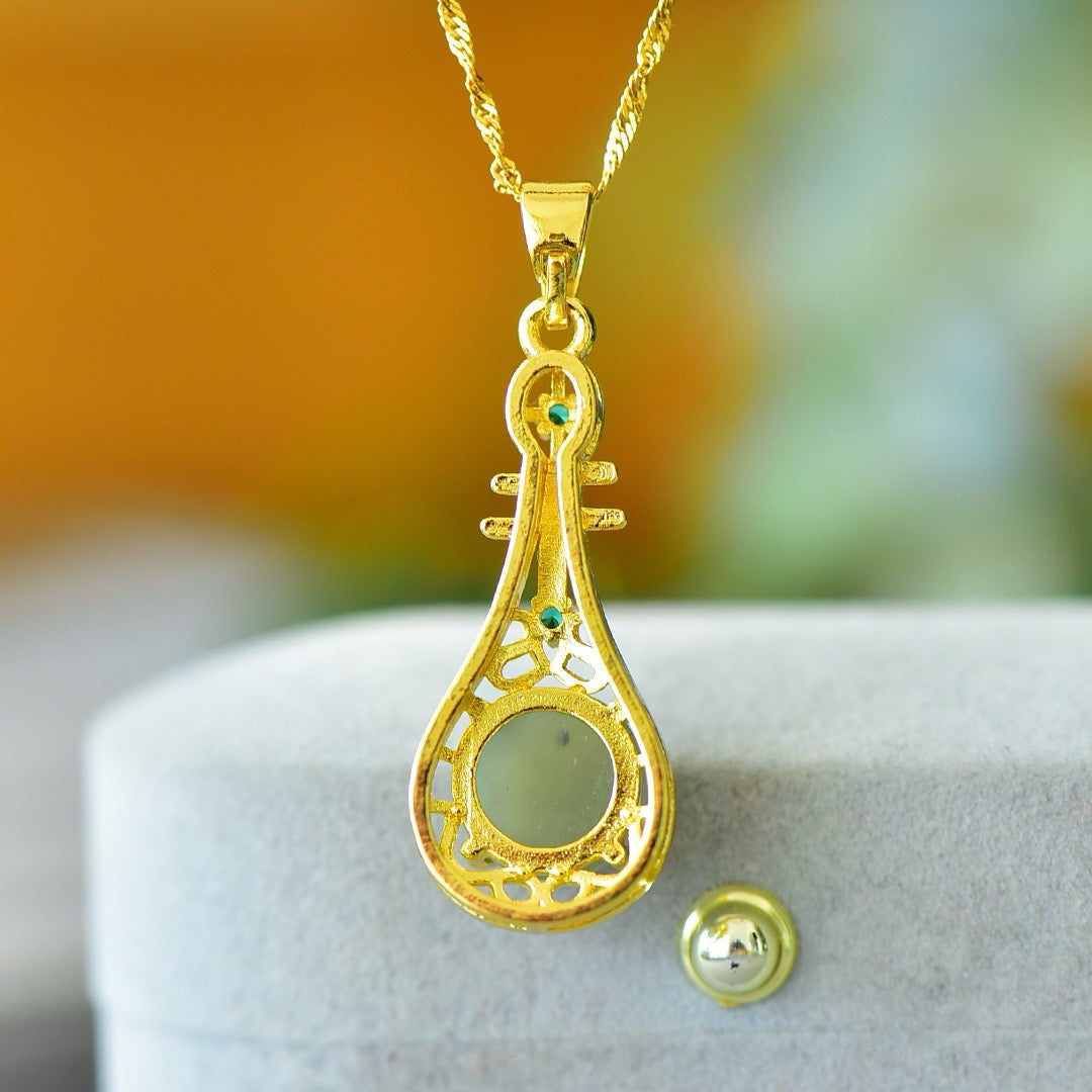 Copper inlaid Hotan Jade hollow pipa with green zirconium fashion pendant