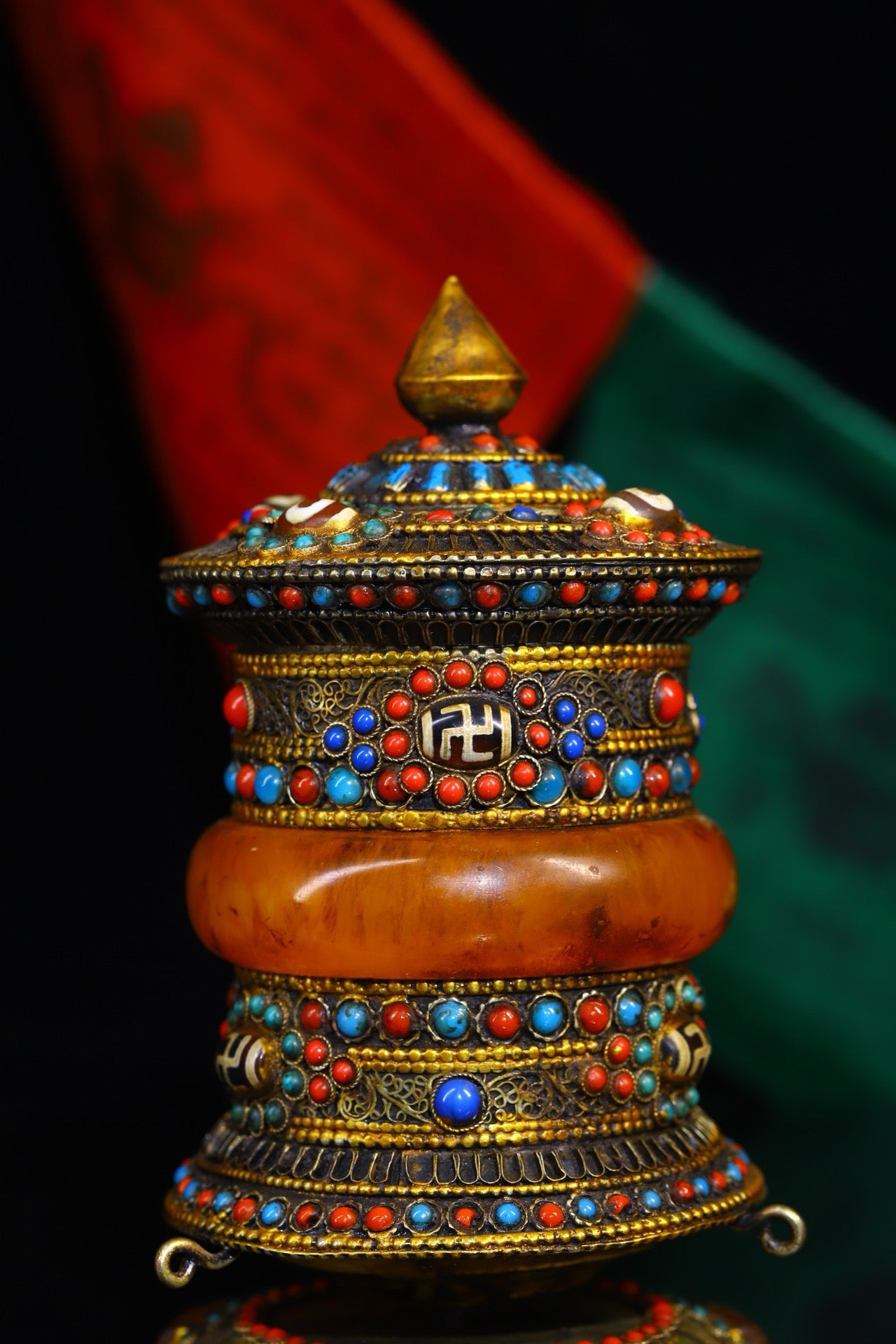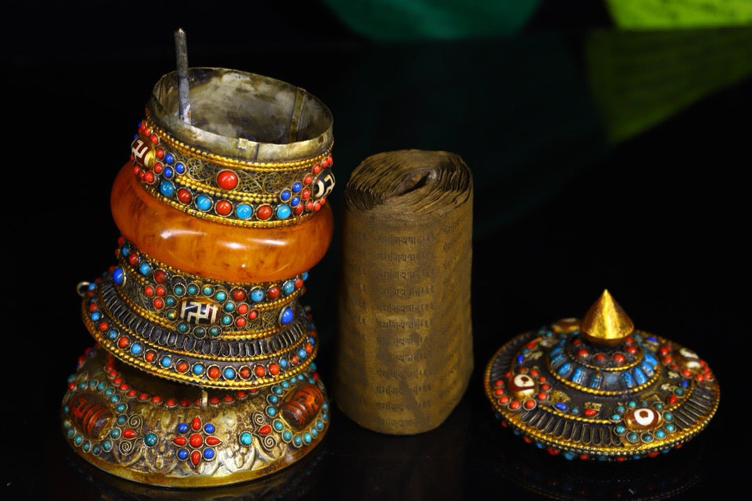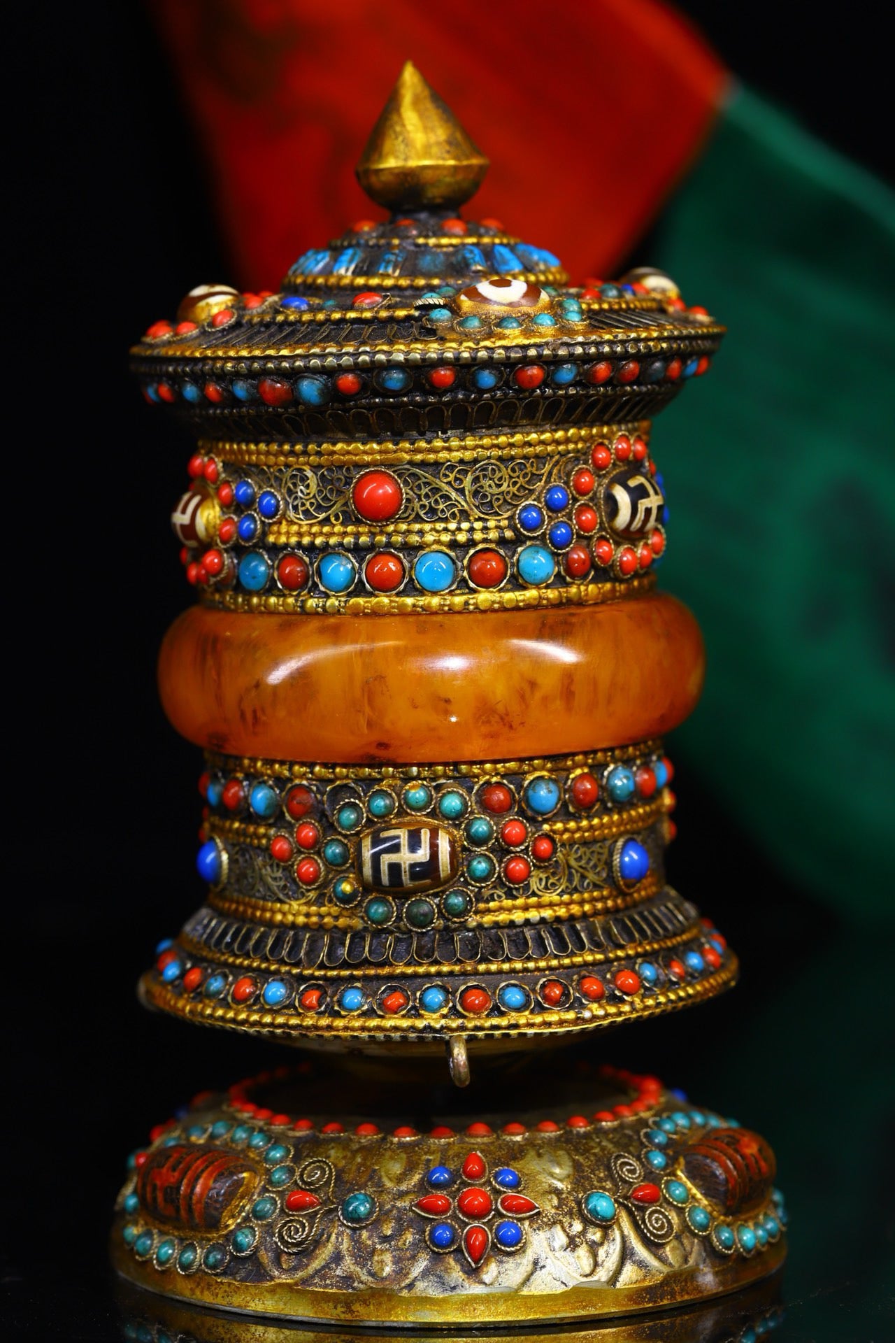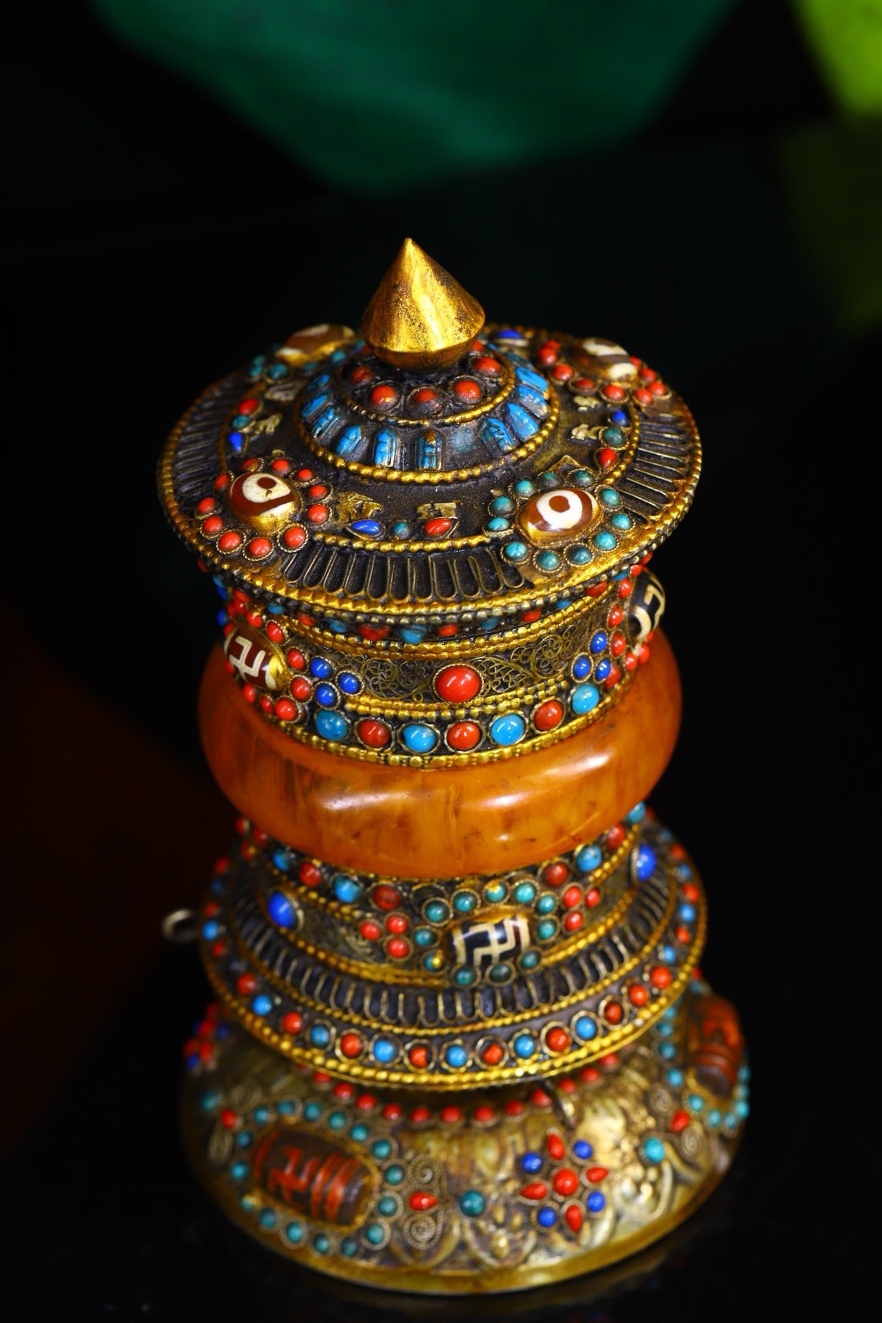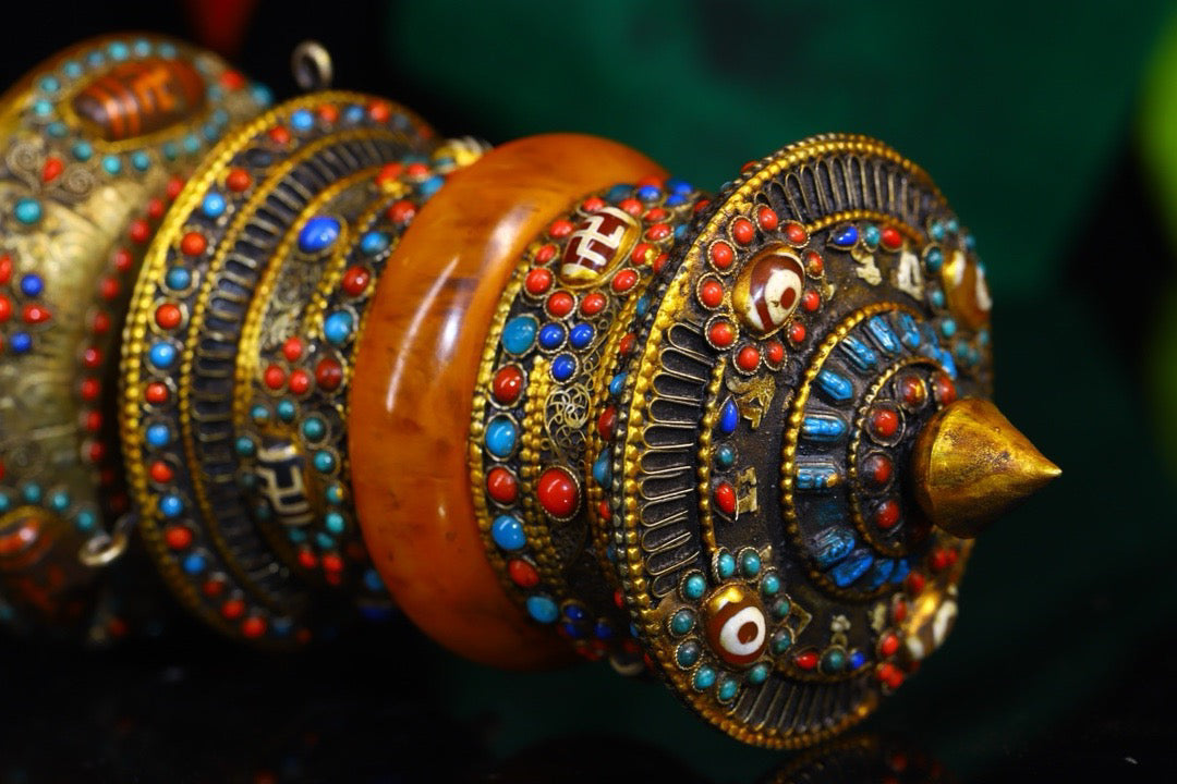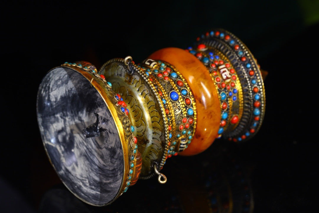 Silver handmade hammering, carving, gemstone inlay, celestial bead spinning wheel