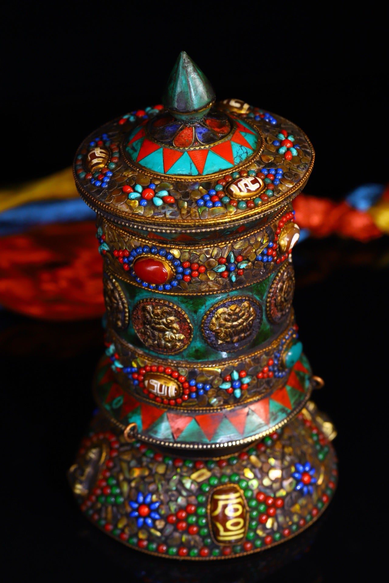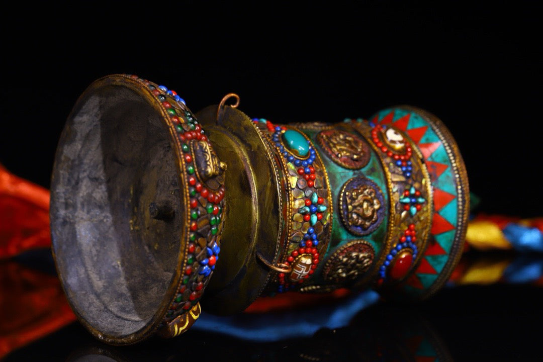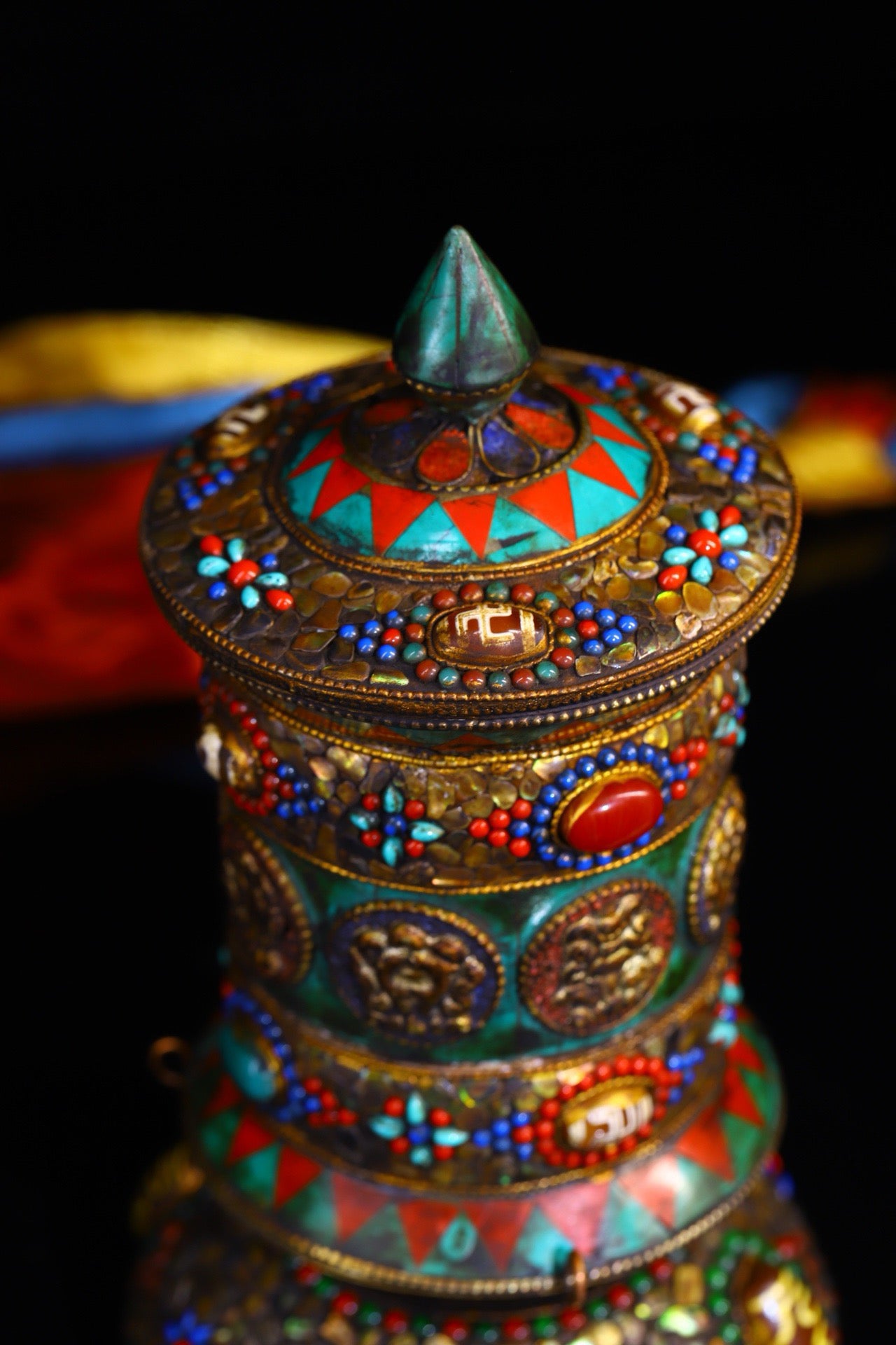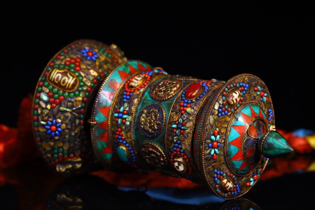 Silver handmade tapping, carving, gemstone inlay, spinning wheel