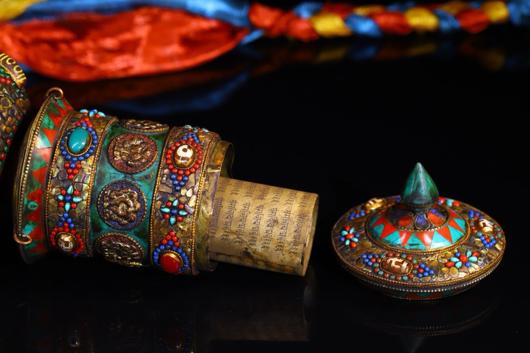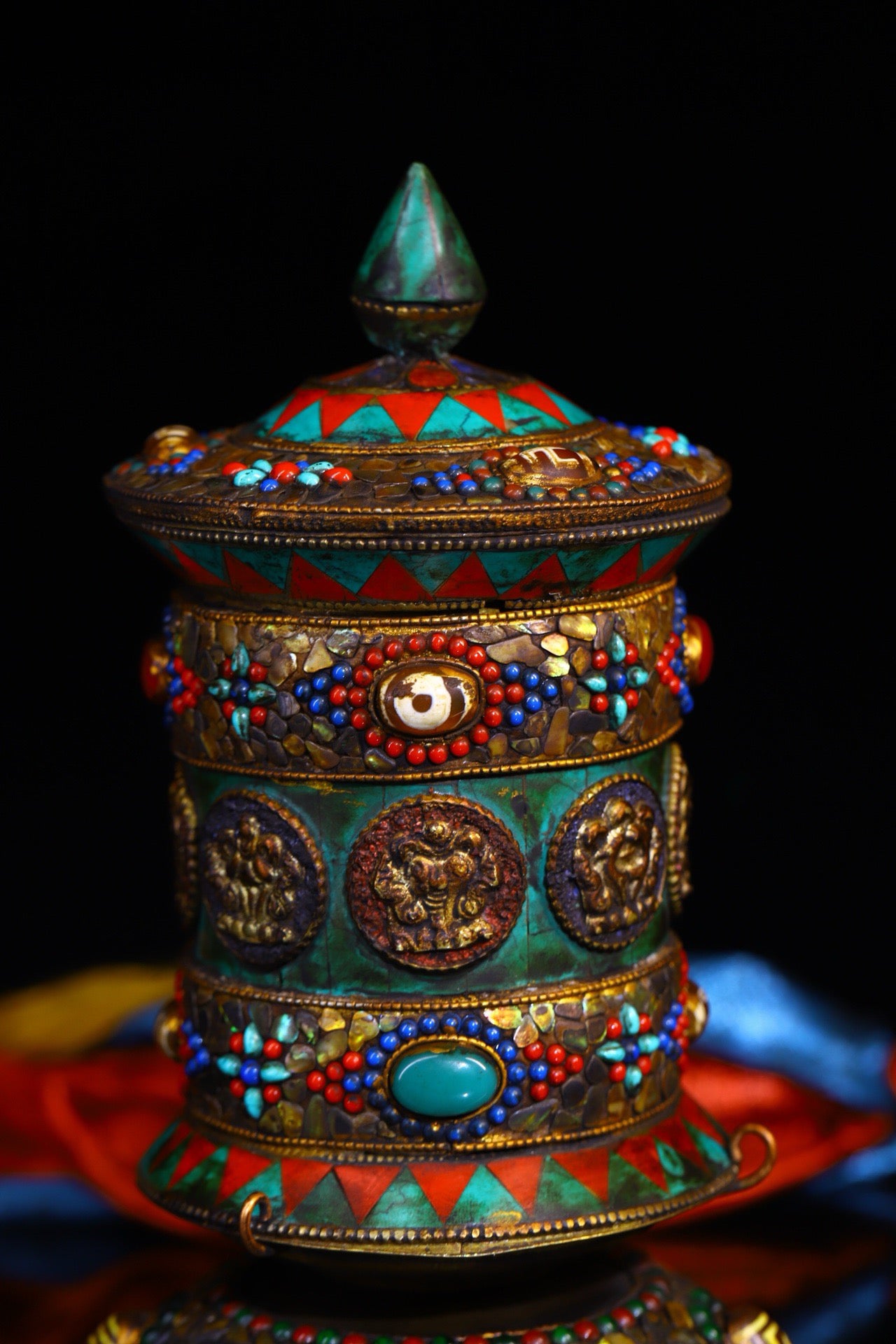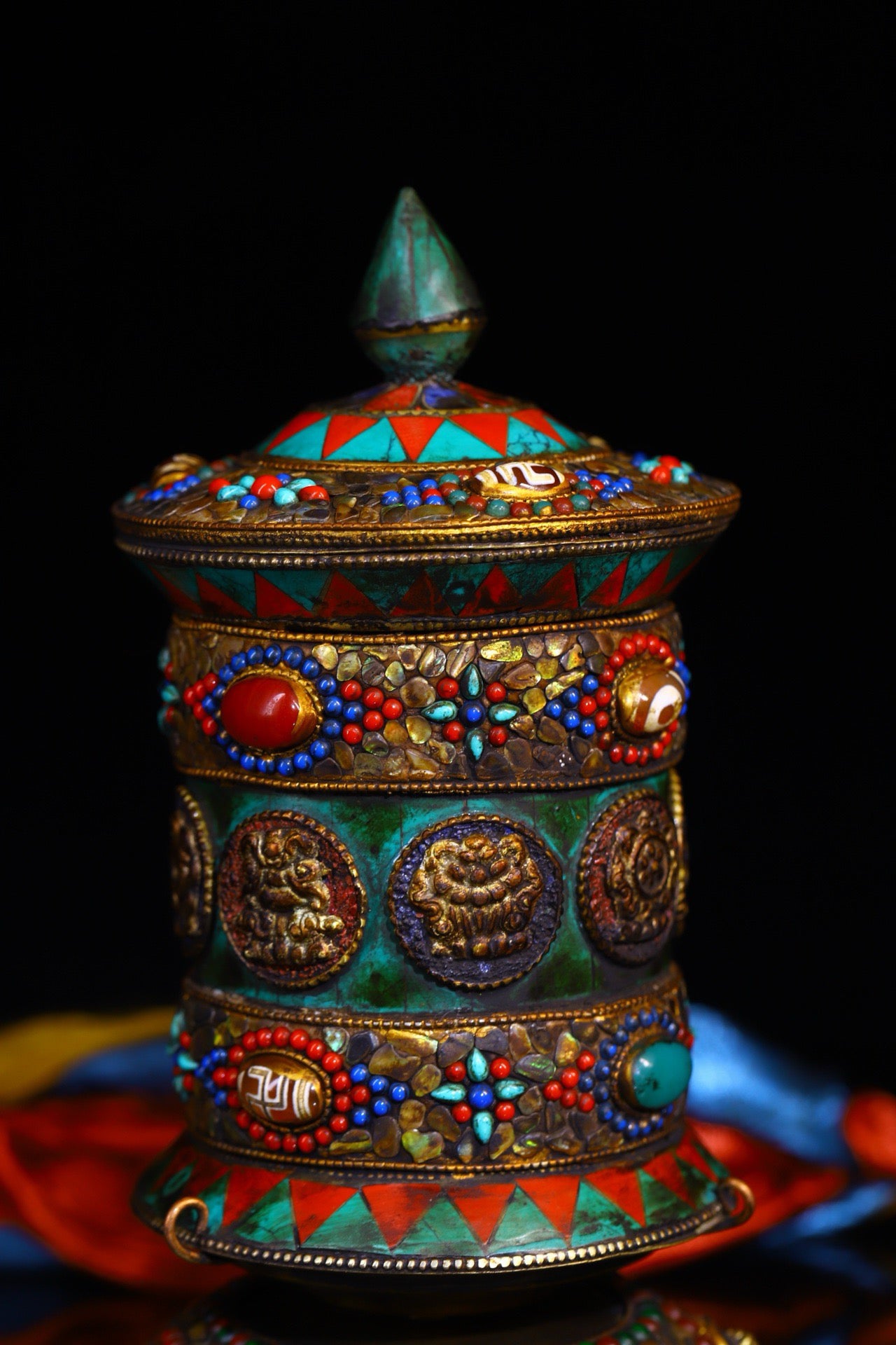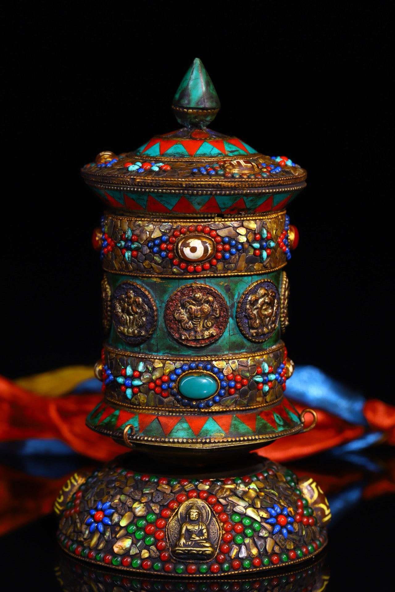 Silver handmade tapping, carving, gemstone inlay, spinning wheel