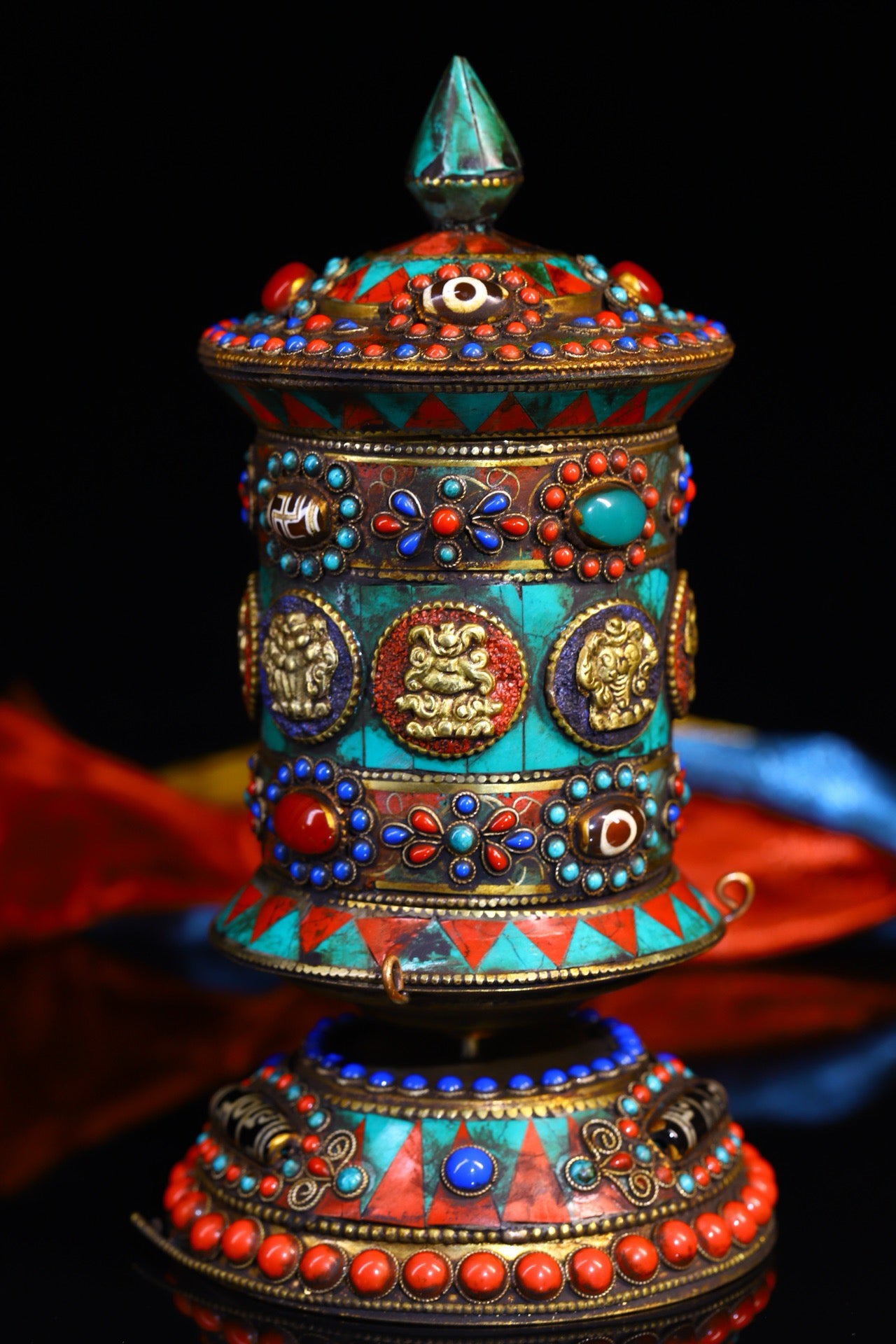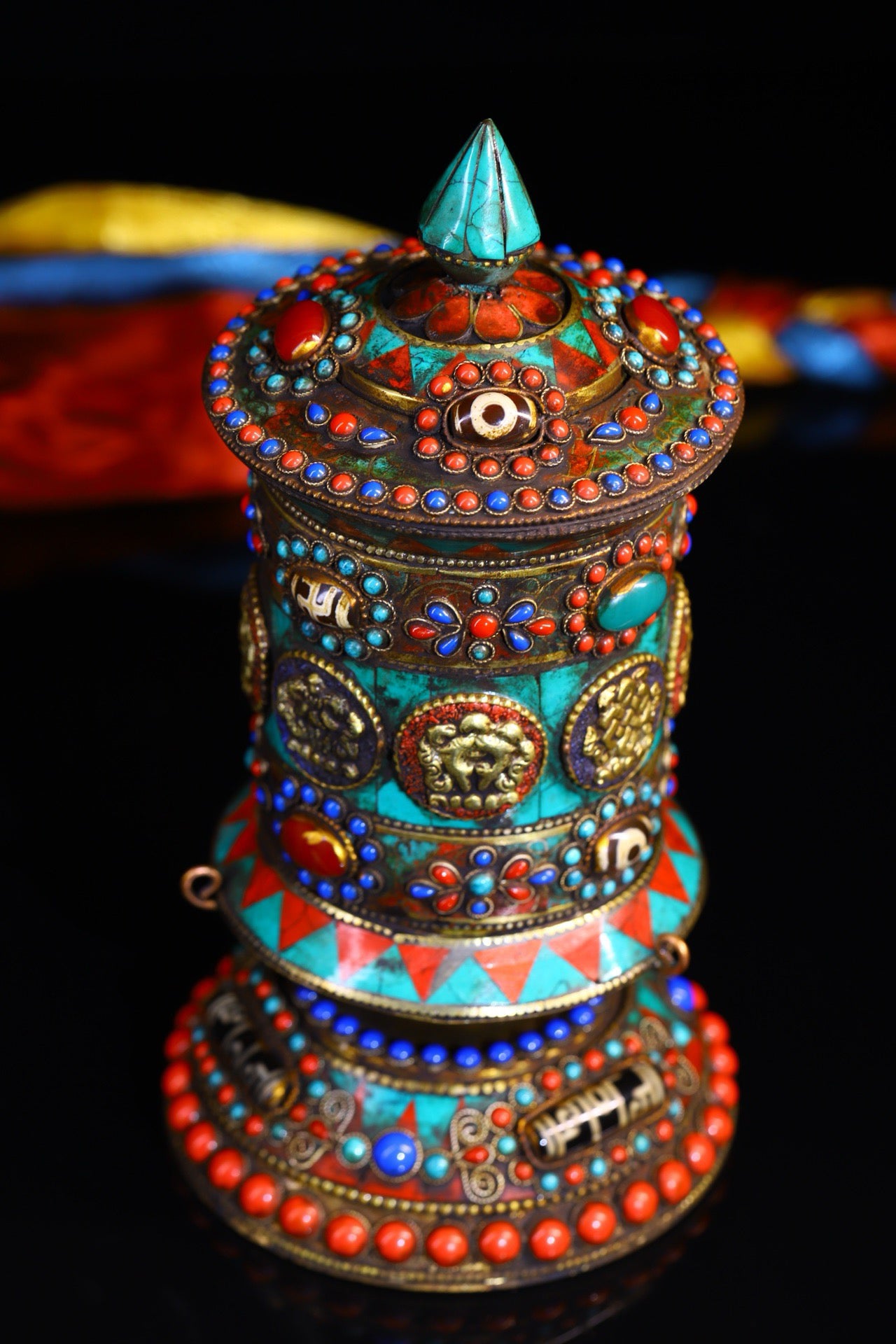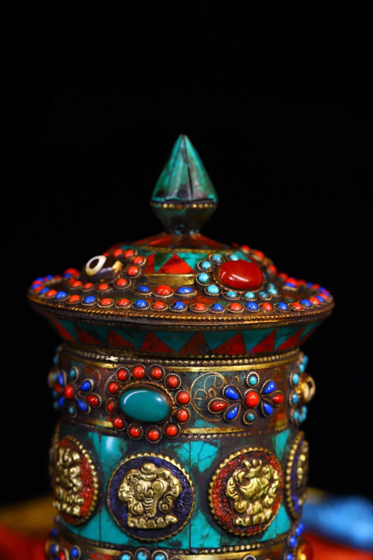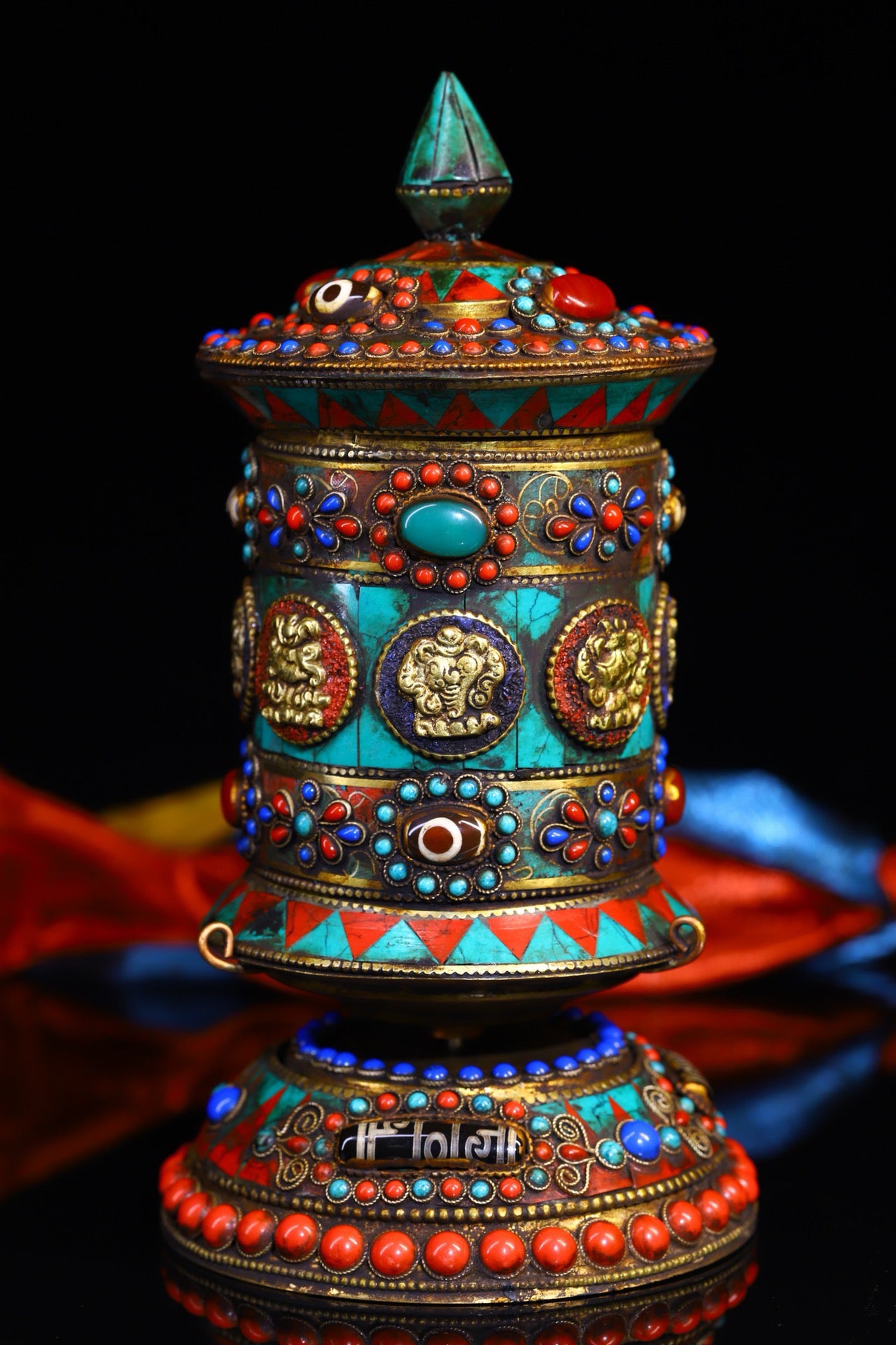 Silver handmade tapping, carving, gemstone inlay, spinning wheel