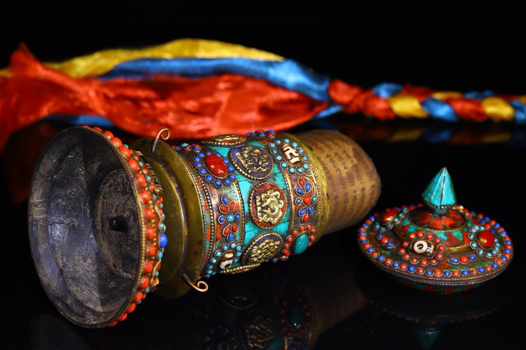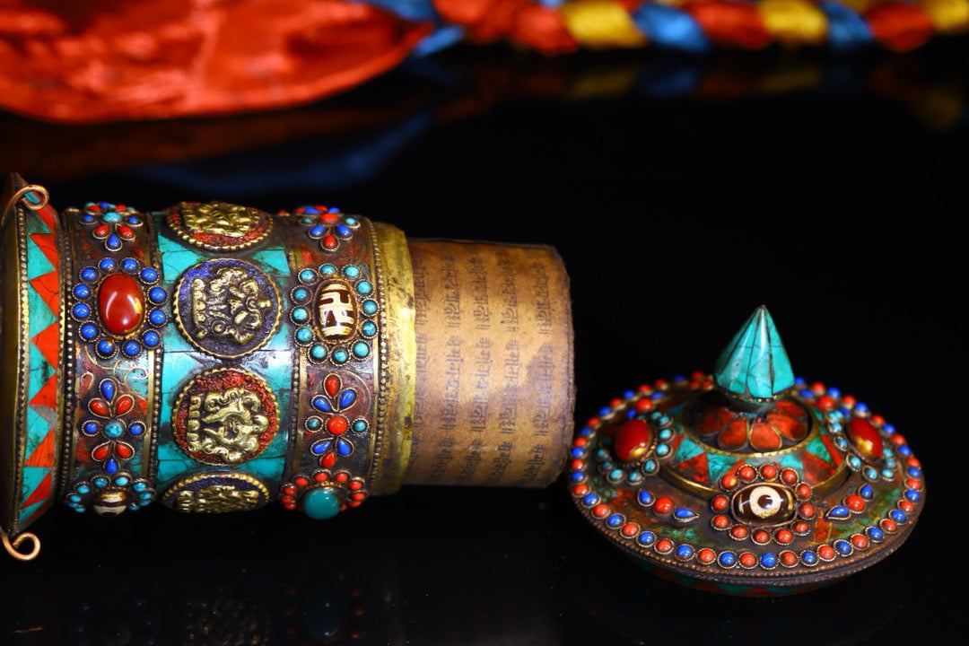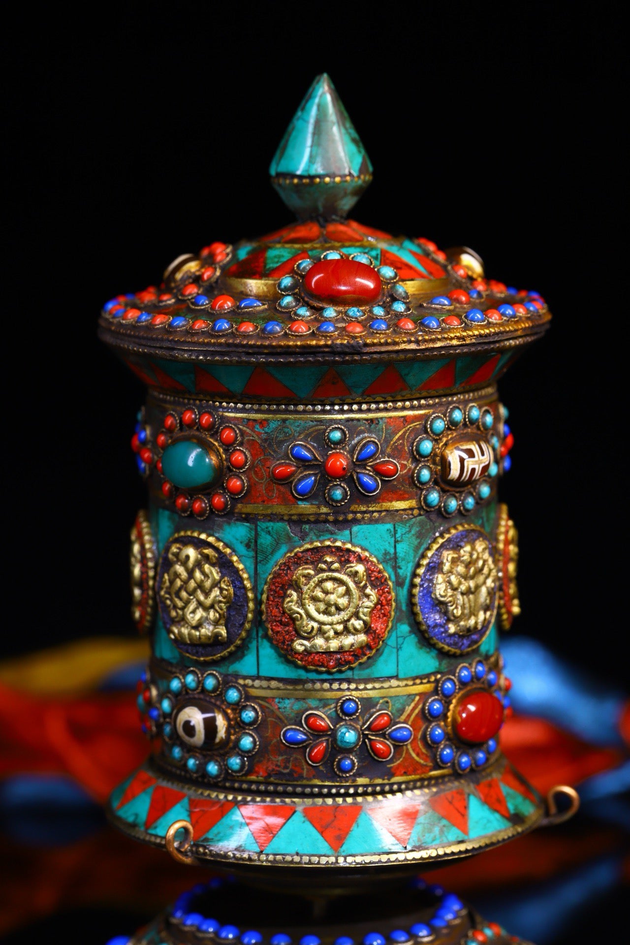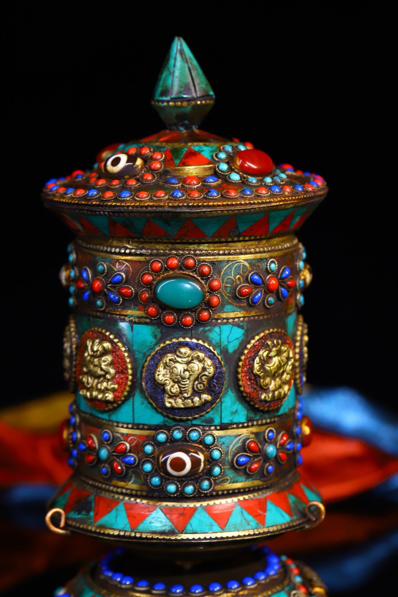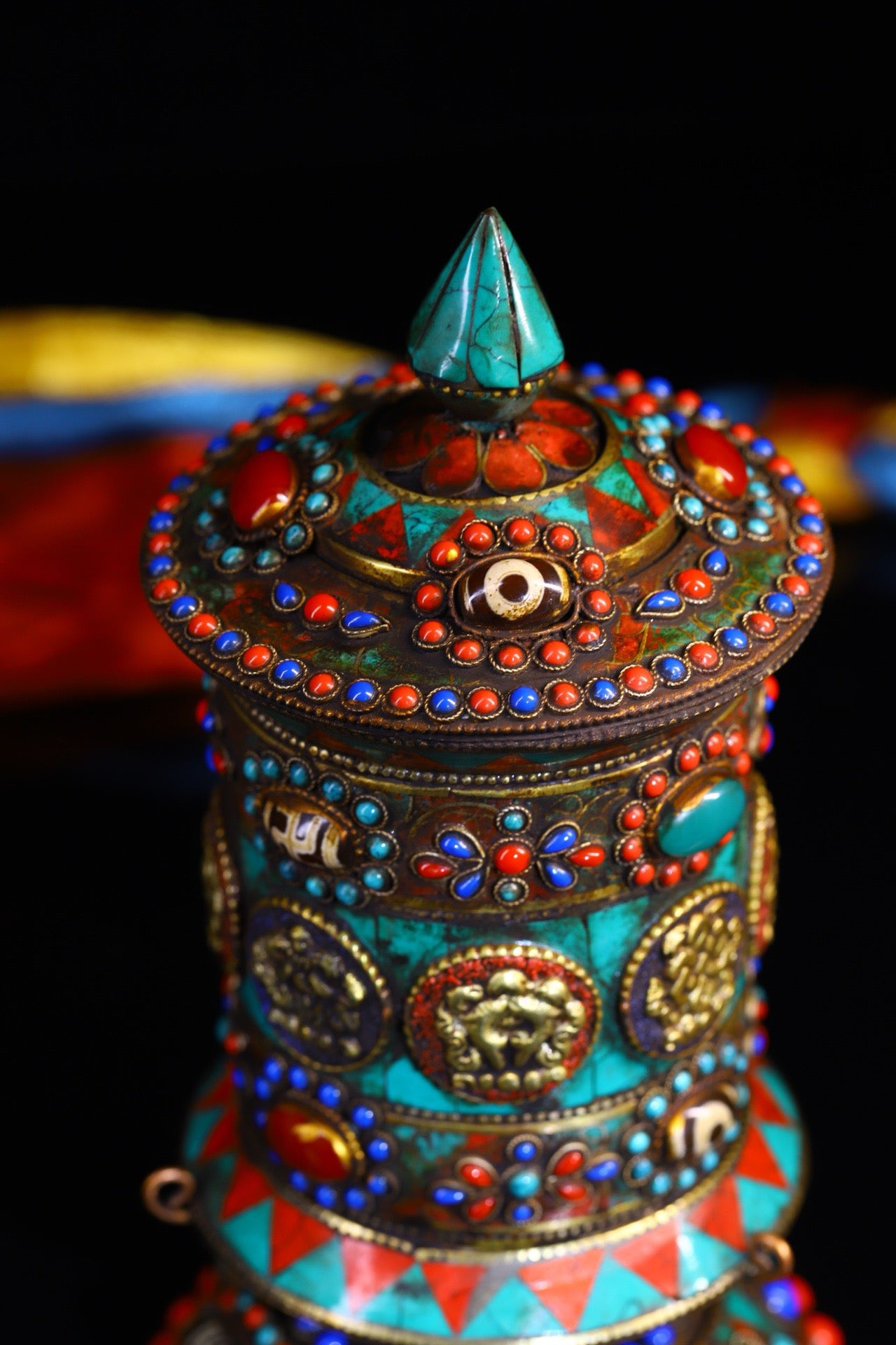 Silver handmade tapping, carving, gemstone inlay, spinning wheel