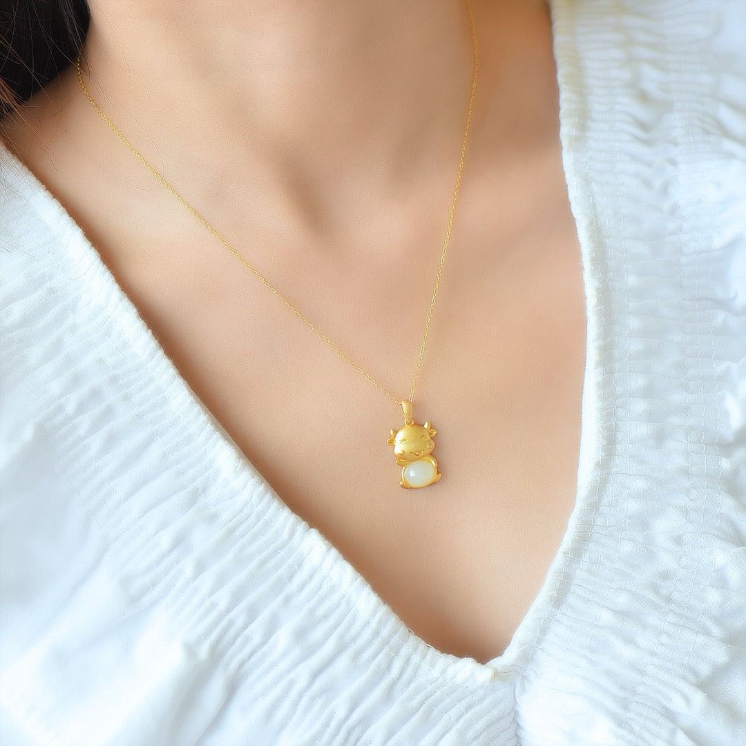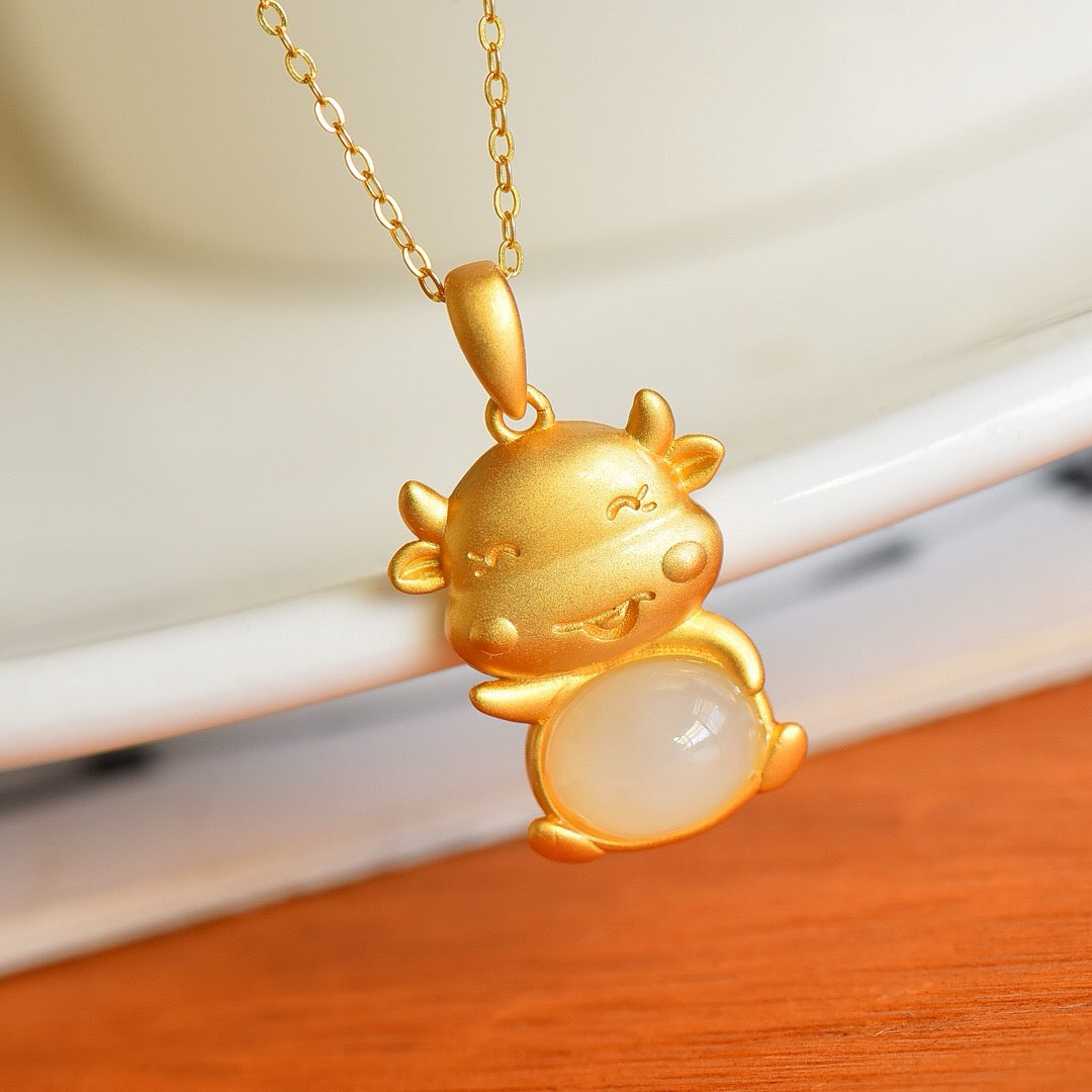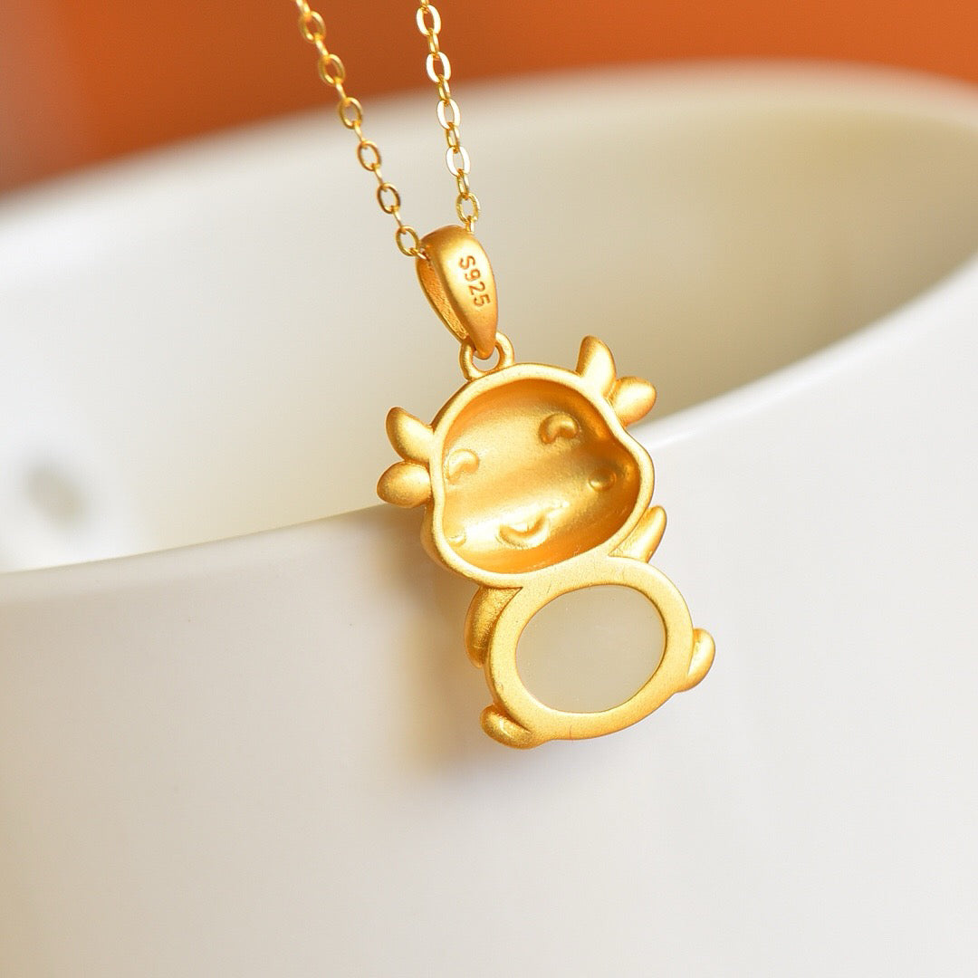Silver inlaid Hetian Jade Silver Ox Pendant