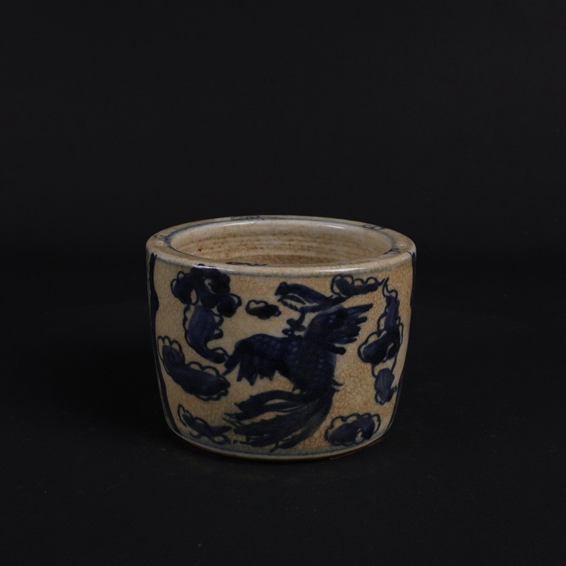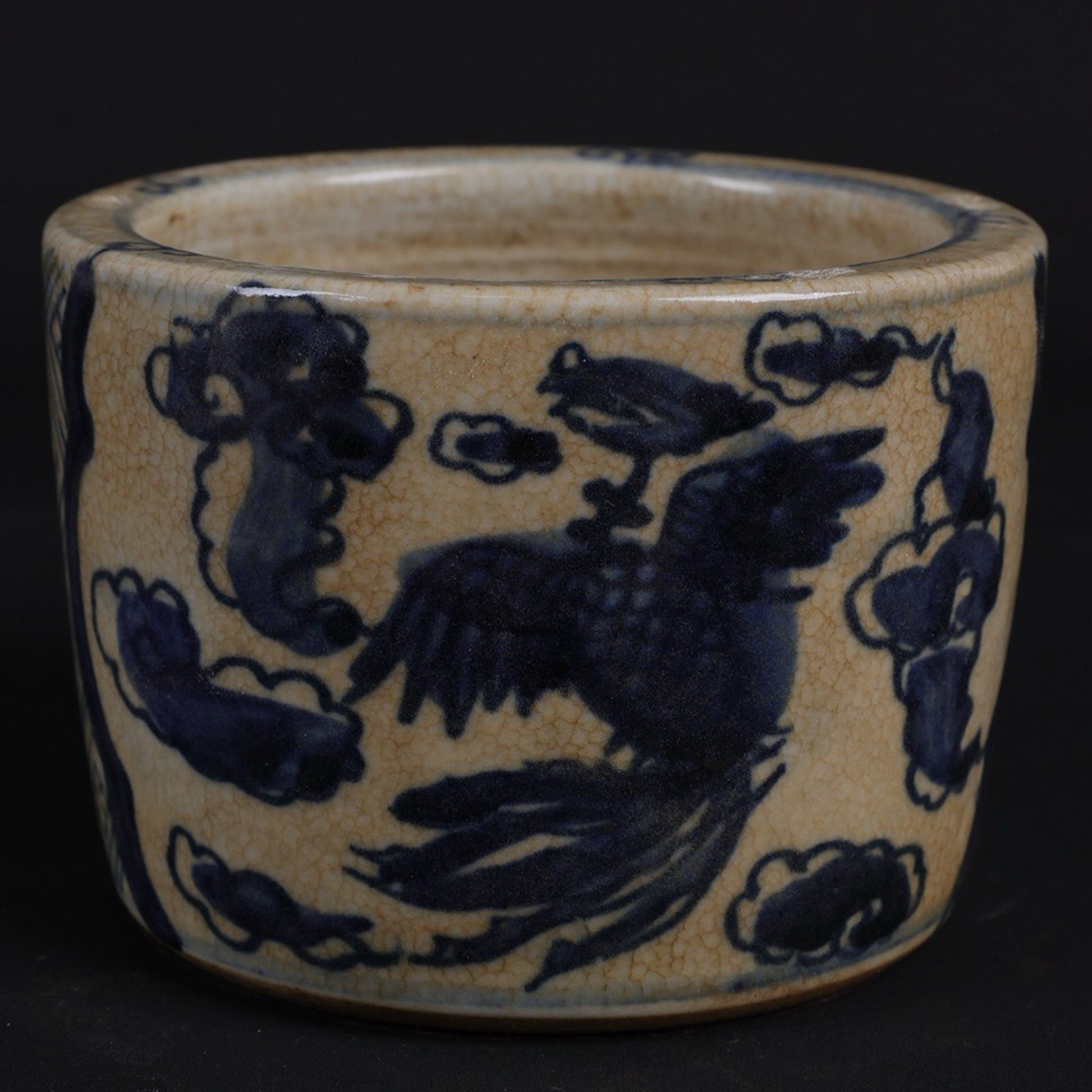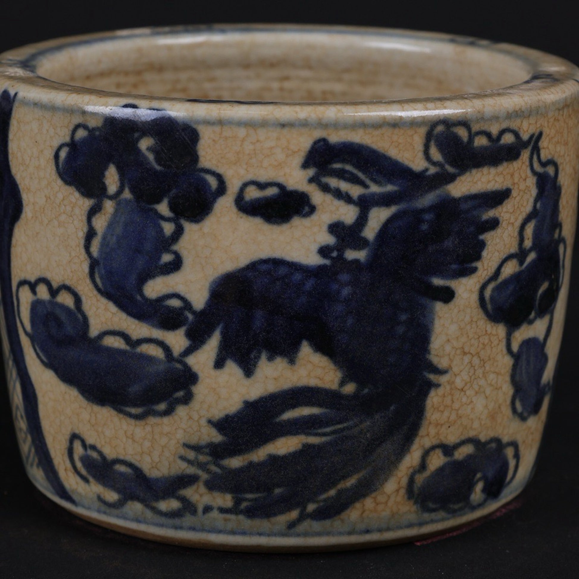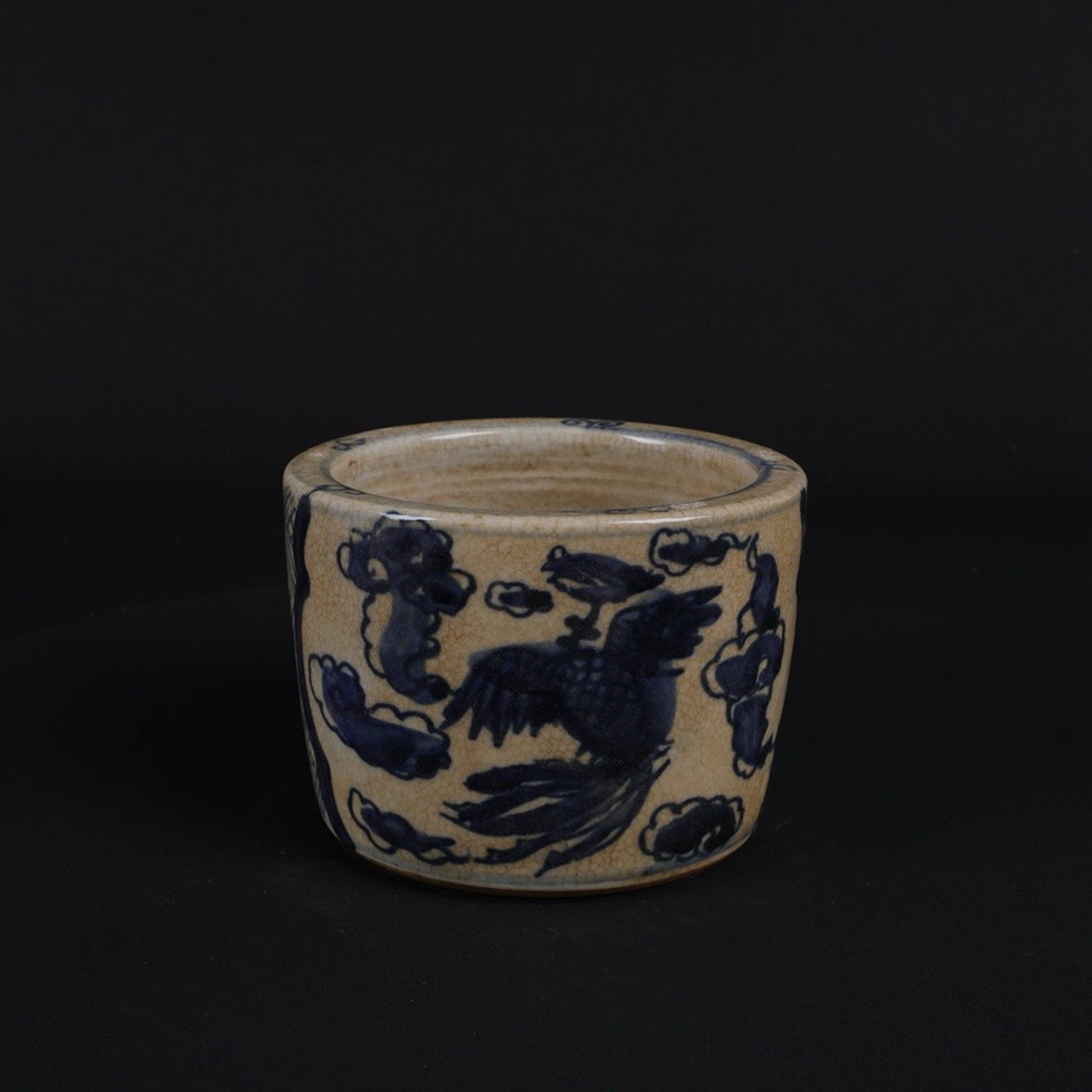 Small pen holder with open blue and white design, twin phoenixes presenting auspicious patterns