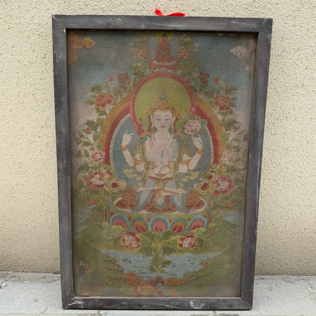 Wooden framed embroidered four armed Guanyin Buddha thangka