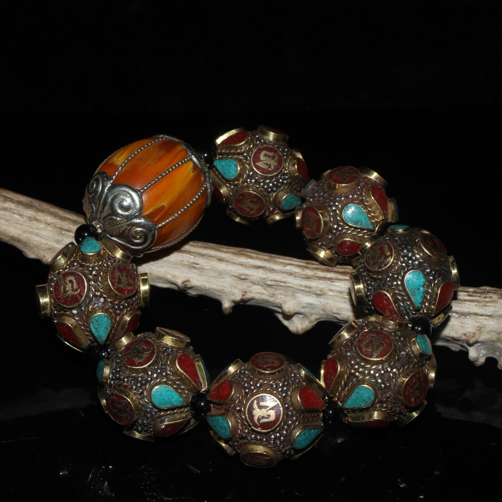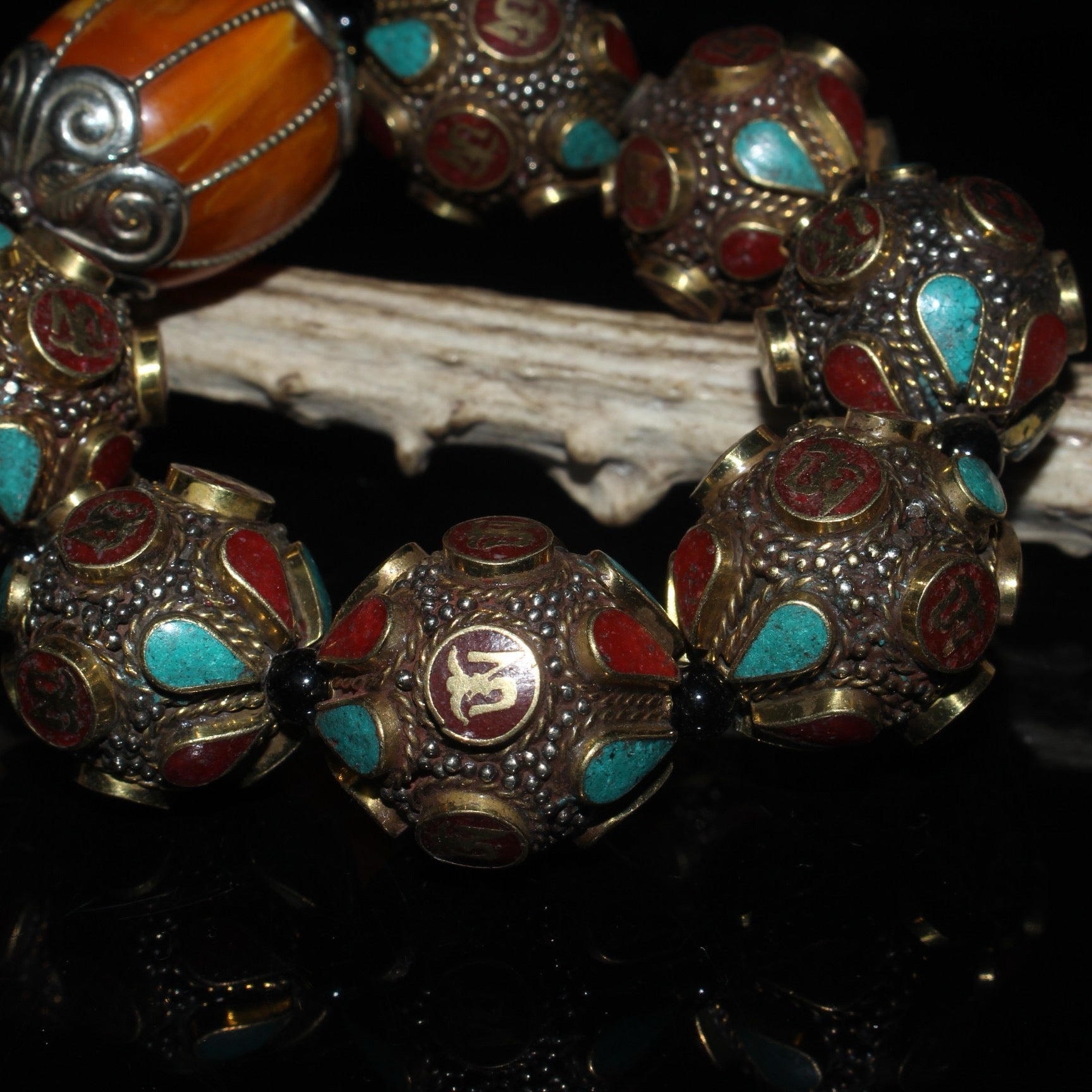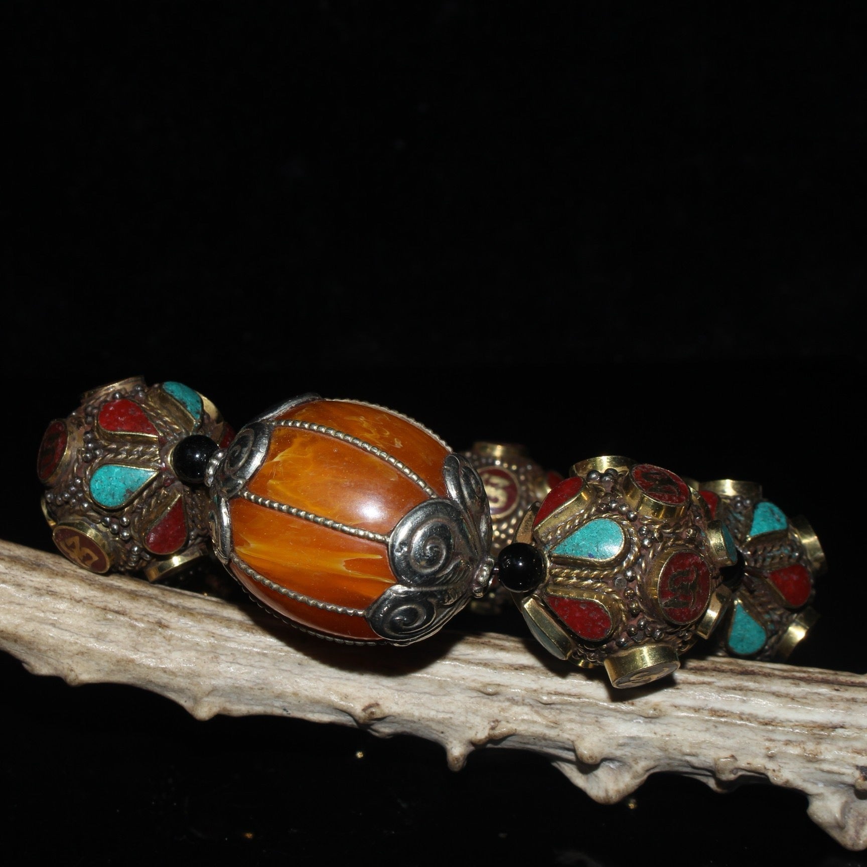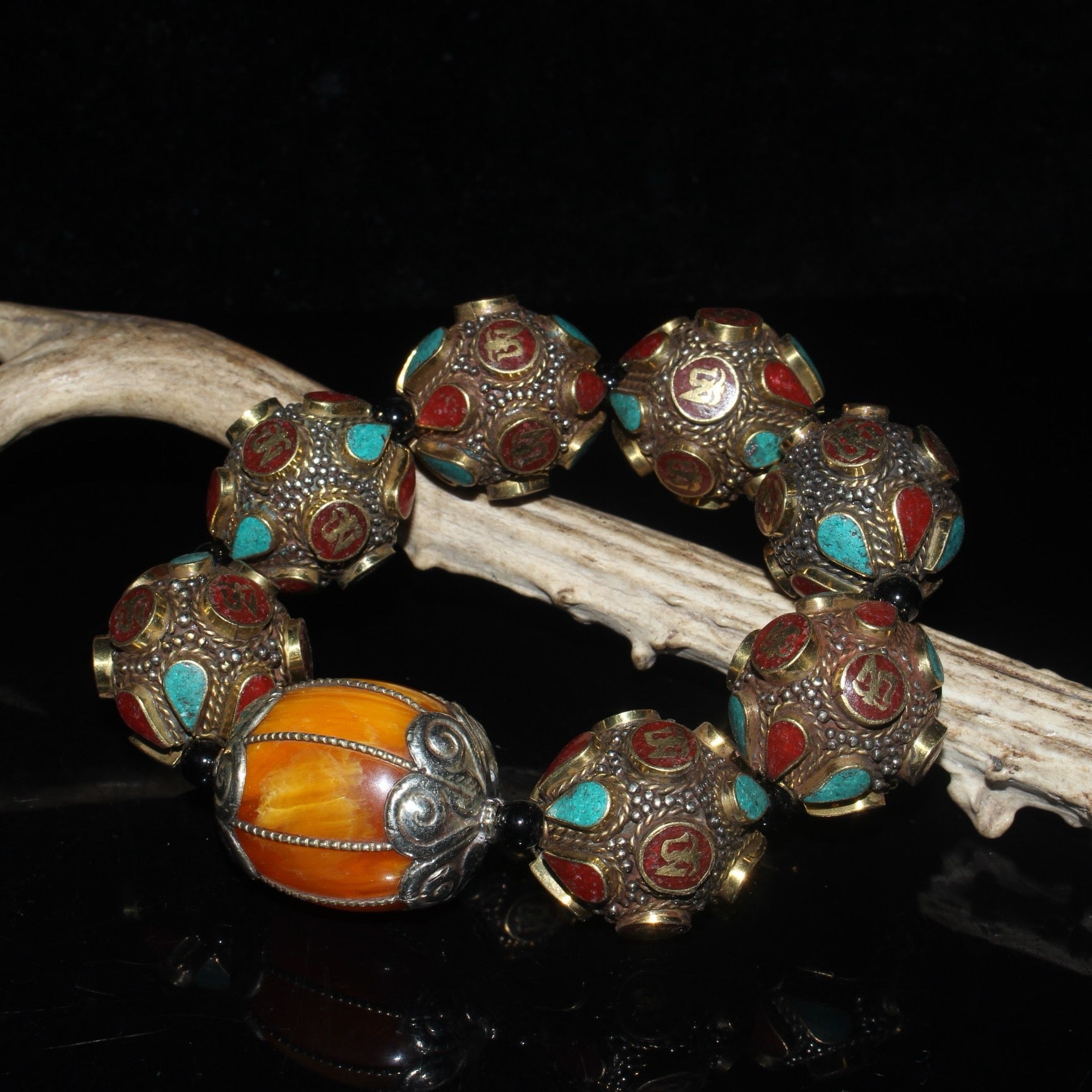 Xizang pure copper inlaid red pine and green pine with wax beads bracelet