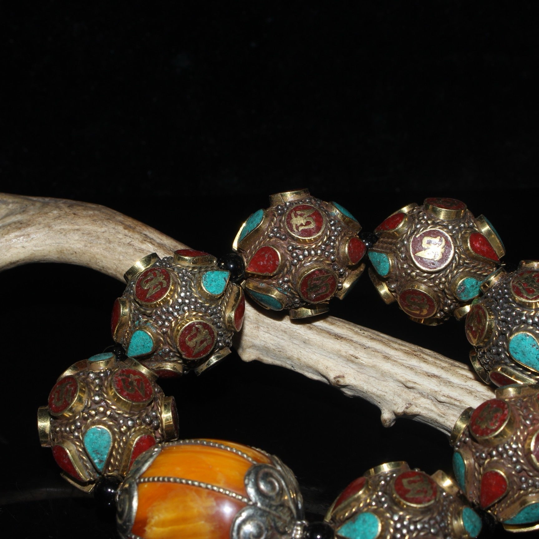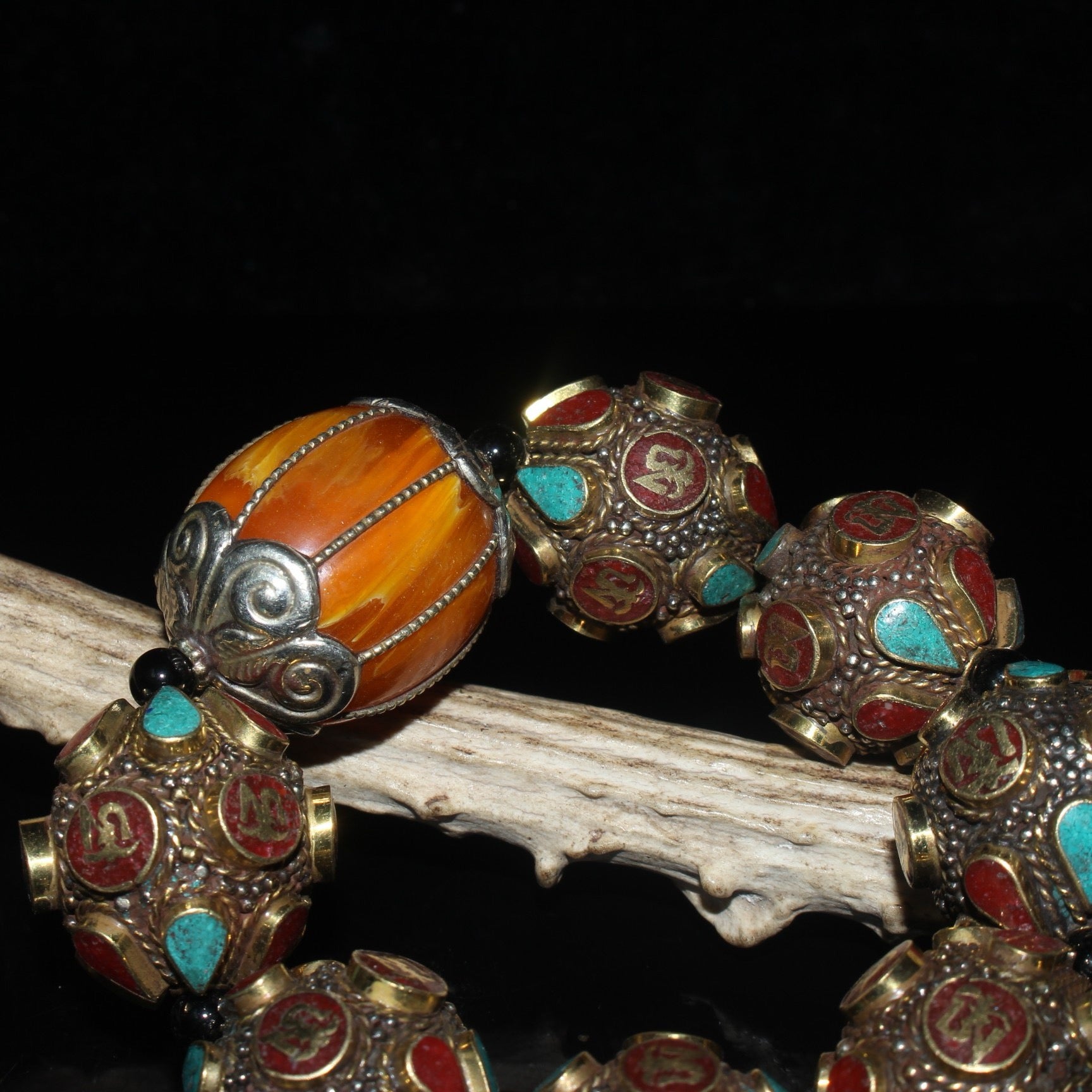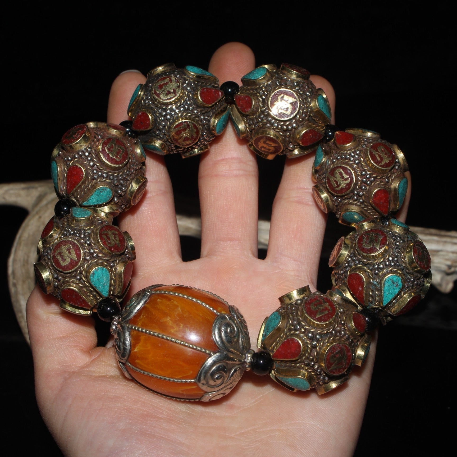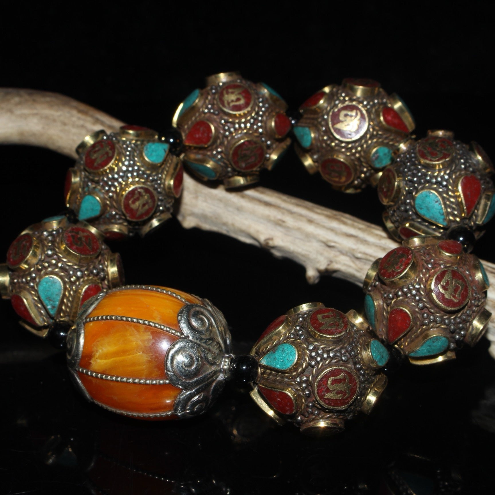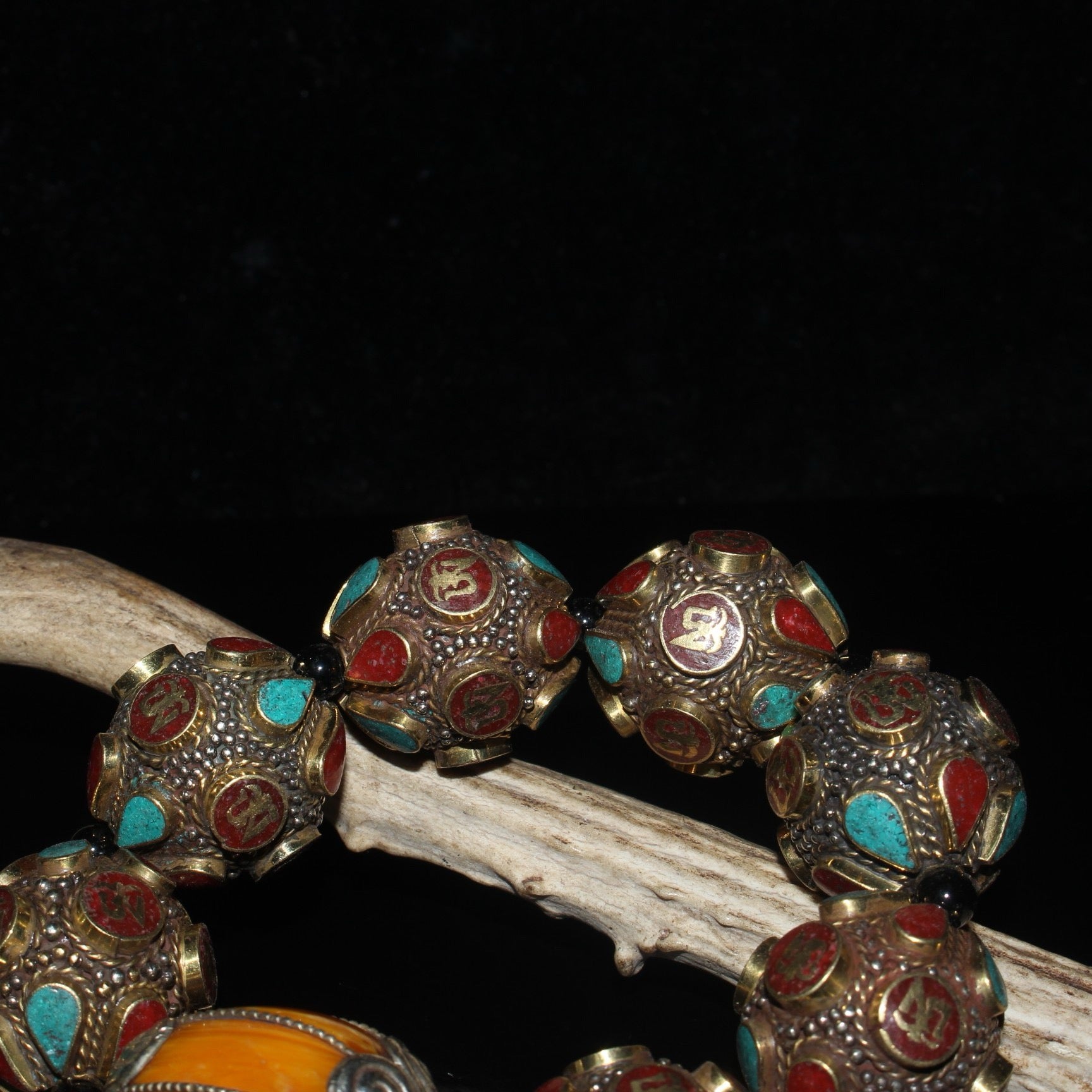 Xizang pure copper inlaid red pine and green pine with wax beads bracelet